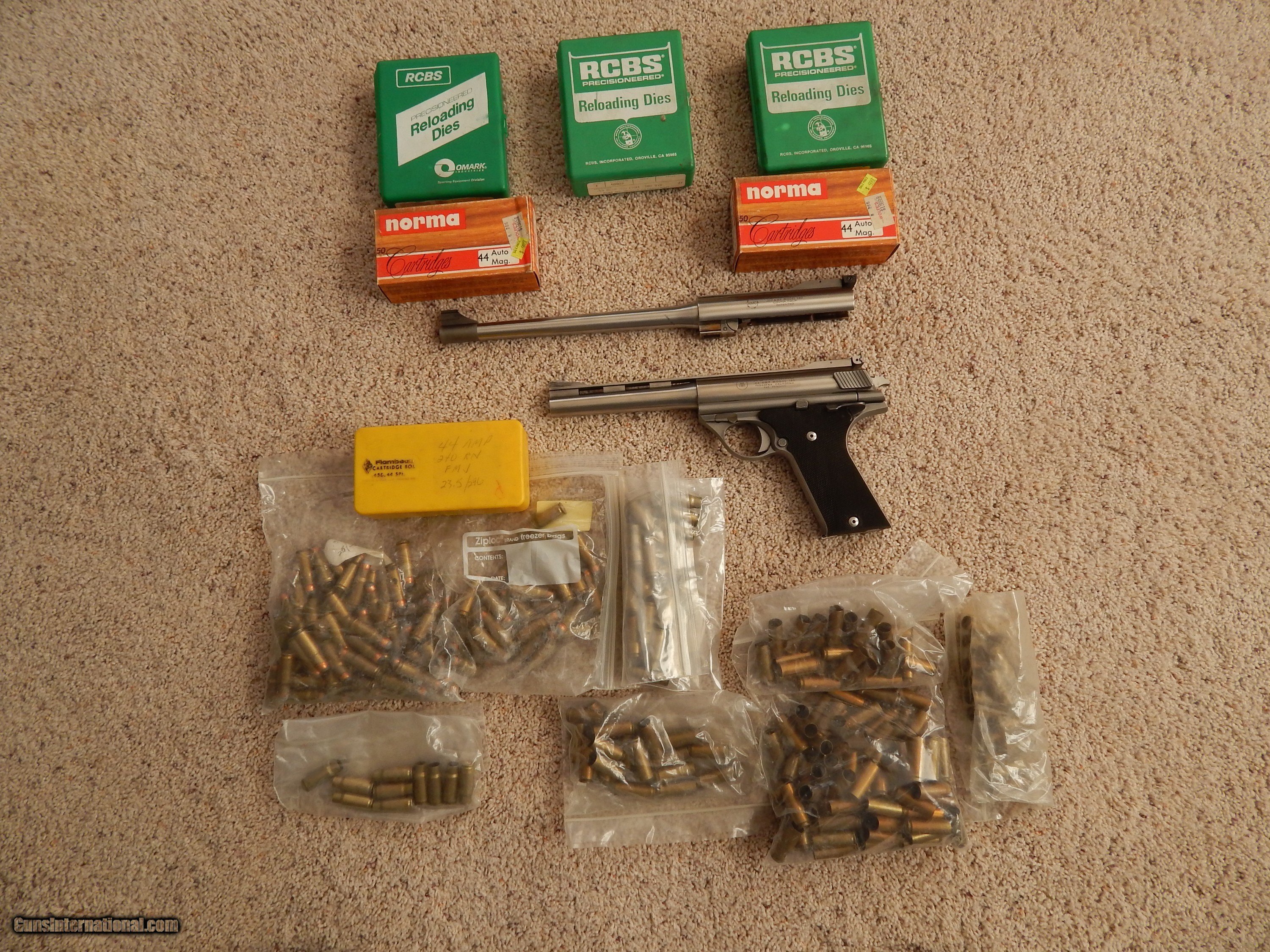 Description: #272 of first production. Both 44 and 357 caliber barrels. Original shipping case. Two boxes of Norma 44 AMP handloads and empty cases, forming dies, reloading dies, and holster. Will consider a reasonable offer. SOLD Handgun Caliber: .357 AutoMag, .44 Auto Mag Manufacturer: Auto Mag Model: Pasadena 180 Serial Number: 272 Condition: Very Good |