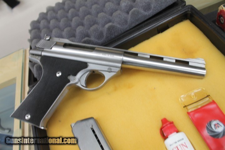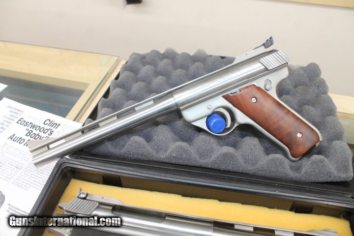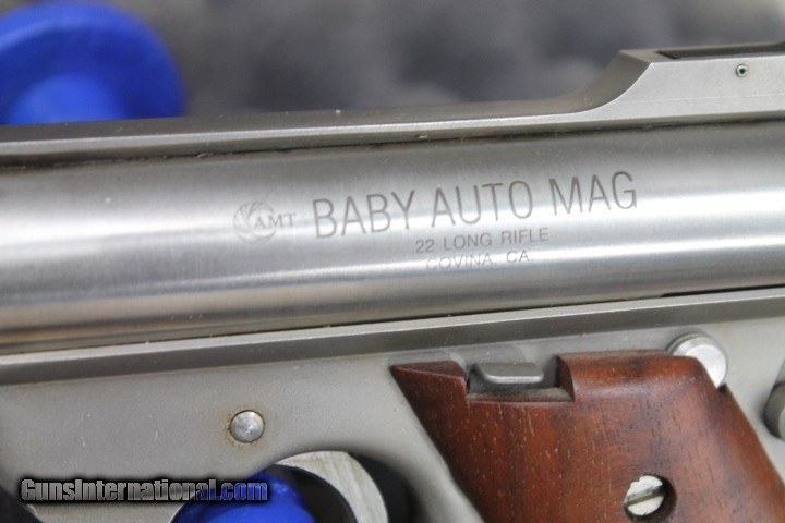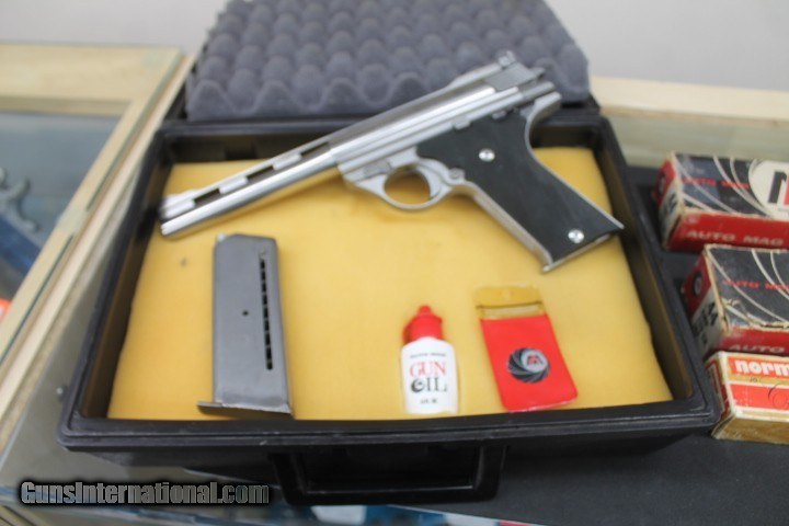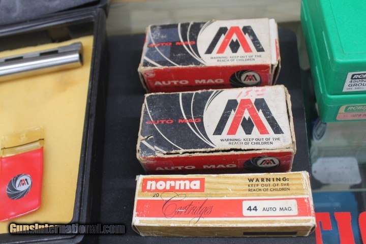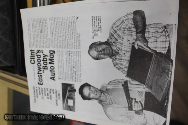 Description: Here is a pair of famous Auto Mag pistols that were made famous by Clint Easwood in the Sudden Imact movies in the 1970's. One is the 44magnum Model 180 (with ammo and dies shown) sold for $5000 in 1975 and the other is the .22LR Baby Magnum (only 1000 were made in a limited edition). WATCH OUR VIDEO ABOUT THIS PAIR OF AUTO MAG PISTOLS ://youtu.be/6miHgvKLRmY Serial numbers are A03563 and BAM0719. Both for one price! Shipping for the pair will be $70 in the continental US. We do not charge you any CC fees. Please call Frank Loane Sr at 410 382 9867 cell for details and to negotiate price. SOLD Handgun Caliber: .22 Long Rifle, .44 Auto Mag Manufacturer: Auto Mag Model: 180/Baby Serial Number: A03563/BAM0719 Barrel Length: 7 Condition: excellent Metal Condition: excellent Wood Condition: excellent Bore Condition: excellent |