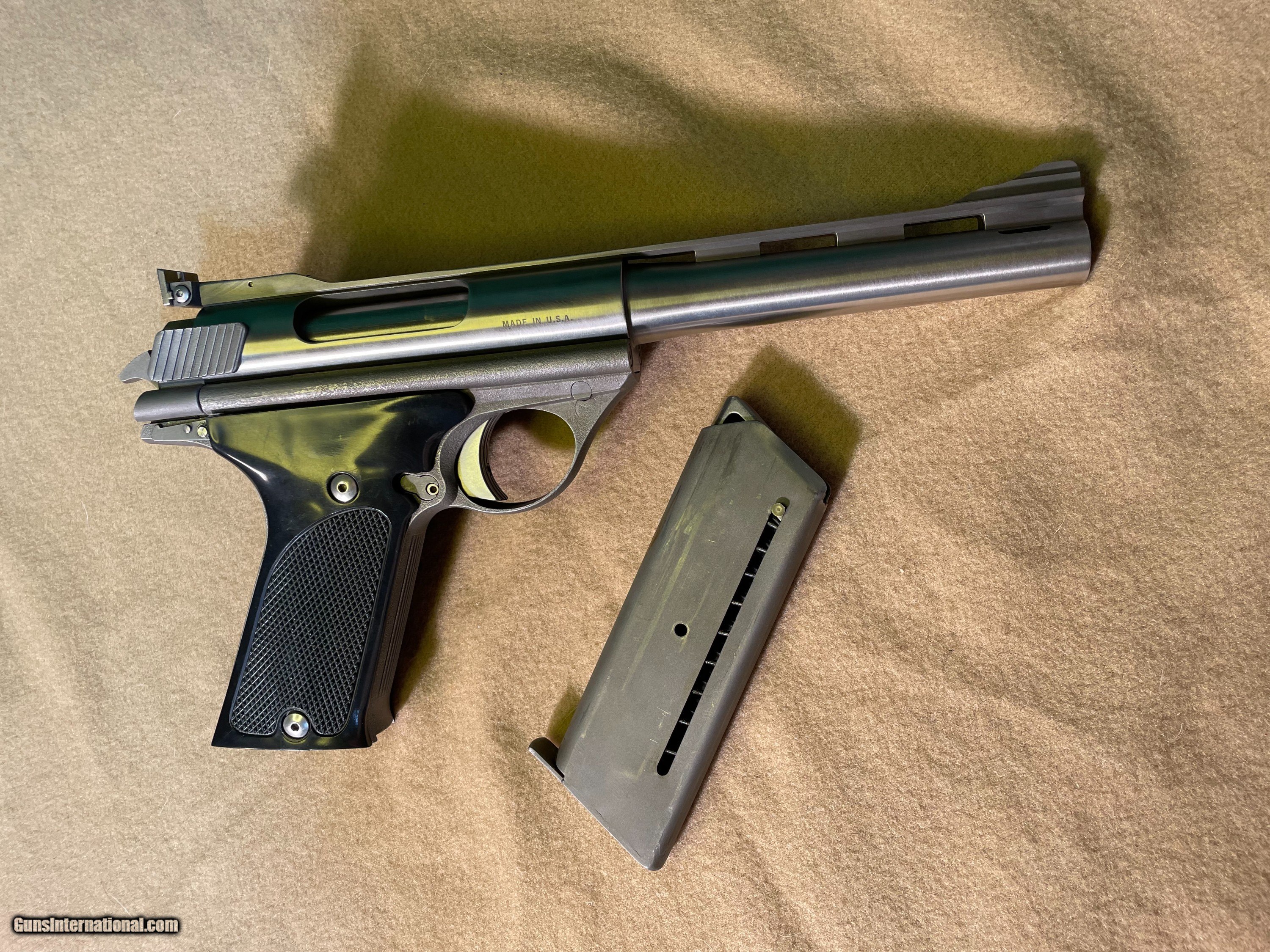 Description: An intriguing semi-auto “cannon”….. in Great Condition (see high resolution photos). A must for any advanced handgun collector. Stainless Steel, sharp rifling, clean bore with no grip cracks. RCBS dies (4 die set of .44 Auto Mag SWC and second set to form .44 AMP brass from .308 Win, 7.62 Nato, 30-06 or .243 brass – extended shell holder, .44 Auto Mag trim die, standard shell holder, and neck reamer). Ammo – reloads 43 ea (Speer 240 gr JSP, 26 gr WW296) in .44 Auto Mag cases and 46 ea (240 gr JSP, 24 gr WW296) .44 Auto Mag from 30-06 brass. Original Auto Mag case. Weight 58.4 oz. Estate Sale. SOLD Handgun Caliber: .44 Auto Mag |
