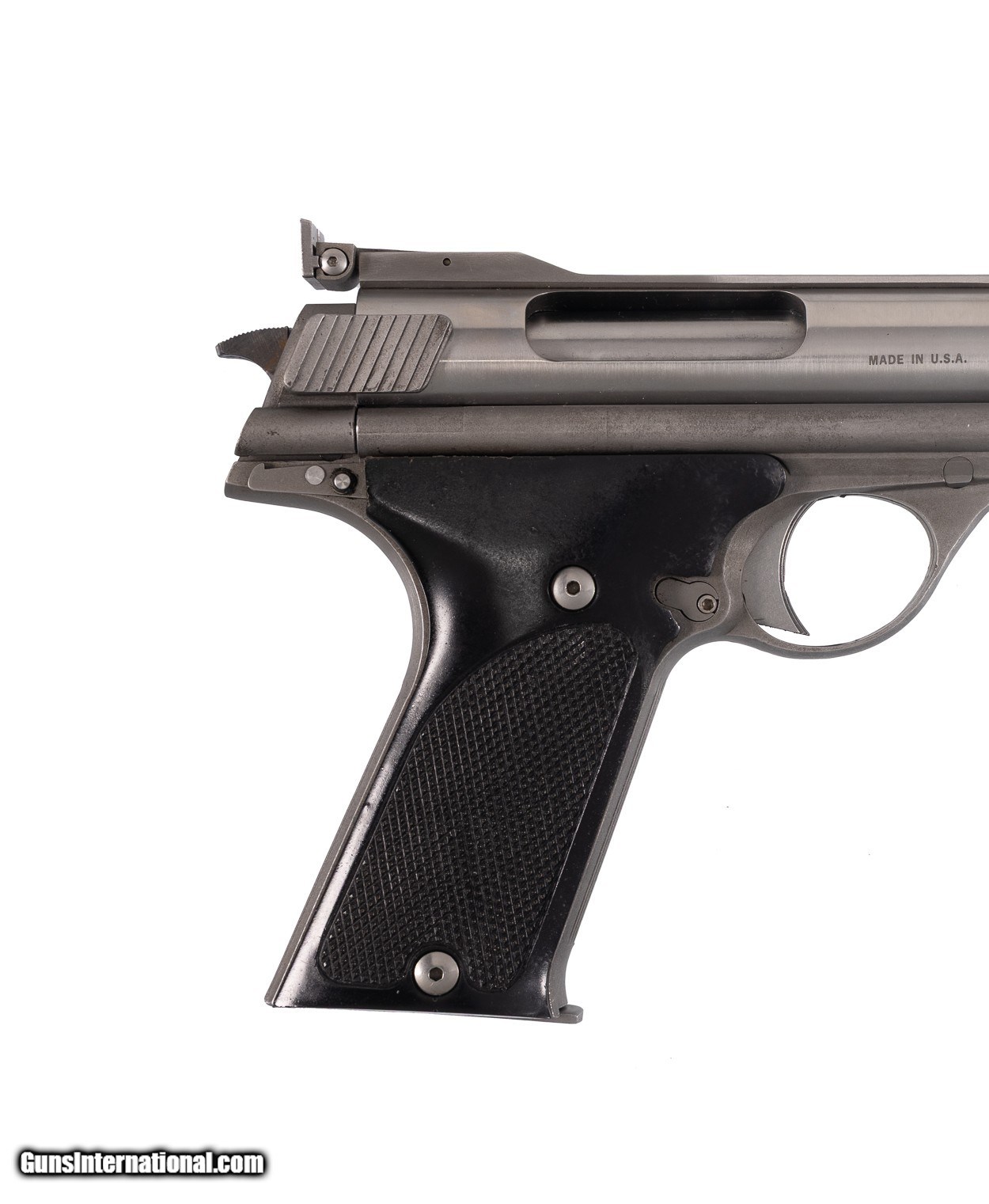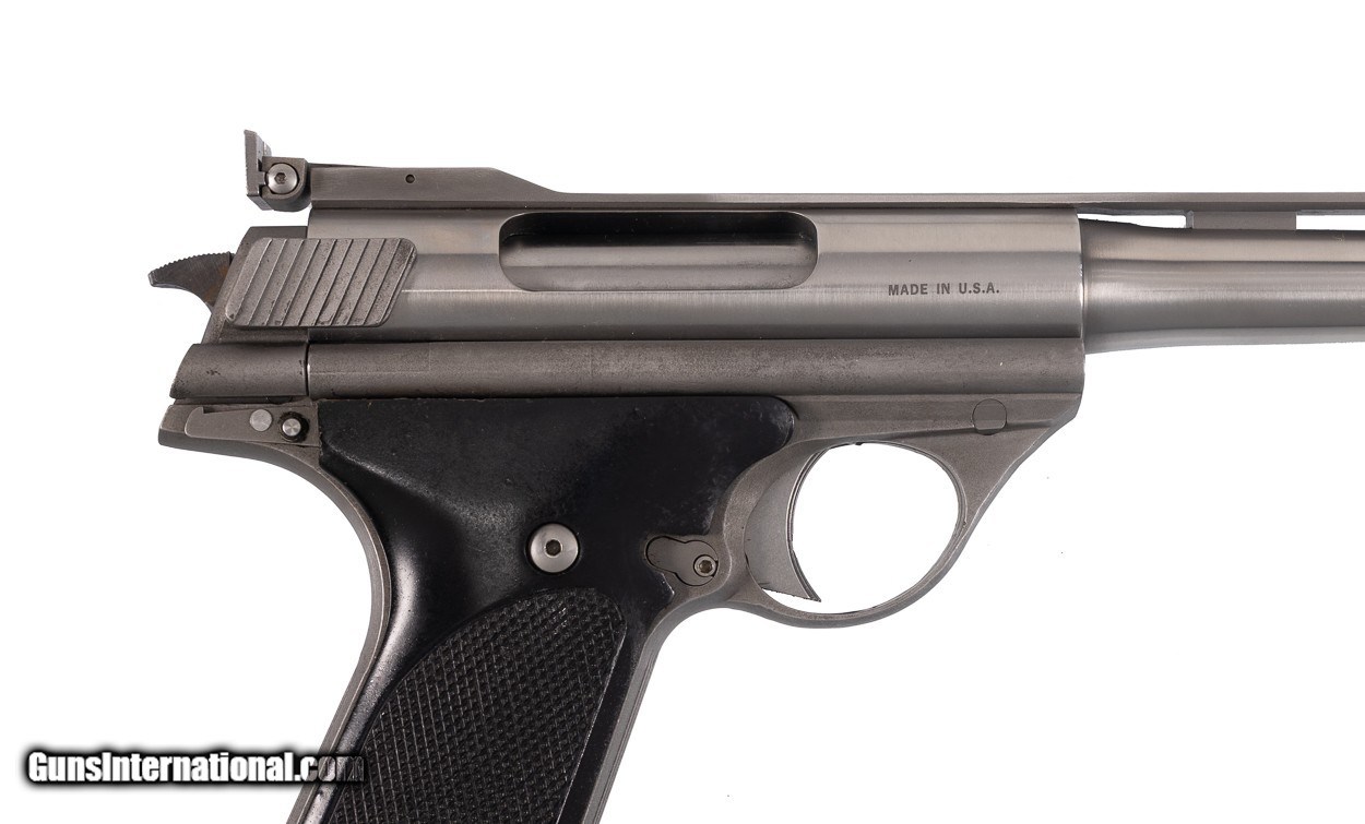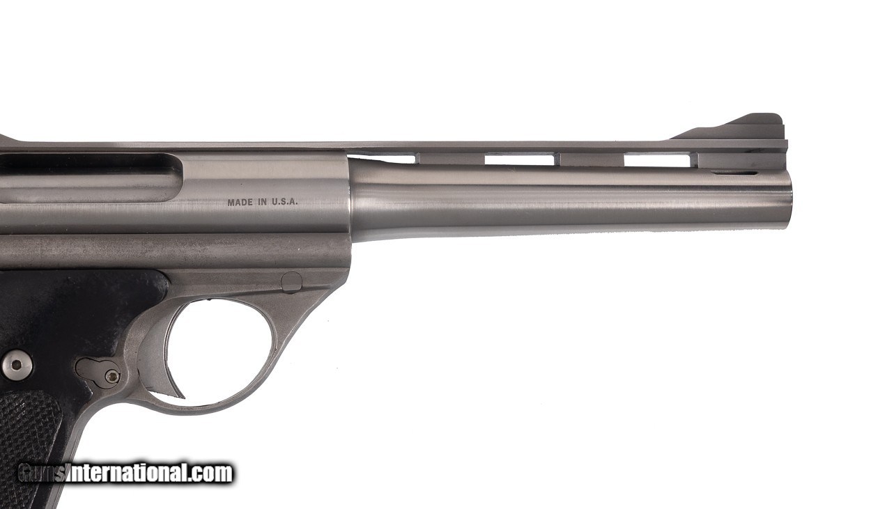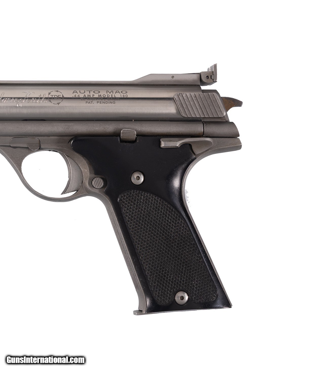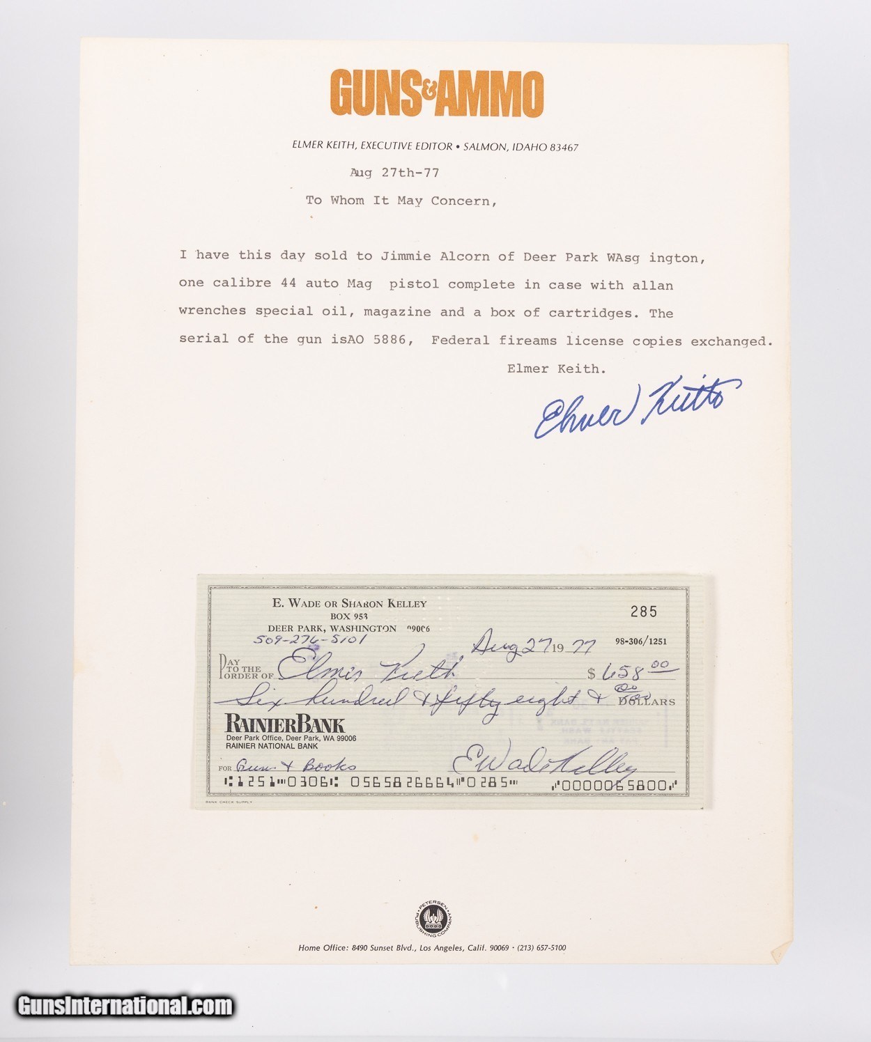 Built in 1975 this awesome .44 Auto Mag was owned by famed shooter, author and Magnum cartridge pioneer, Elmer Keith. The gun is complete in the original hard case with the manual, Elmer Keith’s book ‘Hell I Was There’ along with the original bill of sale on Elmer’s Guns & Ammo letterhead and the original check. Note the check is for ‘Gun & Book’ and the signed letter notes this gun by serial number. Note the gun is engraved with Elmer Keith’s signature on the left side of the frame. Given Elmer Keith’s connection with load development on the .357 Magnum & .44 Magnum it’s no surprise he would have been keenly interested in the most powerful auto-loading handgun of the time. This example remains in near-mint condition from end to end with the stainless steel surfaces rating 99% showing only faint handling and firing evidence. Positively the coolest Auto Mag available this decade for the advanced collector!