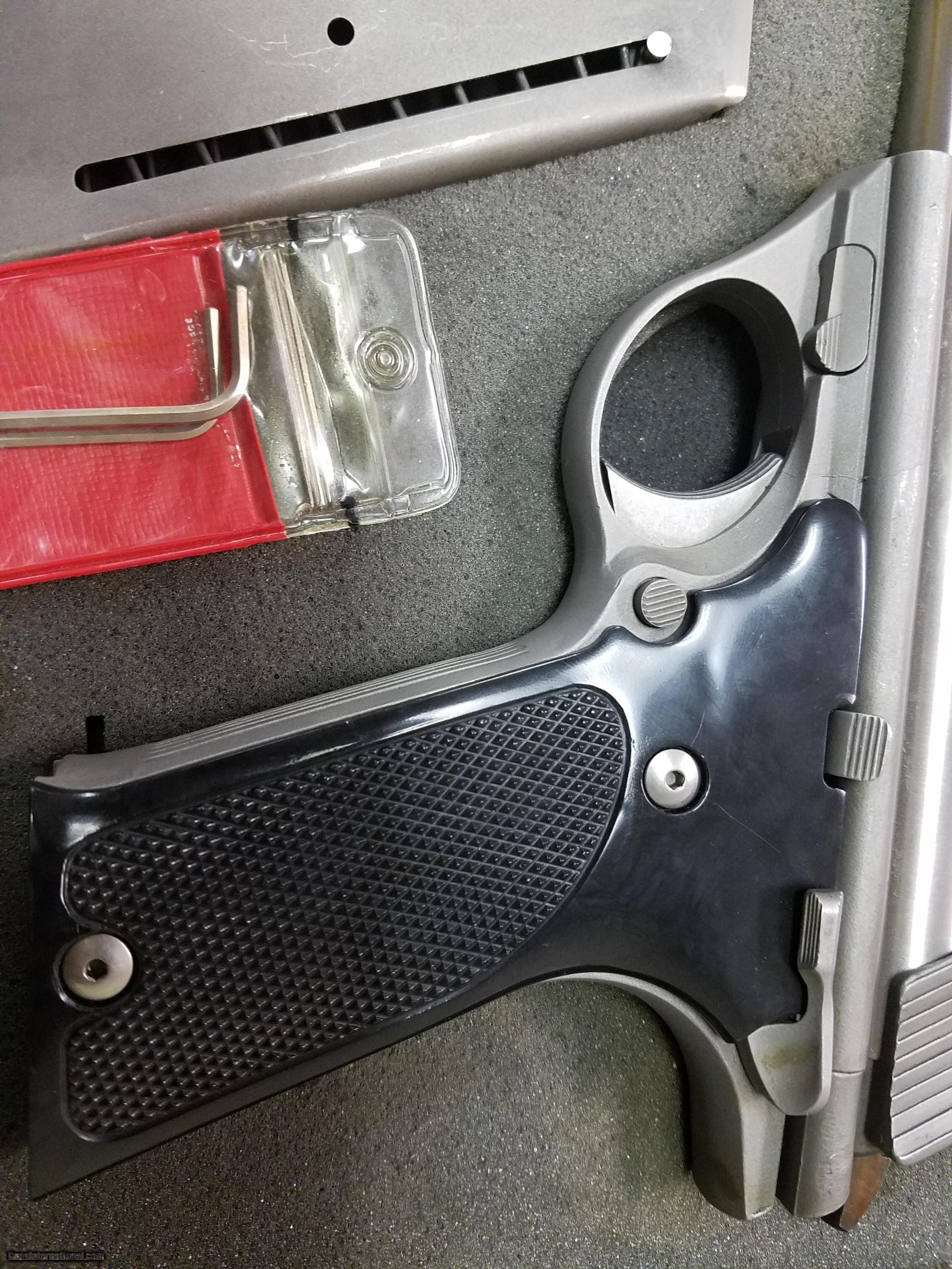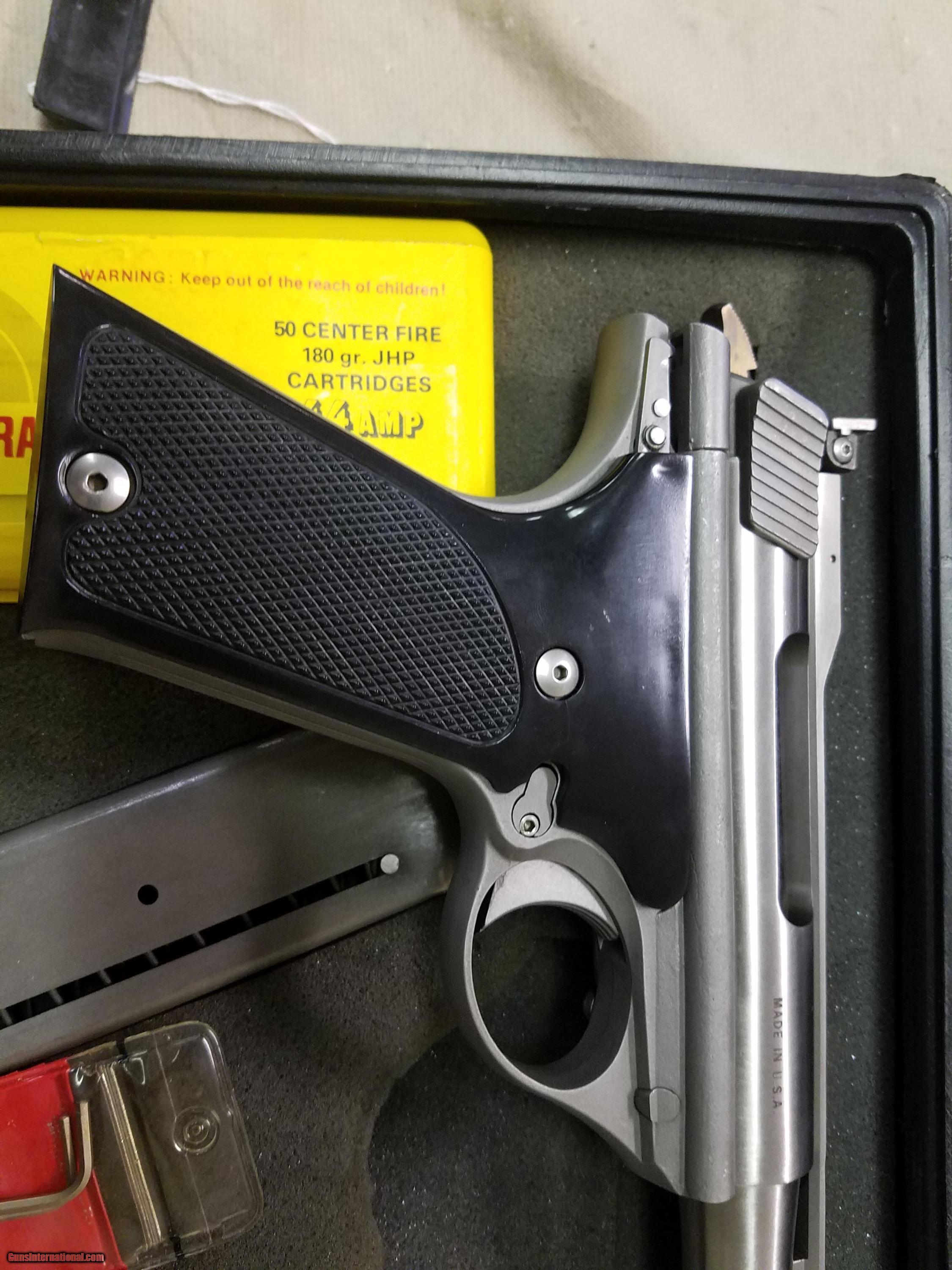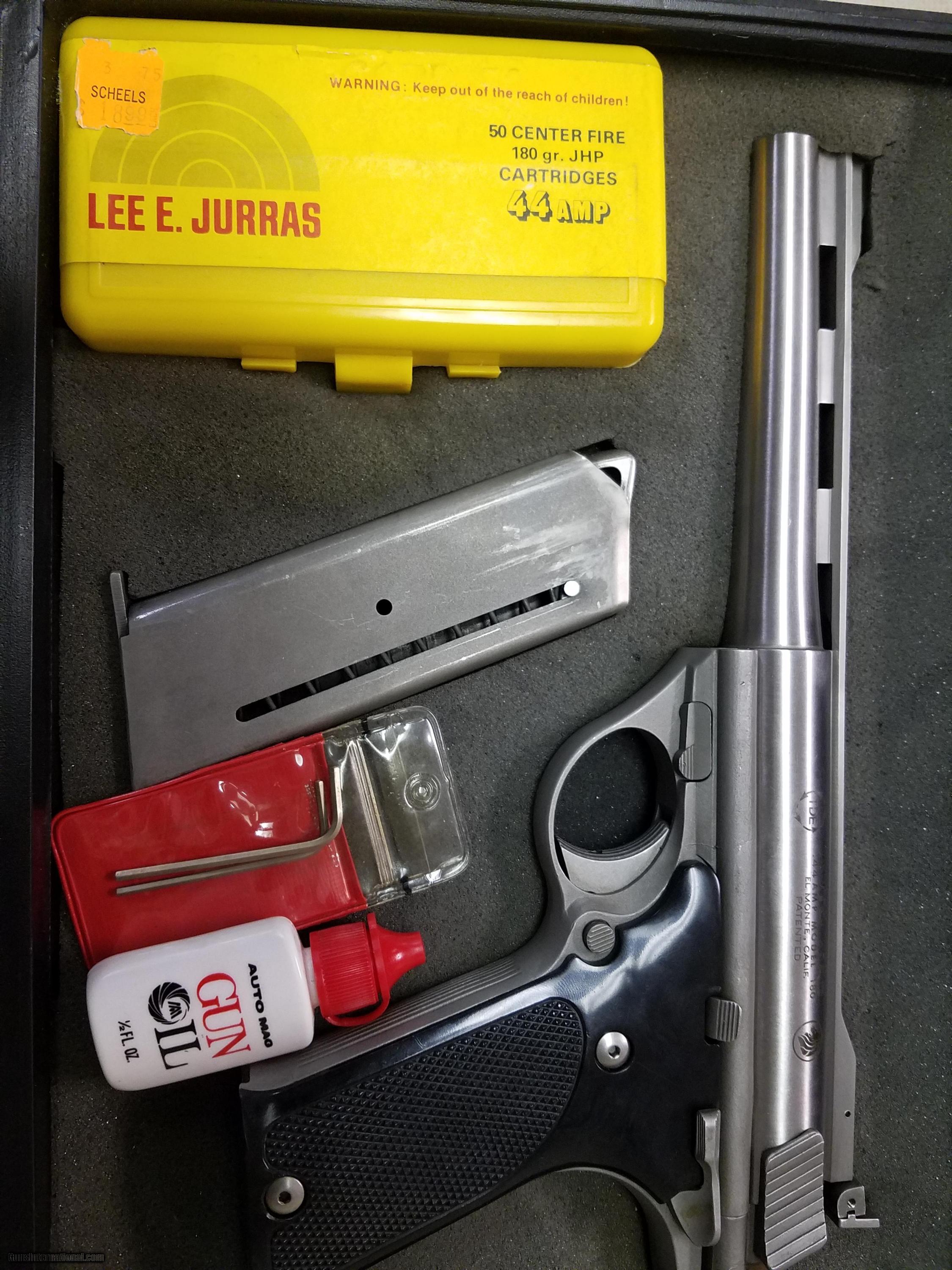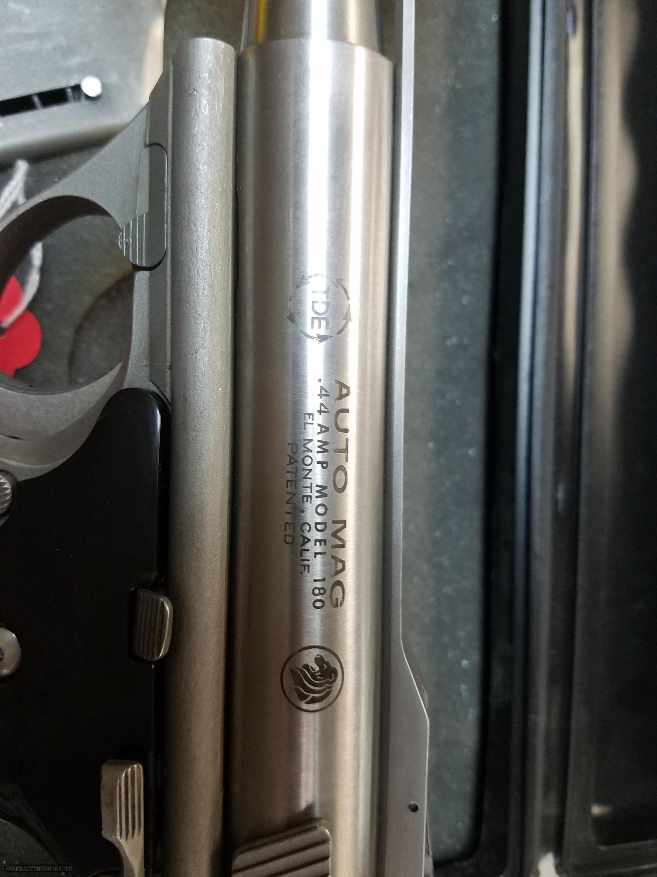 Description: This is a dandy Auto Mag that looks unfired. It comes with the box and everything you see in the photos. The latch on the box is broken but the latch is included. The ammo will need to be shipped by itself so shipping will cost a little more. The price tag on the ammo has a date of 3/75! Give me a shout if you need more questions. Please call or email with any questions. WE TAKE CREDIT CARDS, DEBIT CARDS, MONEY ORDERS, CASHIER CHECKS, OR EVEN PERSONAL CHECKS.........AS LONG AS THEY'RE GOOD! 3% will be added to all charge cards. GUNS WILL BE HELD UNTIL PERSONAL CHECKS CLEAR. GUNS SUBJECT TO PRIOR SALE. There is a $30 shipping charge per gun. Insurance will be extra. Thank you, Darryl Howard SOLD |