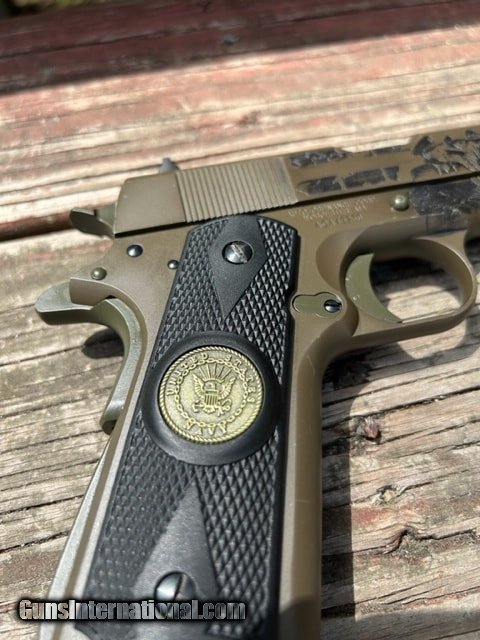 Description: Guns Listing ID: 796472 General Dwight D. Eisenhower, Supreme Commander of Allied Expeditionary Forces, was just one of the great men who led American forces during World War II, and Auto-Ordnance’s “The Generals 1911” proudly commemorates the service of a few of the war’s iconic leaders. As a monument to courage, wisdom and determination, the General’s 1911 D-Day pistol features an engraving on the left side with the image of Gen. Eisenhower speaking with troops at Newbury, England, prior to their embarkation. No one can dispute the popularity and durability of the 1911A1. This pistol was invented by John Browning and placed into production in 1911. One hundred and eight years later, this pistol is still being used by civilians, law enforcement and by some specialized military units. This weapon is prized all over the world. The Model 1911A1 is finished in Cerakote with the slide and frame receiving the Patriot Brown color and all other parts in Olive Drab. The engraving is given contrast with Armor Black Cerakote. Purchase comes with 1 magazine SOLD Manufacturer: AUTO-ORDNANCE Model: 1911 A1 Caliber Info: .45 ACP Condition: Used - Non-Certified Barrels: 5 BARREL Finish: GREEN |