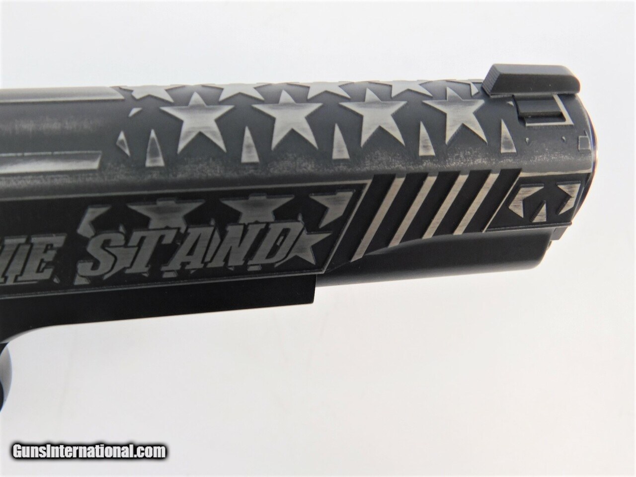 Description: Manufacturer: Auto-Ordnance Model: United We Stand Custom 1911 SKU: Z1911TCAC5 Caliber: .45 ACP / AUTO Capacity: (1) 7 Round Magazine Barrel Length: 5" Match Grade Frame: Stainless Steel Engraved Slide Finish: Black Armor Cerakote Grips: Custom Engraved Aluminum Overall Length: 8.6" Sights: Blade Front, Rear Drift Adjustable for Windage Weight: 2.3 lbs This firearm is being sold as a factory blem or second. There are extremely minor cosmetic imperfections that you will not even know they are there unless you were told where to look. These firearms still carry a full factory warranty, however the warranty does not include any sort of cosmetic issues. The pictures are of the exact firearm you will receive! It is said that a “..house divided against itself will not stand.” This wisdom has been repeated by America’s leaders from the founding of our nation, including by such patriots as Ben Franklin. This belief has never been truer than today, when Americans seem more divided than ever. In these troubled times, Auto-Ordnance calls for Americans to stand together with the new “United We Stand” custom 1911. The slide of this artfully engraved pistol carries the Bible verse Matthew 12:25, saying “Jesus knew their thoughts and said to them ‘every kingdom divided against itself will be ruined, and every city or household divided against itself will not stand’”. The aluminum grips are engraved “In God We Trust”, and depict united hands binding our nation together. The right slide reminds us that “United We Stand”. It was not so very long ago that these words cemented our nation together in the shadow of the 9/11 terror attacks. The United We Stand 1911 starts as a Thompson 1911TC series pistol. This stainless steel 1911 is made entirely in the United States. The finish is Black Armor Cerakote with a clear coating. It features an adjustable trigger, skeletonized hammer, full-length recoil guide rod, extended beavertail grip safety, extended magazine release, and a checkered slide stop lever. The front and rear combat sights are black, low profile. The ejection port is flared to aid in reliable function. Both mainspring housing and front strap are machined checkered at 20 lines per inch. Each pistol’s 5” match grade barrel is chambered in 45 ACP. One 7 round magazine is included. SOLD |