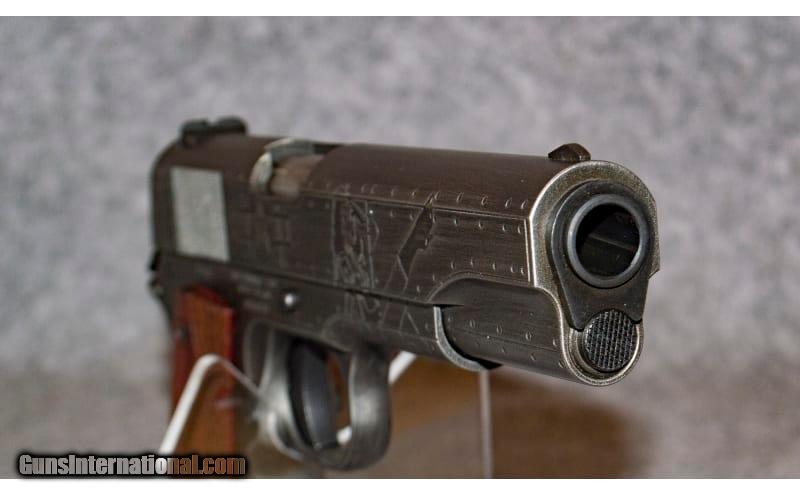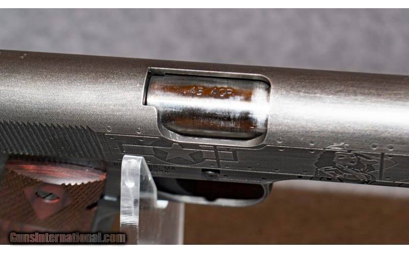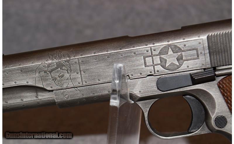 Description: The Victory Girls 1911 was designed to honor the women whose strength drove industry in the US in order to support WWII troops. Their sacrifices and accomplishments will not be forgotten. Beginning with a base 1911A1 GI Model in .45ACP, it has the standard 5" barrel, seven round magazine, and US property logo wood grips. The Victory Girls model was customized with deep cut laser engraving of a pin-up girl on the right side, and an updated "Rosie the Riveter" on the left. It also features the USAAC Star Roundel on both sides of the frame. The pistol is then given a worn look with a two-color Cerakote finish of Armor Black and Gunmetal Grey. Manufactured in limited numbers with manufacture ending in 2019. .45 ACP SOLD Chambers: 1 Metal Condition: Very Good Wood Condition: Very Good Bore Condition: Very Good Barrels: 5 Inch Butt Pad: U.S. Stamped Wood Grips Weight: 2.5 lbs Sights: Fixed steel Item Location: Lone Tree, CO |