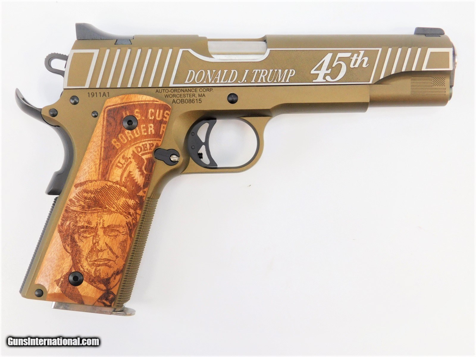 Description: This firearm is factory new in box, direct from the manufacturer or a distributor. All firearms are in stock at the time of this listing being posted, however our inventory can rapidly change. To confirm availability and place an order with us please visit our sight by searching ammoandarmsstore. Once you are there, input the Seller's Inventory # into the serach bar on the top left-hand side of the page. The first product displayed will be the one shown in this listing. Please click on the image of this item and if it is still available, an Add to Cart button will be displayed. If you wish to purchase this firearm please add the item to your cart, and then click on the Check Out box when the green message is displayed. You will then be able to place your entire order online as well as make payment. If the item is no longer in stock, there will be an option to enter your email address to be notified when it is available. Manufacturer: Auto-Ordnance Model: POTUS 1911 SKU: 1911TCAC4 Caliber: .45 ACP / AUTO Capacity: (1) 7 Round Magazine Barrel Length: 5" Match Grade Finish: Cerakote Bronze / Cerakote Clear Grips: Engraved Hogue® Goncalo Wood Grips Overall Length: 8.5" Sights: Front and Rear Dovetail Cut / Low-Profile Iron Sights Weight: 39 oz Kahr Firearms Group and Auto-Ordnance once again honor Donald J. Trump, the 45th President of the United States (POTUS), with a limited edition series .45 caliber Auto-Ordnance 1911 pistol. The POTUS 1911 features the President’s 2020 campaign motto engraved on the left side of the slide, along with his image and the White House. On the right, the slide is engraved with “45th”, and his name. The American Flag is engraved on the dust cover. Beautiful Hogue Goncalo wood grips are engraved with the flag, and an image of President Trump. Slide and frame flats are polished, then finished with super durable Cerakote Bronze covered with Cerakote Clear. Controls are Cerakote Armor Black. The POTUS 1911 starts as an Auto-Ordnance 1911TC series pistol. This stainless steel 1911 is made entirely in the United States. It features an adjustable trigger, skeletonized hammer, full-length recoil guide rod, extended beavertail grip safety, extended magazine release, and a checkered slide stop lever. The front and rear combat sights are black, low profile. The ejection port is flared to aid in reliable function. Both mainspring housing and front strap are machined checkered at 20 lines per inch. Each pistol’s 5” match grade barrel is chambered in 45 ACP. One 7 round magazine is included. KNOW YOUR LOCAL AND STATE LAWS!! ORDERS WILL ONLY BE ACCEPTED FROM US RESIDENTS OF THE LOWER 48 STATES, ALASKA AND HAWAII. OUR FFL CLASS DOES NOT ALLOW FOR THE EXPORT OF FIREARMS, THEREFORE WE CANNOT SHIP OUT OF THE US. IF YOU ARE INTERESTED IN PURCHASING THIS ITEM, PLEASE COMPLETE YOUR ORDER BY REFERRING TO THE "SELLER'S INFORMATION" ABOVE. SOLD Handgun Caliber: .45 ACP (.45 Auto) |