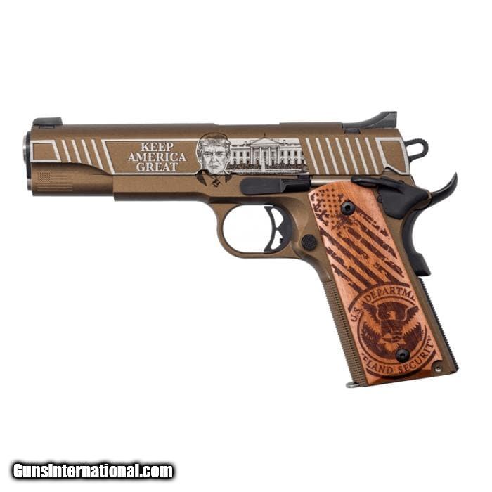 Description: Guns Listing ID: 348399 Kahr Firearms Group and Auto-Ordnance once again honor Donald J. Trump, the 45th President of the United States (POTUS), with a limited edition series .45 caliber Auto-Ordnance 1911 pistol. The POTUS 1911 features the President‚‚s 2020 campaign motto engraved on the left side of the slide, along with his image and the White House. On the right, the slide is engraved with \"45th\", and his name. Beautiful Hogue Goncalo wood grips are engraved with the flag, and an image of President Trump. Slide and frame flats are polished, then finished with super durable Cerakote Bronze covered with Cerakote Clear. Controls are Cerakote Armor Black. - CALIBER .45 ACP - MAGAZINE (1) 7rd capacity - SIGHTS Front Blade, Rear Drift - GRIPS Engraved President Trump Hogue Goncalo Woo SOLD Manufacturer: AUTO-ORDNANCE Model: 1911 PRESIDENT TRUMP Caliber Info: .45 ACP Condition: new Barrels: 5" barrel Finish: BRONZE |