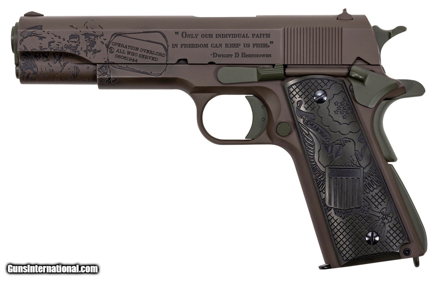 Description: Guns Listing ID: 445831 To honor their service and leadership in our nations time of need, Auto-Ordnance introduces The General 1911 commemorative D-Day 75th Anniversary pistol. Engraved on the left side of the pistol is the iconic image of General Dwight D. Eisenhower, speaking to his men prior to the start of Operation Overlord. His insightful words, Only our individual faith in freedom can keep us free are engraved on the slide. The right side features the image of General Omar Bradley, Admiral Alan Kirk, a battle worn American Flag, and D-Day 75th Anniversary commemorative emblem. An Army eagle badge is engraved on both sides of the grips. The finish is super durable Cerakote in Patriot Brown, with Olive Drab controls and Armor Black engraving. These guns start as the GI Model 1911, made entirely in the United States. It features a 5 barrel, GI sights, and is chambered in .45 ACP. One seven round magazine is included. SOLD Manufacturer: AUTO-ORDNANCE Model: 1911 THE GENERAL Caliber Info: .45 ACP Condition: new Barrels: 5 BARREL |