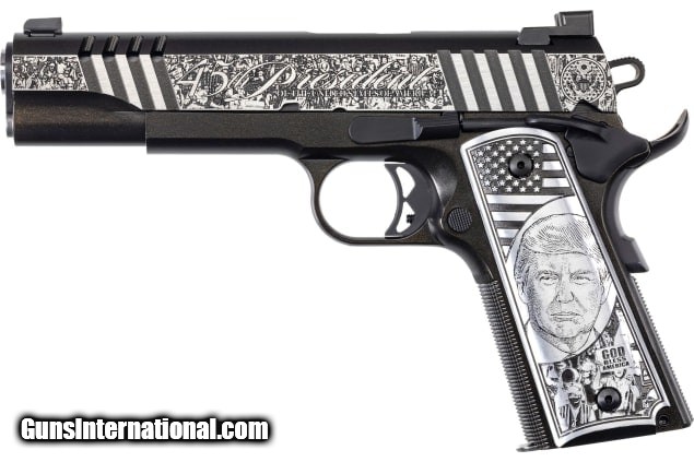 Description: Guns Listing ID: 420333 Trump \"Rally Cry\" 1911, Stainless Steel frame and slide, checkered frontstrap, .45 cal, 5\" barrel, aluminum engraved grips, slide and grip is custom engraved with actual Trump rally scenes, \"45th President\" and \"Donald J Trump\", finished in black Cerakote with gold flakes and a clear ceramic coating, night sights. Ships with one 7 rd stainless steel magazine SOLD Manufacturer: AUTO-ORDNANCE Model: 1911 Trump "Rally Cry Caliber Info: .45 ACP Condition: new Barrels: 5" barrel Finish: BLACK CERAKOTE |