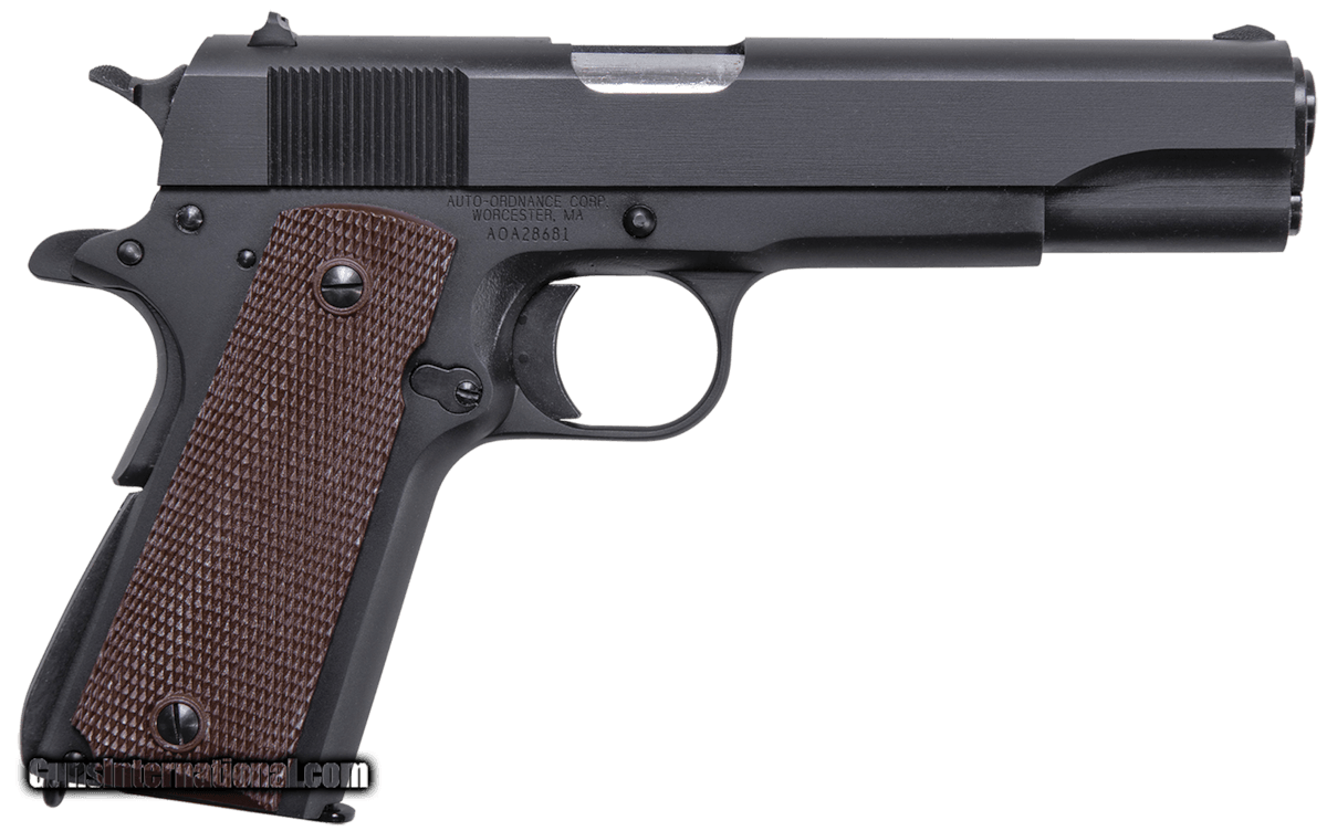 Description: Guns Listing ID: 48886 The Auto-Ordnance 1911A1 is a semi-automatic pistol chambered in 45 ACP. A 5 barrel is complemented by a blade front sight and a drift-adjustable rear sight. This pistol is available with brown checkered grips in either wood or plastic form. The Auto-Ordnance 1911A1 also features both a thumb and grip safety. Details Action SA - Caliber .45 ACP - Capacity 7rd - Barrel 5 - Sights Drift Adjustable Rear Blade Front - Receiver Steel Matte Black - Slide Steel Matte Black - Grips Plastic Brown - Safety Thumb Safety Grip Safety Firing Pin Block - Length 8.5 - Weight 39oz - Series 80 SOLD Manufacturer: AUTO-ORDNANCE Model: 1911 Caliber Info: .45 ACP Condition: new Barrels: 5" barrel |
