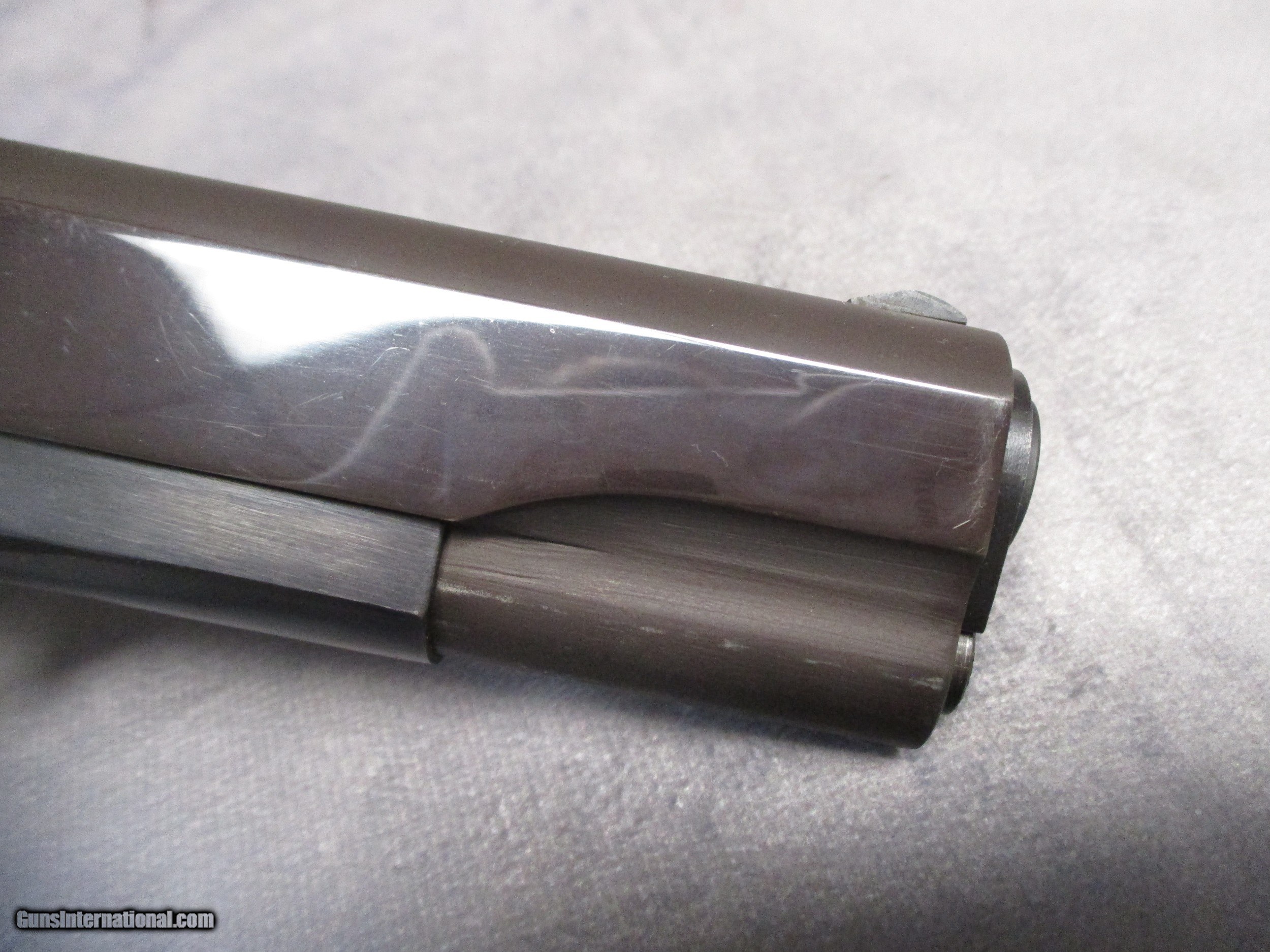 Description: The Model 1911 is perhaps the most famous semi-automatic pistol ever made having a long and successful carrier in both military and civilian use. The 1911 and its cartridge, the famous .45 ACP, were designed by John Moses Browning to fulfill a requirement by the U.S. Army for a new service pistol which would also become the first semi-automatic to be officially adopted by the U.S. Army, replacing the M1909 revolver in .45 Colt in service. The 1911 proved to be one of the most reliable and durable semi-automatic pistols ever designed, successfully serving the U.S. Armed Forces through World War I, World War II, Korea, and Vietnam. This pistol is a special Auto-Ordnance model intended to commemorate America’s participation in World War II. One the left side of the slide the pistol is engraved with the words, “World War II Commemorative M1911A1 .45”. Below this are listed the three theaters the U.S. fought in – the European Theater of Operations (ETO), the Pacific Theater of Operations (PTO), and the China-Burma-India Theater of Operations (CBI). Also engraved on the left side of the slide are three sets of four stars and the Great Seal of the United States. The right side is not engraved which makes sense as the pistol was intended to sit in a display case. The smooth walnut grips feature medallions which feature the phrase “In Honor of World War II Victory”. The grip screws, trigger, hammer, safety, slide lock, and magazine release are plated in gold leaf. The pistol is in excellent condition overall, but exhibits some wear. The sides and bottom of the slide exhibit friction wear in the finish but the chamber and bore are extremely clean. The gold leaf on the hammer is also intact, so it is difficult to say with certainty whether this pistol has been fired since leaving the factory. Most likely the slide the slide was simply wracked a few times with the resultant wear shown in the pictures. This is usually where the first bit of wear appears on a pistol. There is also a slight bit of wear in the finish near the front of the slide right at the edge of the muzzle. The right hand grip panel has a spot were the finish has worn or flaked away. The magazine is a Colt product which oddly, has been drilled and tapped in two spots on the floor plate. The only reason that something like this would be done is presumably to attach some sort of rubber bottom attachment like those seen on Willson Combat magazines. A replacement magazine from Auto-Ordnance would fix the issue. The glass display case is nice but the padding and felt are not built for this pistol. The padding is too thick and leaves the pistol in contact with the glass. As can be seen, the display case also includes seven “silver” cartridges. These are of course dummy rounds intended for display only. The World War II commemorative pistol is somewhat rare. Some gun value books do not even list it. SOLD Handgun Caliber: .45 ACP (.45 Auto) Manufacturer: Auto-Ordnance Model: M1911A WWII Commemorative Serial Number: AOA01132 Bore: Rifled Condition: Excellent Action: Single-Action Triggers: GI style, short, serrated Stock: Walnut with medallions Finish: Blued, Gold Leaf Sights: Fixed – Blade front, rear drift adjustable for windage, sight radius 6.5 inches (165 mm) Engraving: Gold Inlay Case: Display Case |