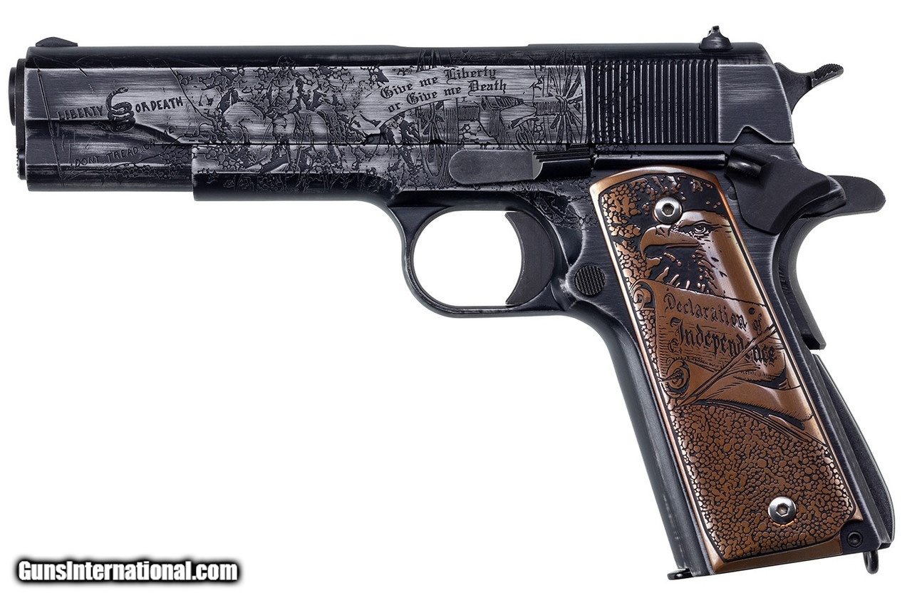 Description: Manufacturer: Auto Ordnance Model: Revolution Custom 1911 SKU: 1911BKOC7 Caliber: .45 ACP Capacity: 7 Rounds Barrel: 5" Finish: Distressed Cerakote Midnight Blue covered with Matte Clear Frame: Engraved with historical artwork paying tribute to the brave men who lead our nation during its struggle for independence. Grips: Solid Copper Grips with an Eagle and the Declaration of Independence on the left panel, and the Liberty Bell on the right panel. Overall Length: 8.6" Sights: Blade Front, Rear Drift Adjustable for Windage Weight: 39 oz All items are factory new in box unless otherwise stated. Based on the information available to us, the above specifications describe this item to the best of our knowledge. For further information, please contact or visit the manufacturer's . SOLD |