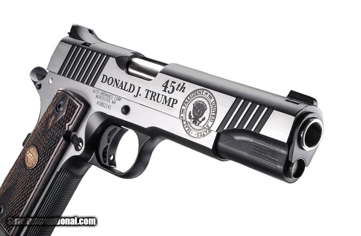 Description: BRAND NEW IN THE BOX AND READY TO SHIP! BUY IT NOW!! Manufacturer: Auto-Ordnance Model: "Trump 45" 1911 SKU: 1911TCAC1 Caliber: .45 ACP Capacity: (1) 7 Round Magazine Barrel Length: 5" Match Grade Slide and Frame: Stainless Steel, Engraved Grips: Checkered Laminate Grips with Medallion Overall Length: 8.5" Sights: Front and Rear Dovetail Cut / Low-Profile Iron Sights Weight: 39 oz With the election of President Donald J. Trump, the United States had its 45th president. With the invention of the 1911, the United States had its legendary .45 caliber pistol. It is only fitting that these two icons should be combined, in the “Trump 45” commemorative 1911 pistol. President Trump has voiced strong support for the Second Amendment, speaking at the NRA conventions, and promising to defend the Right to Keep and Bear Arms with a determination that has not been seen in the White House for decades. Kahr Firearms Group extends our thanks to the President for his staunch defense of American shooters with this special edition 1911. Together we will work to make America great again! The “Trump 1911” starts as a 5” Thompson Custom 1911, chambered in .45 ACP. Its slide and frame are stainless steel, with Thompson medallion inlaid wood grips. The pistol features combat sights, full length guide rod, high sweep beavertail, skeletonized trigger, checkered front strap, and match grade barrel. Engraved on the right side is “Donald J. Trump” with the number 45, and the Seal of the President of the United States. On the left side is a picture of President Trump, the White House, and his slogan “Make America Great Again”. The United States flag is engraved on both sides of the dust cover. KNOW YOUR LOCAL AND STATE LAWS!! ORDERS WILL ONLY BE ACCEPTED FROM US RESIDENTS OF THE LOWER 48 STATES, ALASKA AND HAWAII. OUR FFL CLASS DOES NOT ALLOW FOR THE EXPORT OF FIREARMS, THEREFORE WE CANNOT SHIP OUT OF THE US. IF YOU ARE INTERESTED IN PURCHASING THIS ITEM, PLEASE COMPLETE YOUR ORDER BY REFERRING TO THE "SELLER'S INFORMATION" ABOVE. SOLD Handgun Caliber: .45 ACP (.45 Auto) |