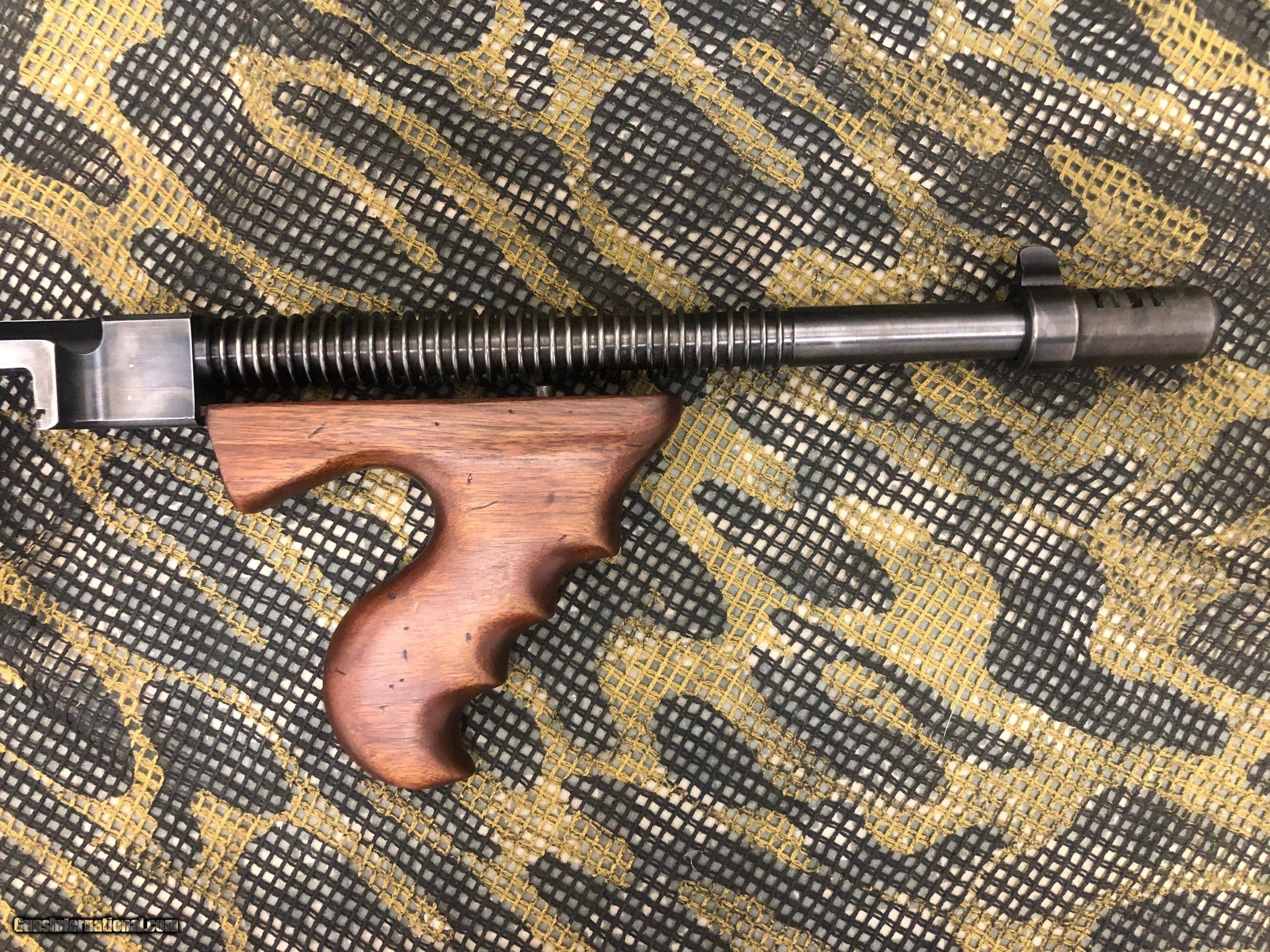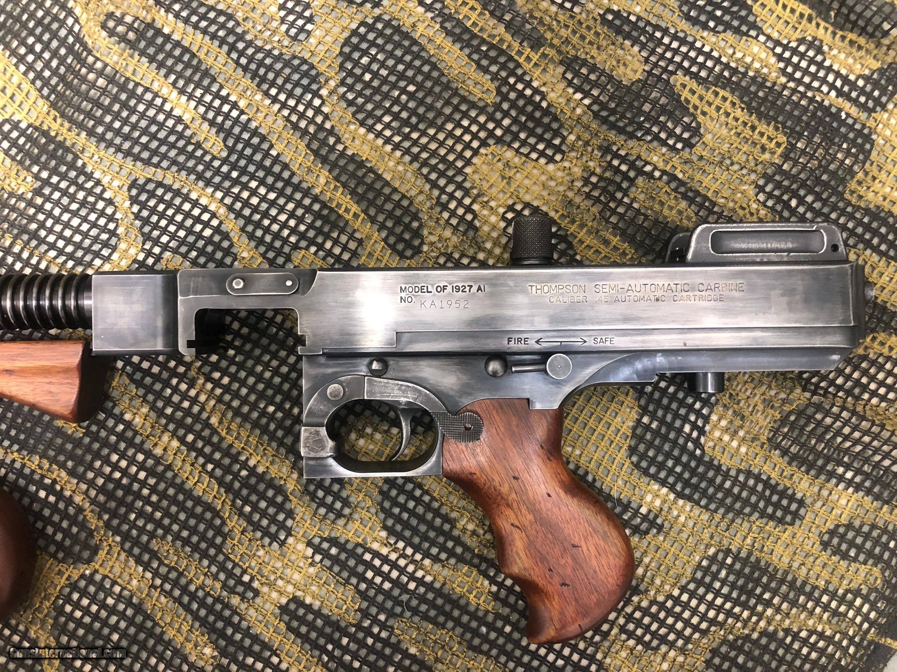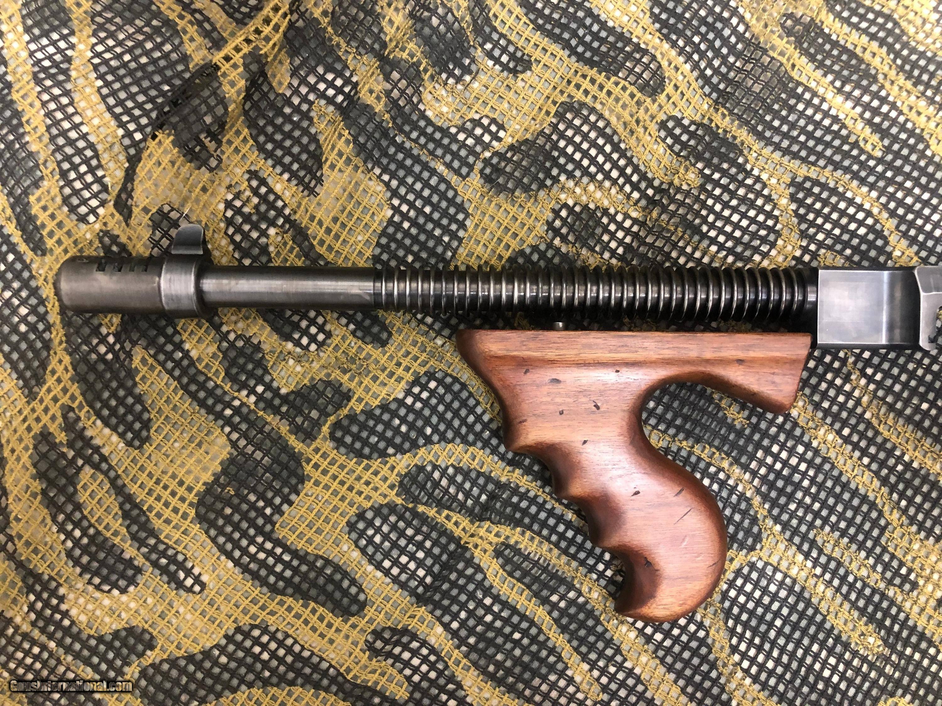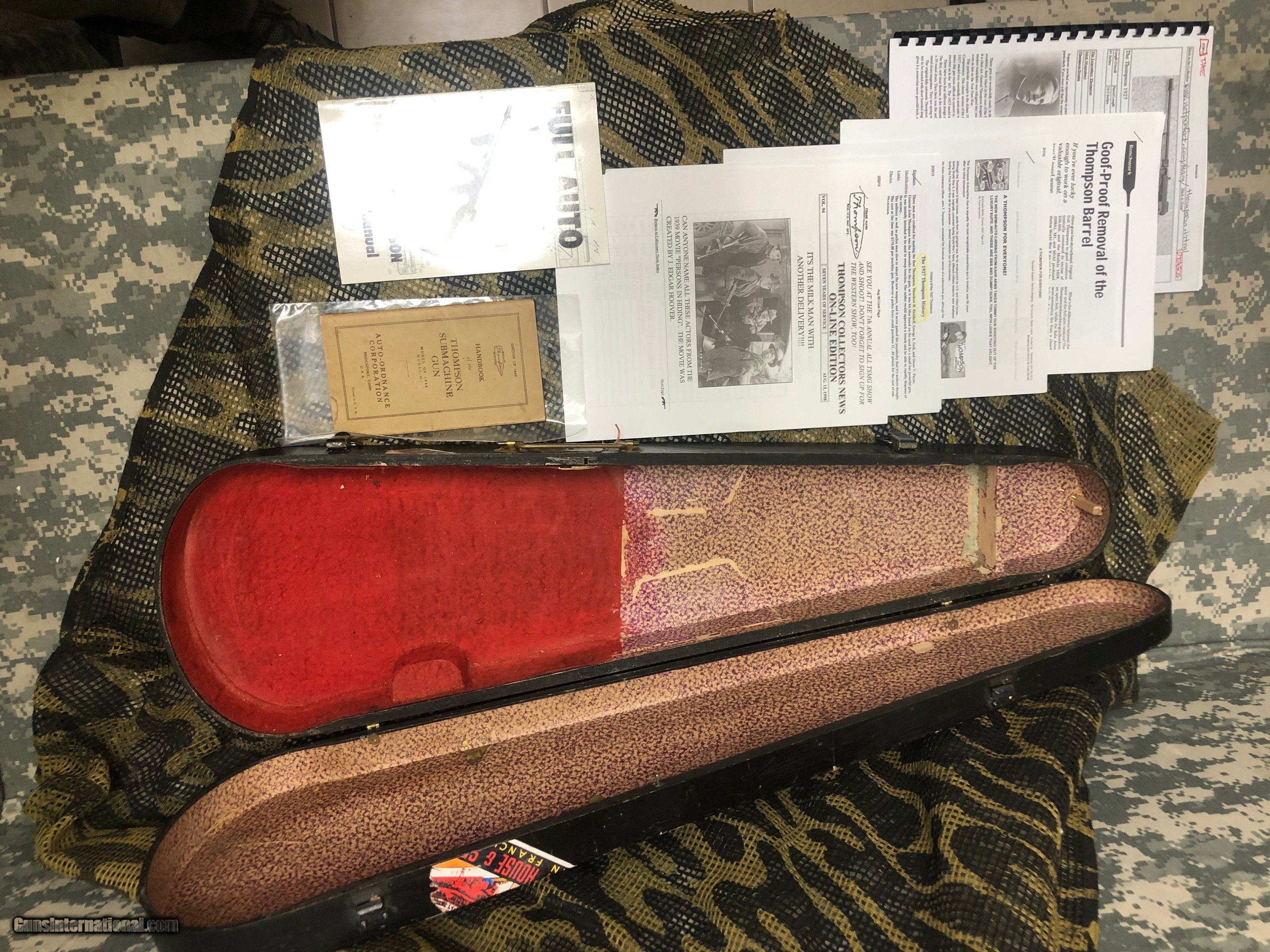 Description: Semi-Automatic Model of 1927-A1 in pistol configuration with finned 13 3/4" barrel (measured with compensator in place) and foregrip with finger grooves. Reciever has Thompson logo on top and Auto-Ordinance Corportation -Worcester MA on side, serial number has KA prefix (Owners manual is from Kahr Arms so post 1999 manufacture). Steel receiver will accept stick and drum magazines. We believe the metal condition to be 60% as the receiver finish has been worn by aggressive cleaning although the barrel finish is 90%. Also included are: Magazines: one 50 round drum magazine, three 30 round stick magazines (stamped: US - 30 Cartridge - CAL 45), four 30 round stick magazines (stamped: The Seymory Products Co), three 20 round stick magazines (stamped: SW - CO), one 30 round stick magazines (stamped: The Crosby Co), Accessories: Violin case (similar to factory accessory but from a real violin), hand made wooden case with green velvet interior (similar to factory accessory), Owners Manual, Parts & Accessories pamphlet, vintage "Handbook of the Thompson Submachine Gun" by Auto-Ordnance Corporation edition of 1940, booklet titled "Full Auto Volume Four Semi-Auto Thompson Modification Manual" by Desert Publications, multiple pages of previous owners internet research, flat blade screwdriver, movie poster of Machine Gun Kelly starring Charles Bronson Additional Parts: 16 3/8" smooth barrel, buttstock complete with all metal and sling, horizontal fore grip YOU are responsible for your compliance with Federal, State and Local Laws. 3% lost cash discount fee for credit card purchases. $125 for our standard shipping, add $20 for insurance. SOLD Handgun Caliber: .45 ACP (.45 Auto) Manufacturer: Karh Arms, Auto-Ordnance Thompson Model: 1927 A-1 Serial Number: KA1952 Barrel Length: 13 3/4 Condition: 70% Metal Condition: 60% Wood Condition: 90% Bore Condition: Bright and shiny Action: blowback |