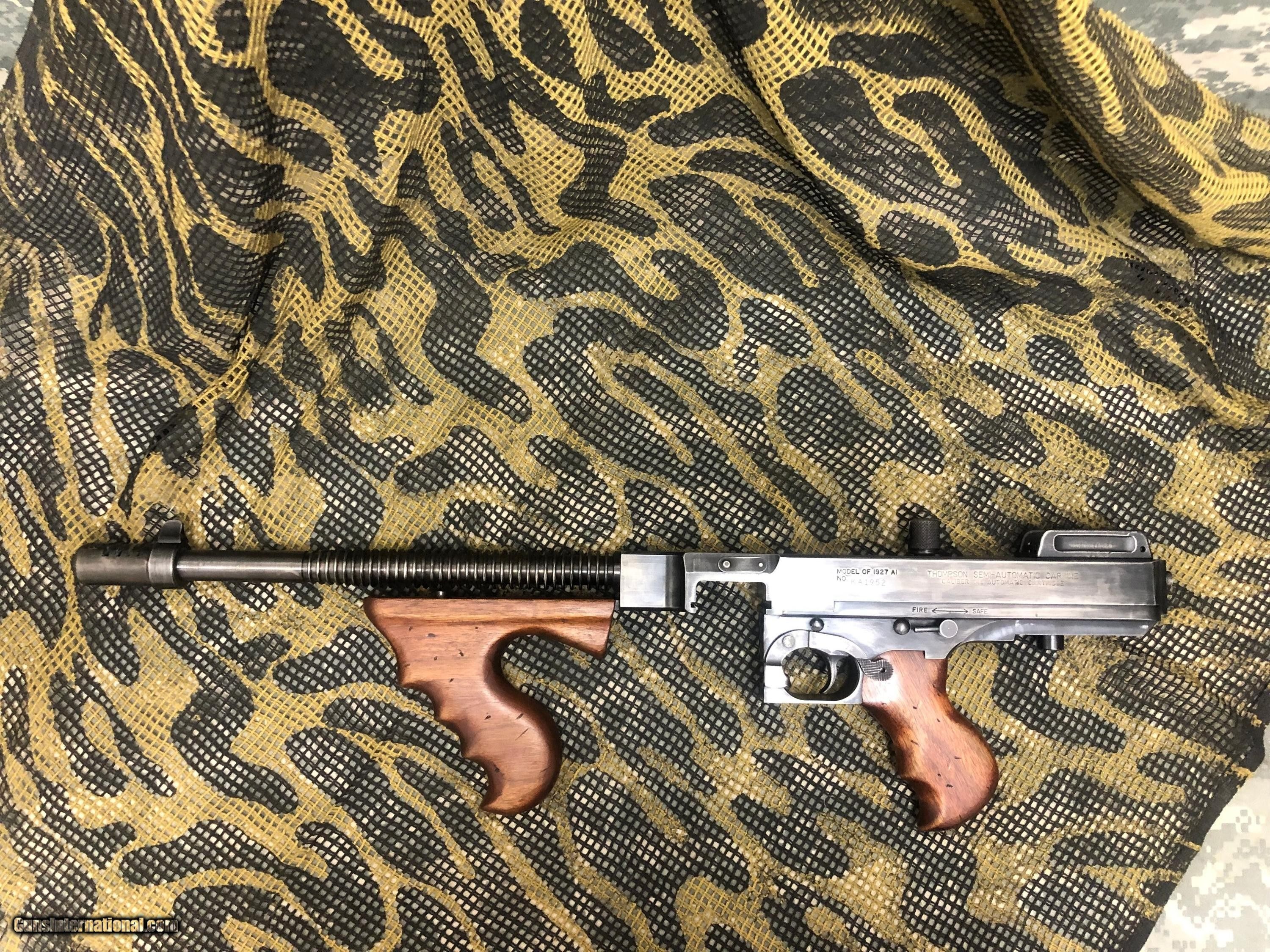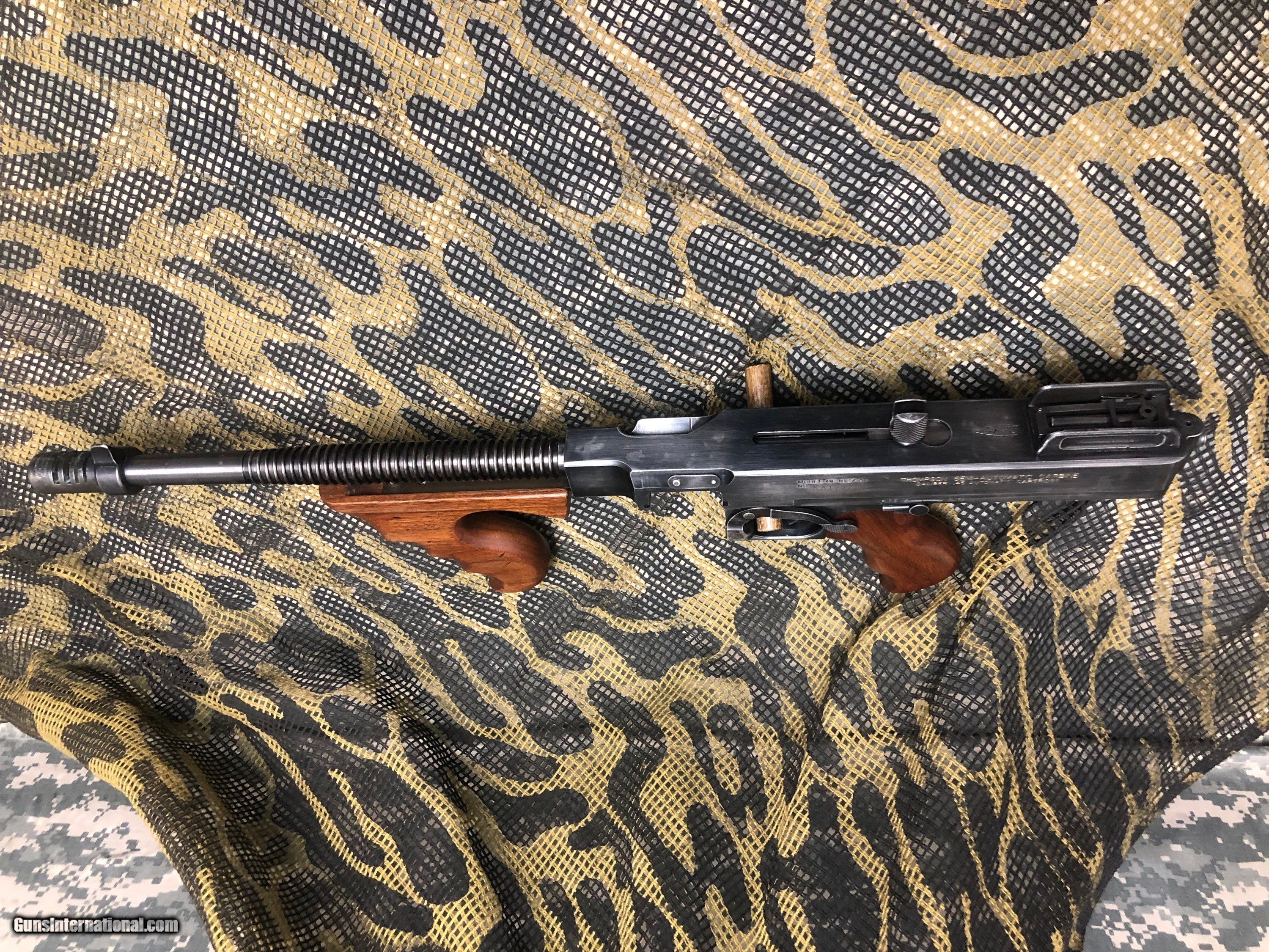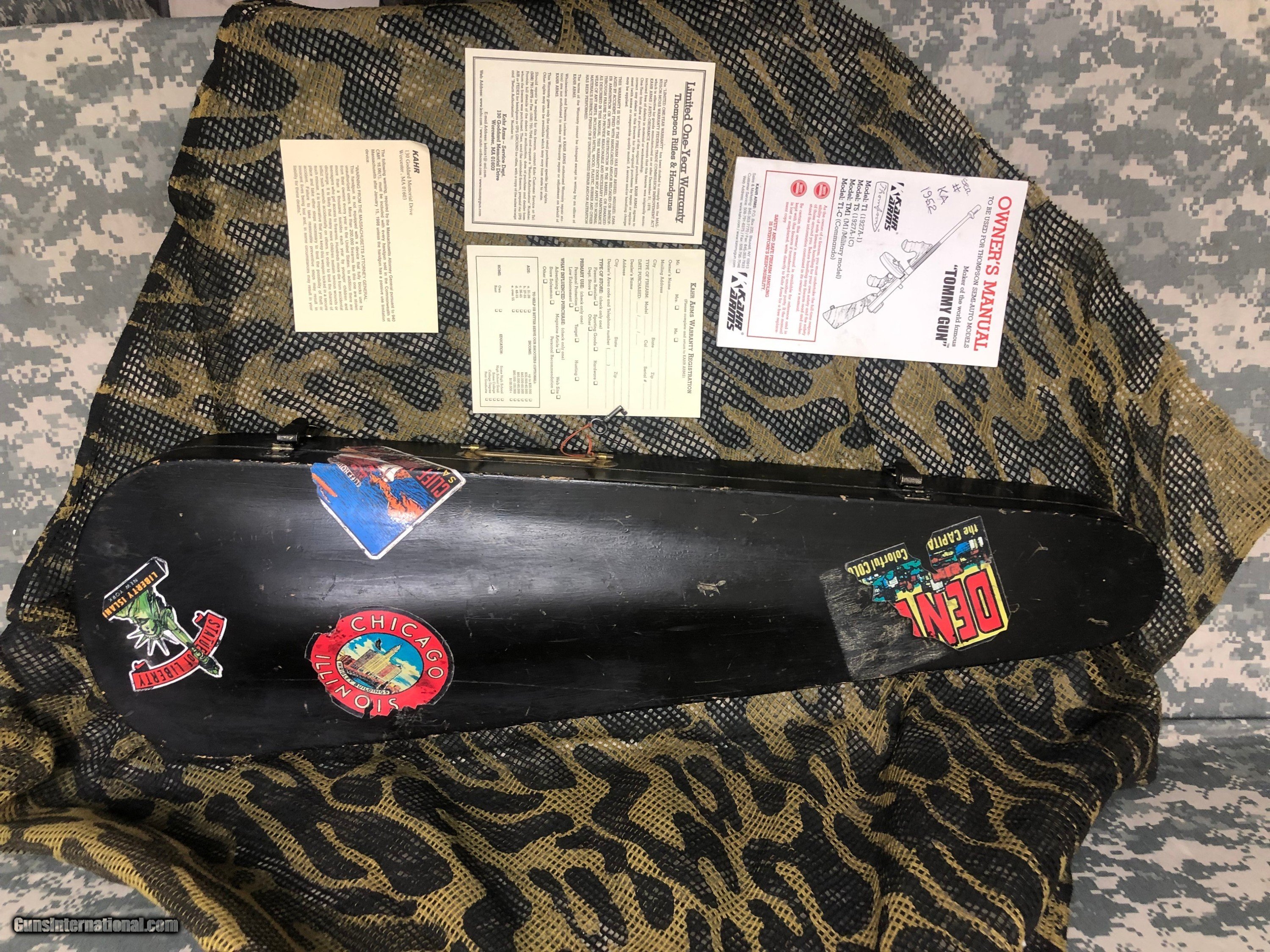 Description: Semi-Automatic Model of 1927-A1 in pistol configuration with finned 13 3/4" barrel (measured with compensator in place) and foregrip with finger grooves. Reciever has Thompson logo on top and Auto-Ordinance Corportation -Worcester MA on side, serial number has KA prefix (Owners manual is from Kahr Arms so post 1999 manufacture). Steel receiver will accept stick and drum magazines. We believe the metal condition to be 60% as the receiver finish has been worn by aggressive cleaning although the barrel finish is 90%. Also included are: Magazines: one 50 round drum magazine, three 30 round stick magazines (stamped: US - 30 Cartridge - CAL 45), four 30 round stick magazines (stamped: The Seymory Products Co), three 20 round stick magazines (stamped: SW - CO), one 30 round stick magazines (stamped: The Crosby Co), Accessories: Violin case (similar to factory accessory but from a real violin), hand made wooden case with green velvet interior (similar to factory accessory), Owners Manual, Parts & Accessories pamphlet, vintage "Handbook of the Thompson Submachine Gun" by Auto-Ordnance Corporation edition of 1940, booklet titled "Full Auto Volume Four Semi-Auto Thompson Modification Manual" by Desert Publications, multiple pages of previous owners internet research, flat blade screwdriver, movie poster of Machine Gun Kelly starring Charles Bronson Additional Parts: 16 3/8" smooth barrel, buttstock complete with all metal and sling, horizontal fore grip YOU are responsible for your compliance with Federal, State and Local Laws. 3% lost cash discount fee for credit card purchases. $125 for our standard shipping, add $20 for insurance. SOLD Handgun Caliber: .45 ACP (.45 Auto) Manufacturer: Karh Arms, Auto-Ordnance Thompson Model: 1927 A-1 Serial Number: KA1952 Barrel Length: 13 3/4 Condition: 70% Metal Condition: 60% Wood Condition: 90% Bore Condition: Bright and shiny Action: blowback |