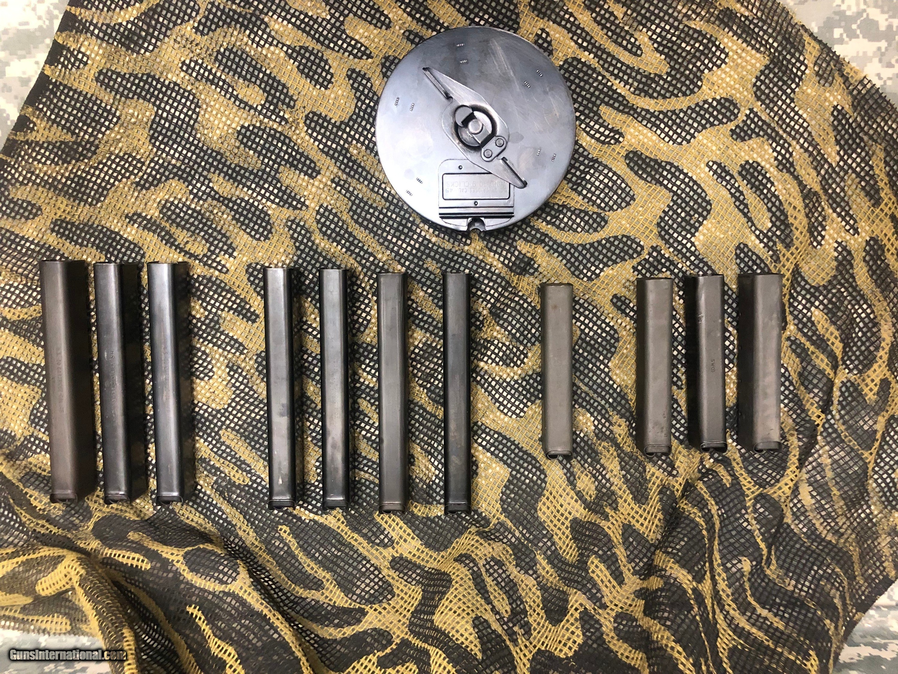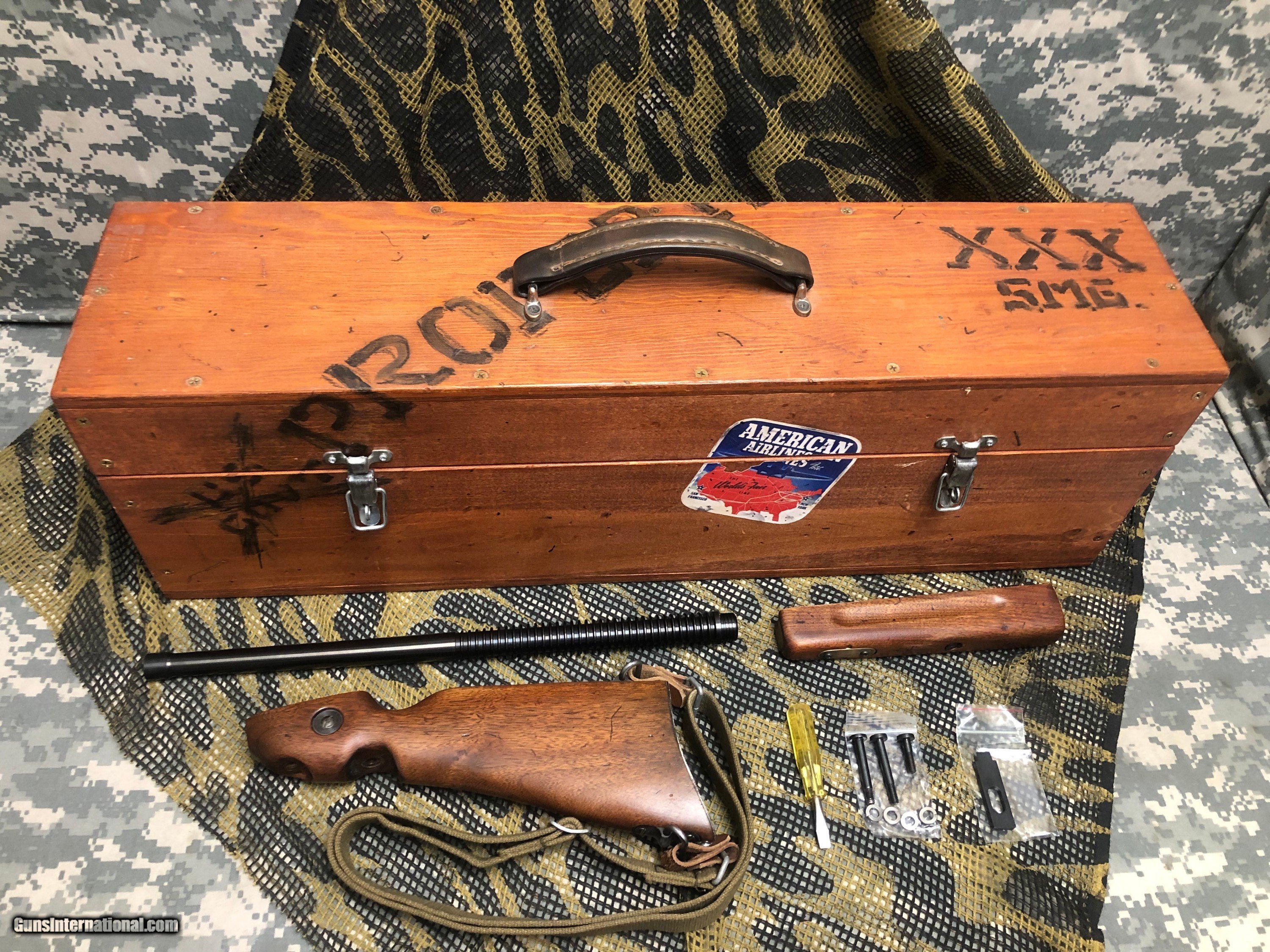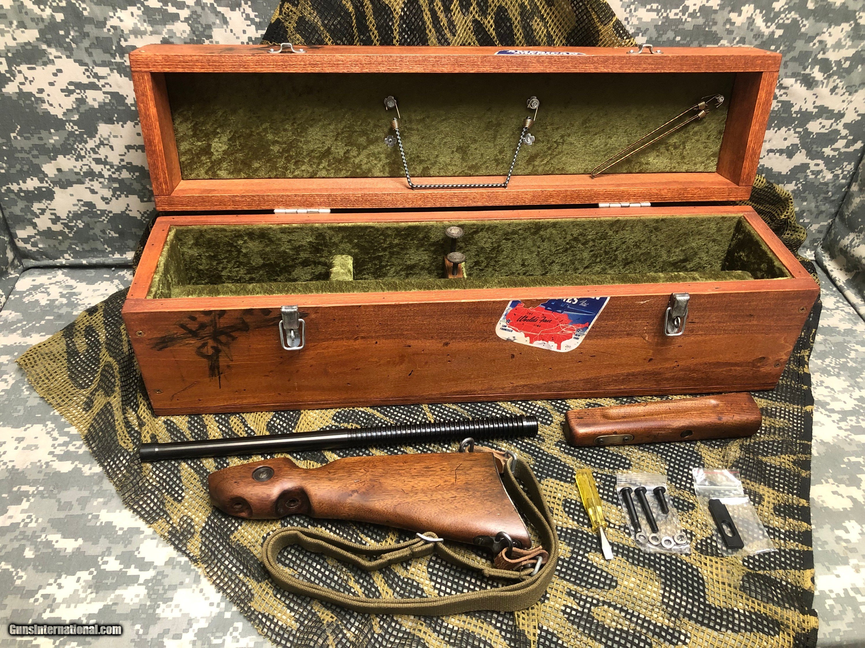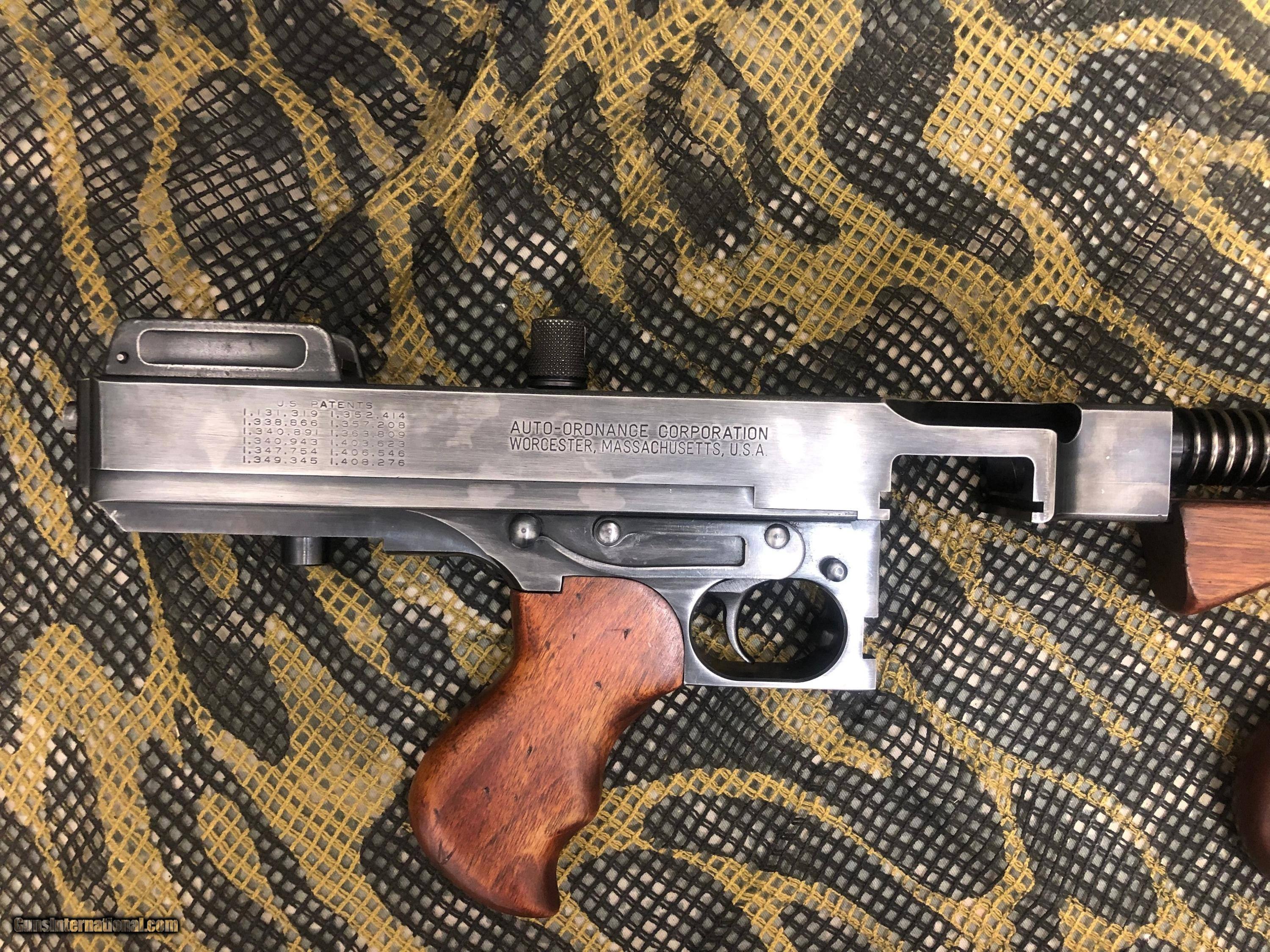 Description: Semi-Automatic Model of 1927-A1 in pistol configuration with finned 13 3/4" barrel (measured with compensator in place) and foregrip with finger grooves. Reciever has Thompson logo on top and Auto-Ordinance Corportation -Worcester MA on side, serial number has KA prefix (Owners manual is from Kahr Arms so post 1999 manufacture). Steel receiver will accept stick and drum magazines. We believe the metal condition to be 60% as the receiver finish has been worn by aggressive cleaning although the barrel finish is 90%. Also included are: Magazines: one 50 round drum magazine, three 30 round stick magazines (stamped: US - 30 Cartridge - CAL 45), four 30 round stick magazines (stamped: The Seymory Products Co), three 20 round stick magazines (stamped: SW - CO), one 30 round stick magazines (stamped: The Crosby Co), Accessories: Violin case (similar to factory accessory but from a real violin), hand made wooden case with green velvet interior (similar to factory accessory), Owners Manual, Parts & Accessories pamphlet, vintage "Handbook of the Thompson Submachine Gun" by Auto-Ordnance Corporation edition of 1940, booklet titled "Full Auto Volume Four Semi-Auto Thompson Modification Manual" by Desert Publications, multiple pages of previous owners internet research, flat blade screwdriver, movie poster of Machine Gun Kelly starring Charles Bronson Additional Parts: 16 3/8" smooth barrel, buttstock complete with all metal and sling, horizontal fore grip YOU are responsible for your compliance with Federal, State and Local Laws. 3% lost cash discount fee for credit card purchases. $125 for our standard shipping, add $20 for insurance. SOLD Handgun Caliber: .45 ACP (.45 Auto) Manufacturer: Karh Arms, Auto-Ordnance Thompson Model: 1927 A-1 Serial Number: KA1952 Barrel Length: 13 3/4 Condition: 70% Metal Condition: 60% Wood Condition: 90% Bore Condition: Bright and shiny Action: blowback |