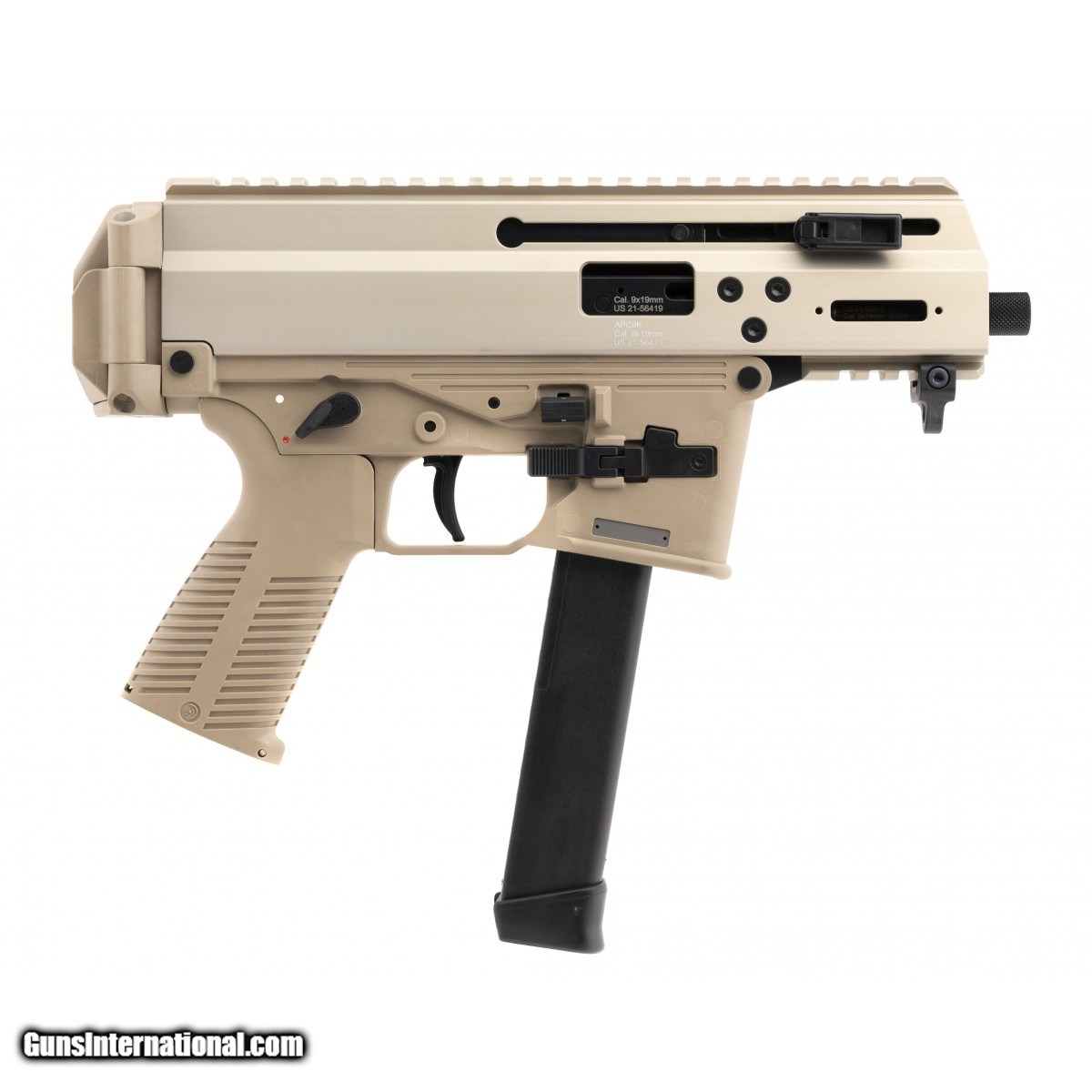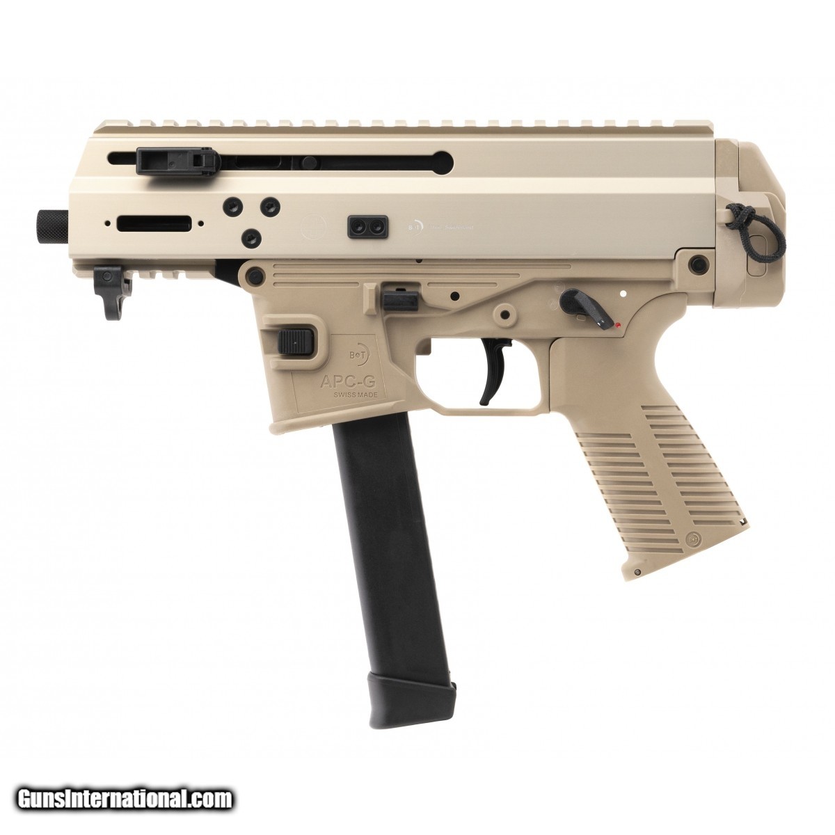 Swiss made tactical pistol with threaded barrel. Takes Glock magazines. Tan finish. Non-reciprocating charging handle. NEW. UPC:840225705577