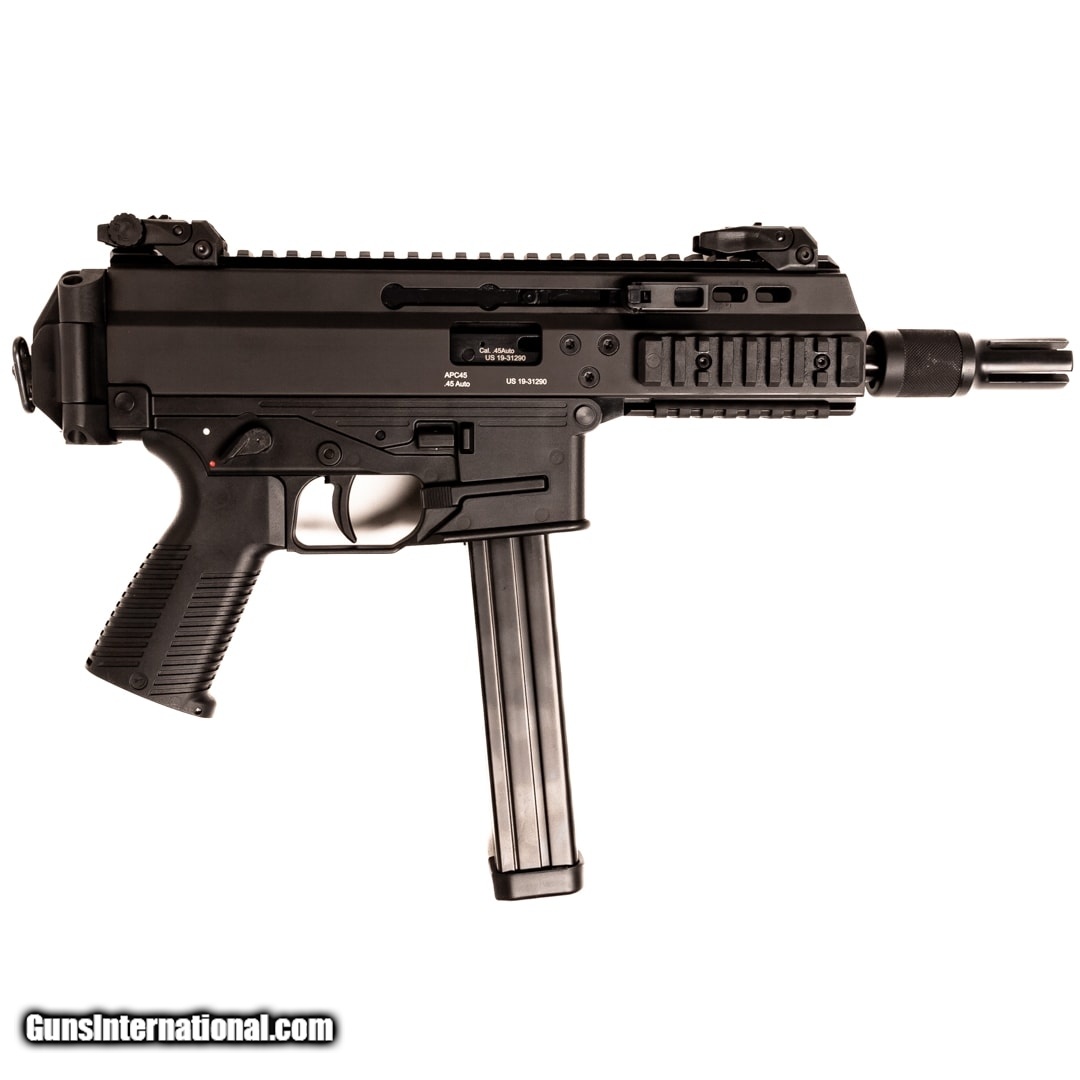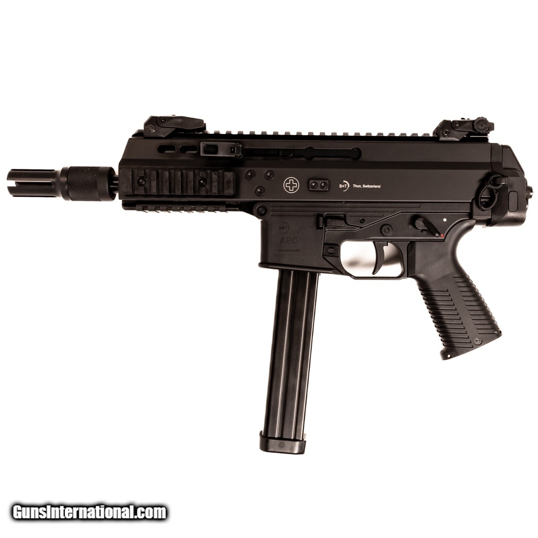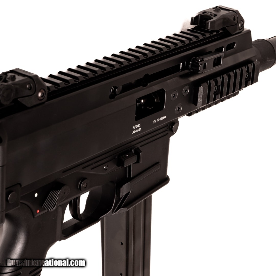 Description: Guns Listing ID: 721119 Compact and lightweight, the B&T APC45 was designed to meet the demanding needs of modern police, special forces, and militaries worldwide. The result of this engineering masterpiece is a small carbine/SMG kitted out with features and accessories ideal for most missions and conditions. This APC45 features flip-up sights, flash hider, and a sling. Purchase includes the original case, manual, one 25-round magazine, and a cleaning kit. Get the best bang for your buck when you get a Certified Used Firearm . When you see the Certified Used stamp on any of our firearms, you can be confident that you’re getting exactly what you want – a gun only in very good to excellent condition and held to the highest quality standard. All Certified Used Guns come with a ‘no questions asked’ return policy . PLUS, ALL CERTIFIED USED GUNS SHIP FREE! SOLD Manufacturer: B&T Model: APC45 Caliber Info: .45 ACP Condition: Used - Certified Barrels: 7 barrel Finish: BLACK |