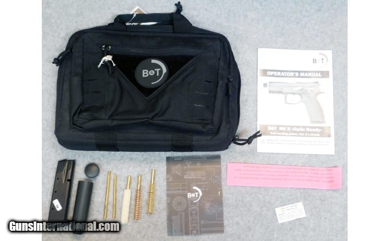 Description: B&T ~ Mk II ~ Chambered in 9 mm Luger. Is a semi-auto double action suppressor optimized full frame pistol, a Swiss derivative of the CZ-75 action. Features a 4.5" barrel with 13.5x1" LH threads, and is paired with iron sights. The black frame and slide are complimented with rubber grips which aid in comfort and control. Comes with soft case along with factory documentation, and two 17 + 1 capacity magazines. 9mm Luger SOLD Chambers: 9 mm Luger. Metal Condition: Very good condition. Bore Condition: Good condition. Barrels: 4.5" inches. Weight: 2 pounds Sights: Iron sights. Chokes: 13.5x1" LH threaded. Item Location: Acworth, GA |