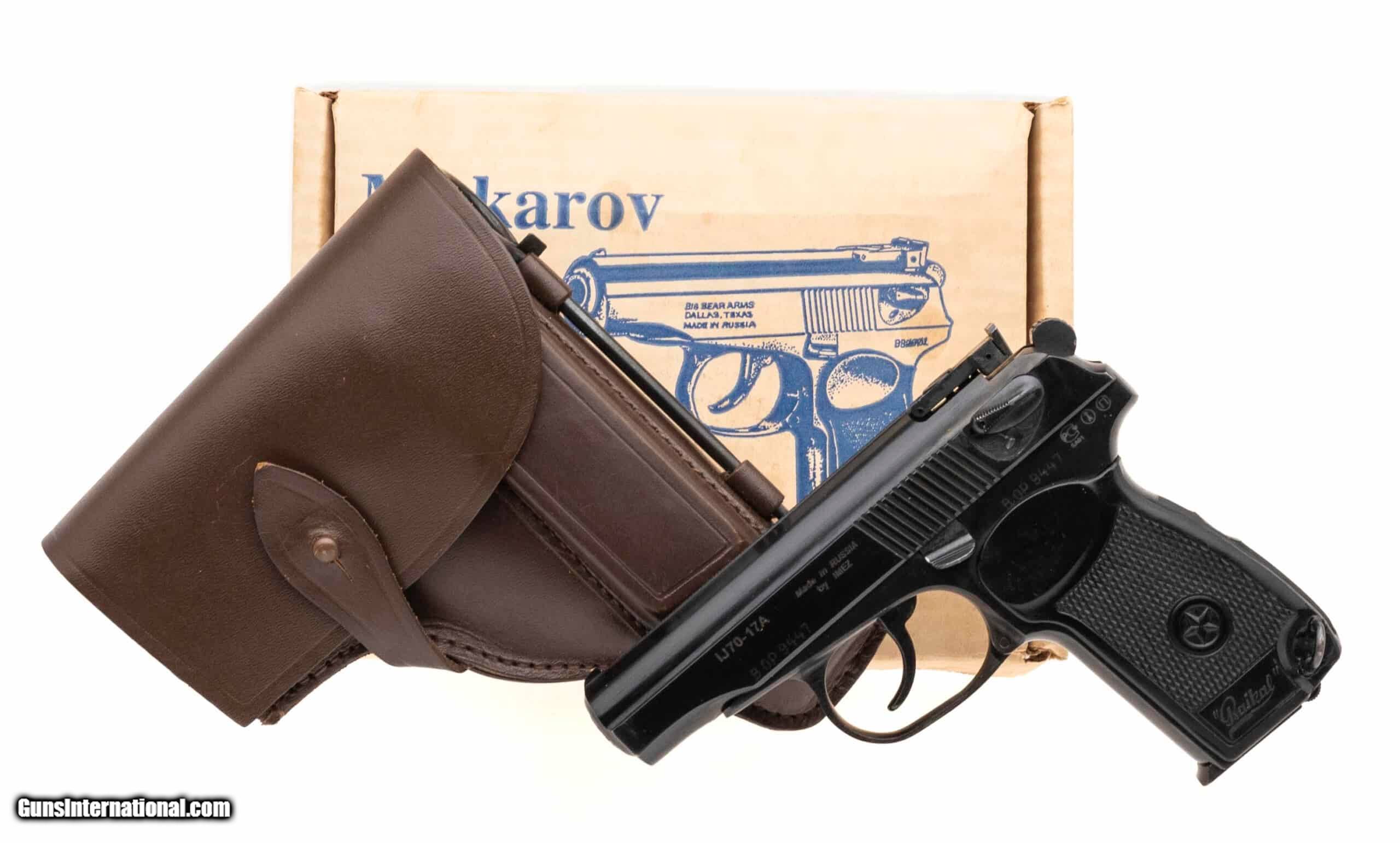 Description: "SN: BOP9447. Commercial export version of the Soviet Makarov PM pistol made by IMEZ in 1993. 3½"" barrel chambered for .380 Auto. Great overall condition with small handling marks in the dark blued finish and polymer grip. Bore is excellent. ""Big Bear Arms"" import mark on right of slide. Comes with box and holster. Austin Location (737) 802-3777 SOLD |