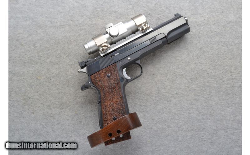 Description: This Essex Semi-Automatic "1911" style target pistol is in .22 Long Rifle Cal. It has a 6 inch barrel and hardwood target grips. A blade front sight, adjustable notch rear sight and a 11 level red dot sight mounted on top. It is in overall very good condition and comes as is with one magazine. SOLD Caliber Info: .22 Long Rifle Chambers: 10 shot magazine. Metal Condition: Very good with light wear and minor handling marks. Wood Condition: Very good. Bore Condition: Excellent. Barrels: 6 inches. Black slide. Triggers: Grooved Adjustable. Stock: Walnut target grips. Smooth on the left side with a thumb rest. Textured on the right side. Weight: 3 lbs. 12 oz. with sight mounted. Sights: Blade front. Adjustable notch rear. Red dot sight. Item Location: Richfield, WI |