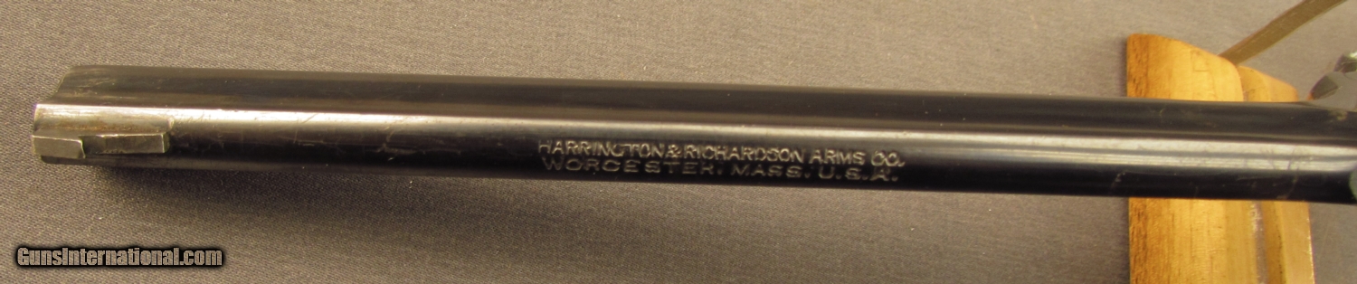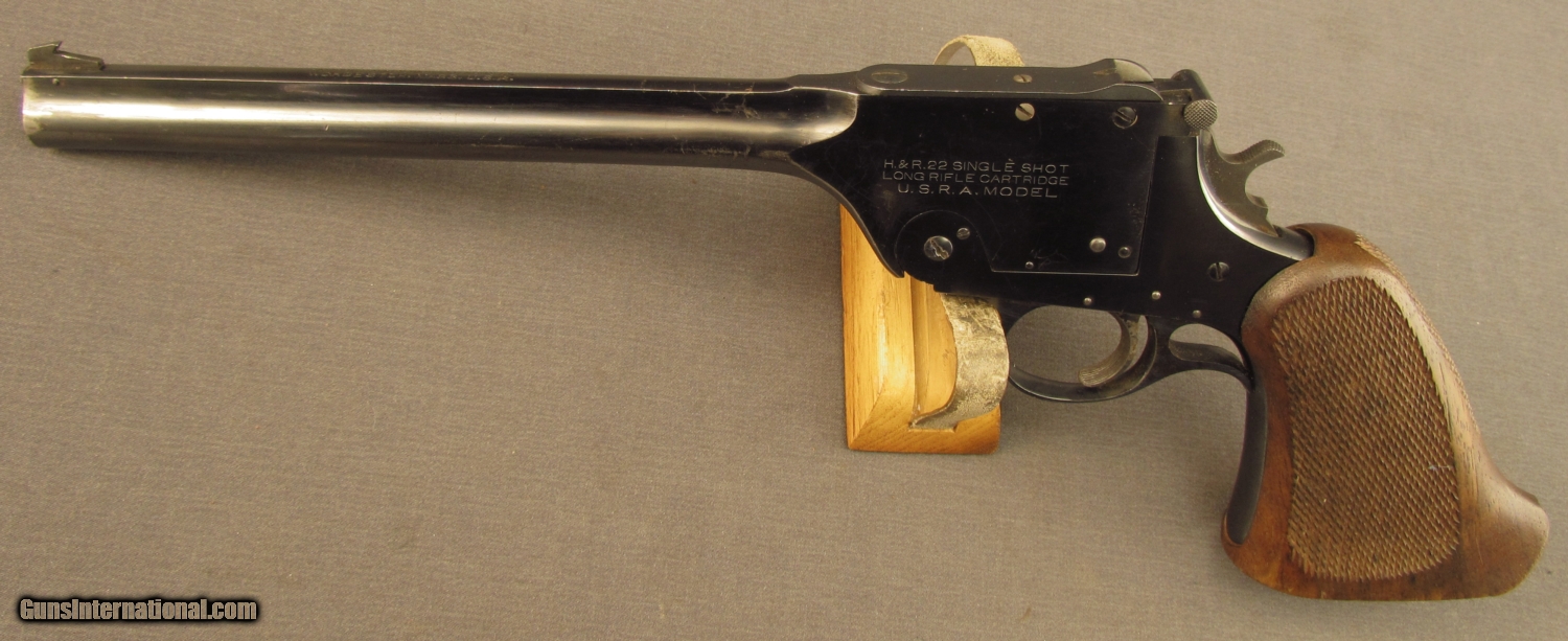 Description: Serial #1543, .22 LR, 10" solid-ribbed barrel with an excellent, bright bore. This is a fourth variation pistol, manufactured ca. 1931-1932, with the early small hammer and retains 92-95% of the original bright blue finish with silvering present along the high edges and scattered minor surface scratches at the sides of the barrel towards the frame. The wide, checkered walnut target grip is in fine condition with only minor surface wear and trace flattening of the points. The only damage to the wood occurs on the heel of the butt where there are some minor chips surrounding the grip screw head. The action is crisp and precise with firm barrel lock-up and no lateral play. This is a fine example of a desirable H&R USRA pistol. FFL or C&R SOLD Curio/Relic: Yes Manufacturer: H&R Model: USRA Serial Number: 1543 Caliber Info: .22LR Gauge Info: .22LR |
