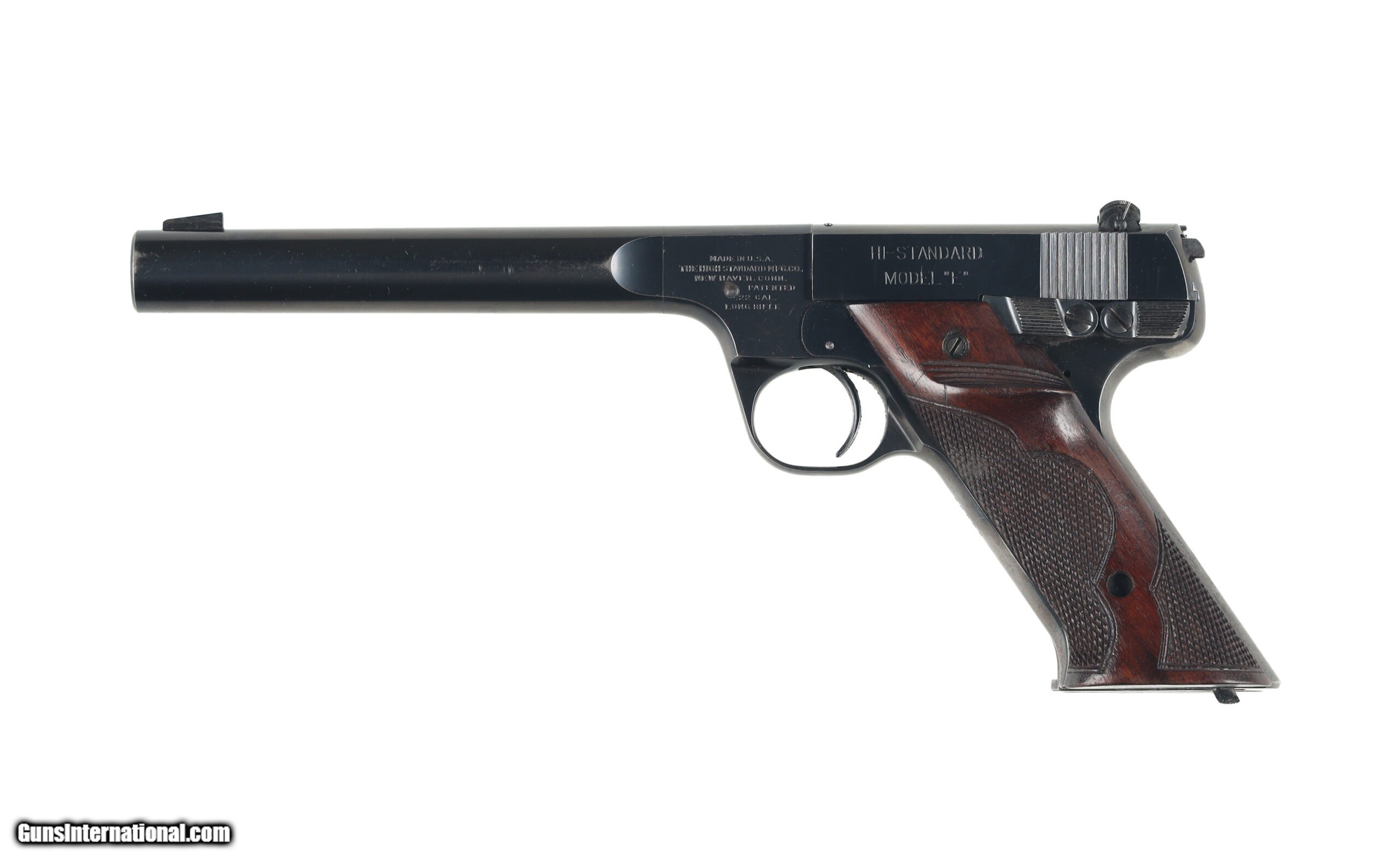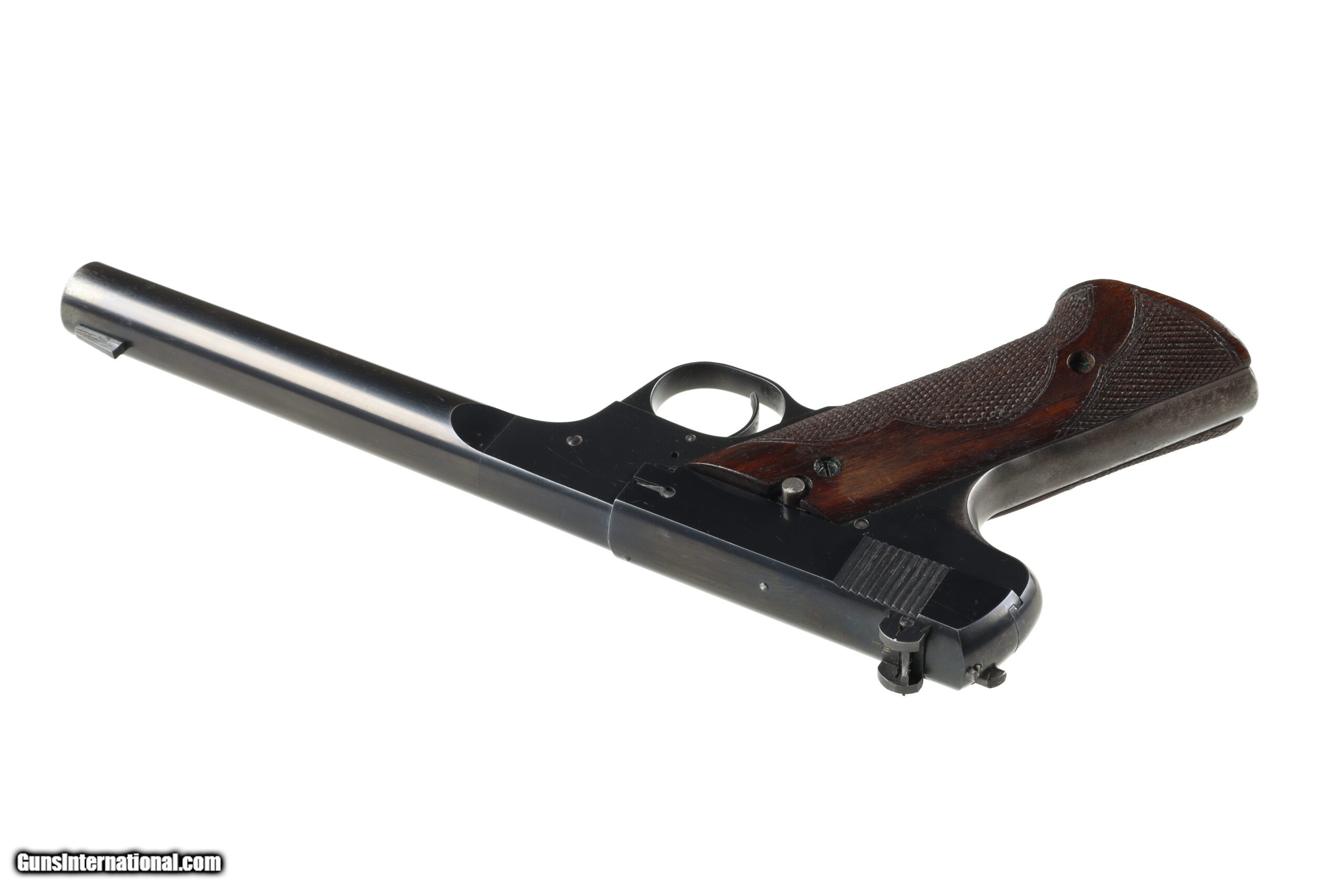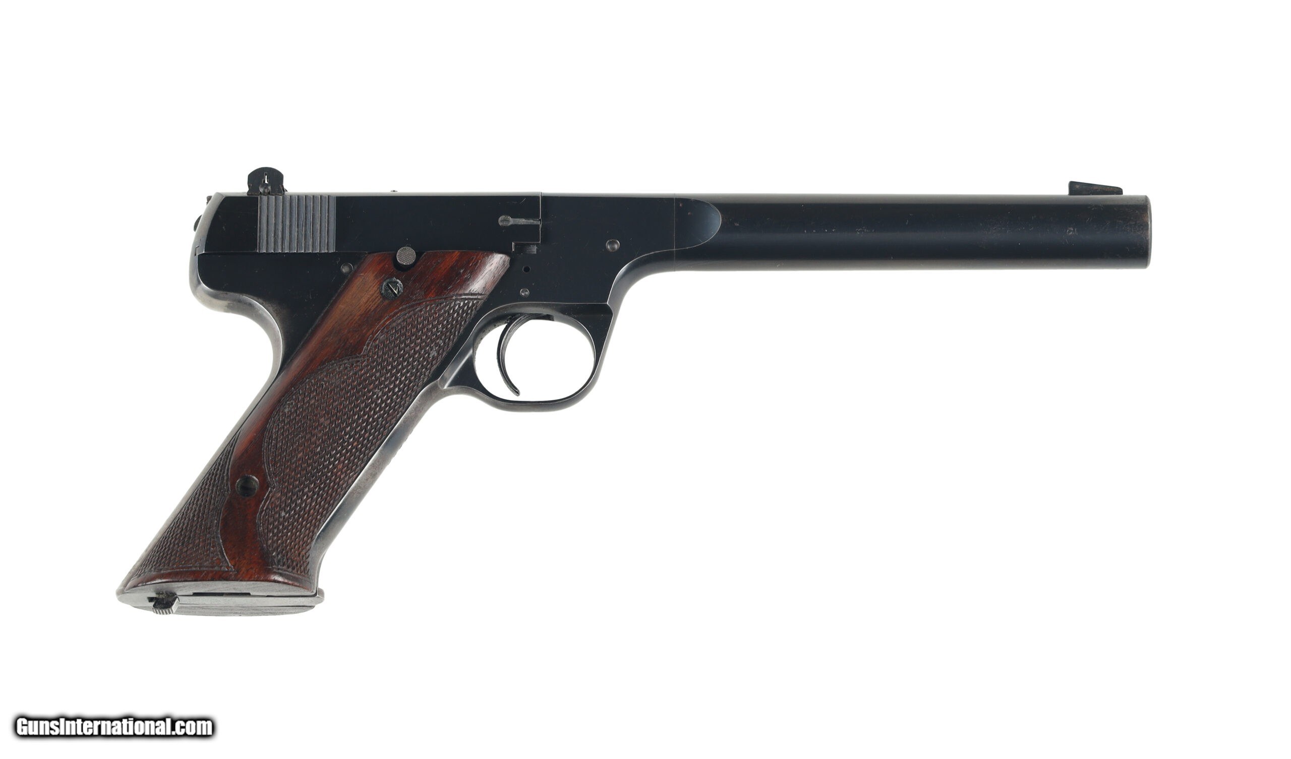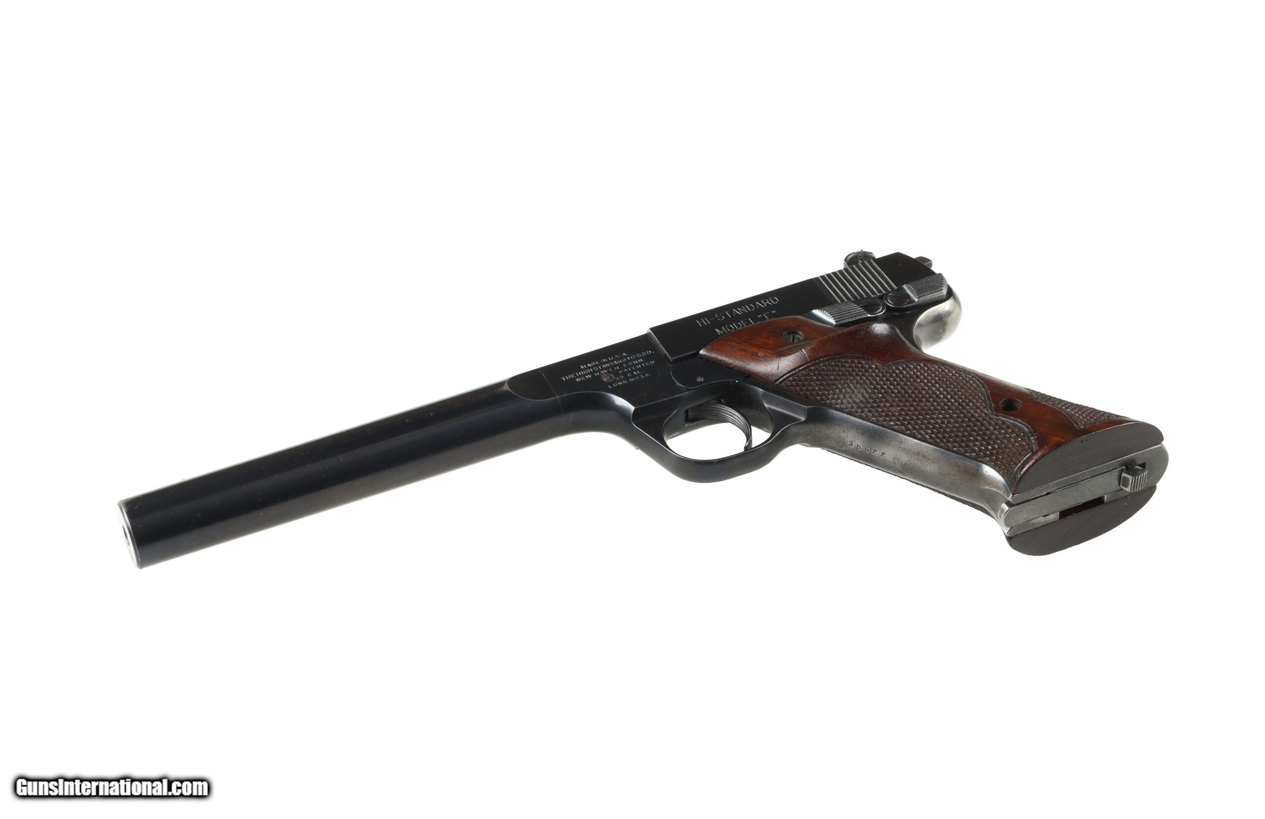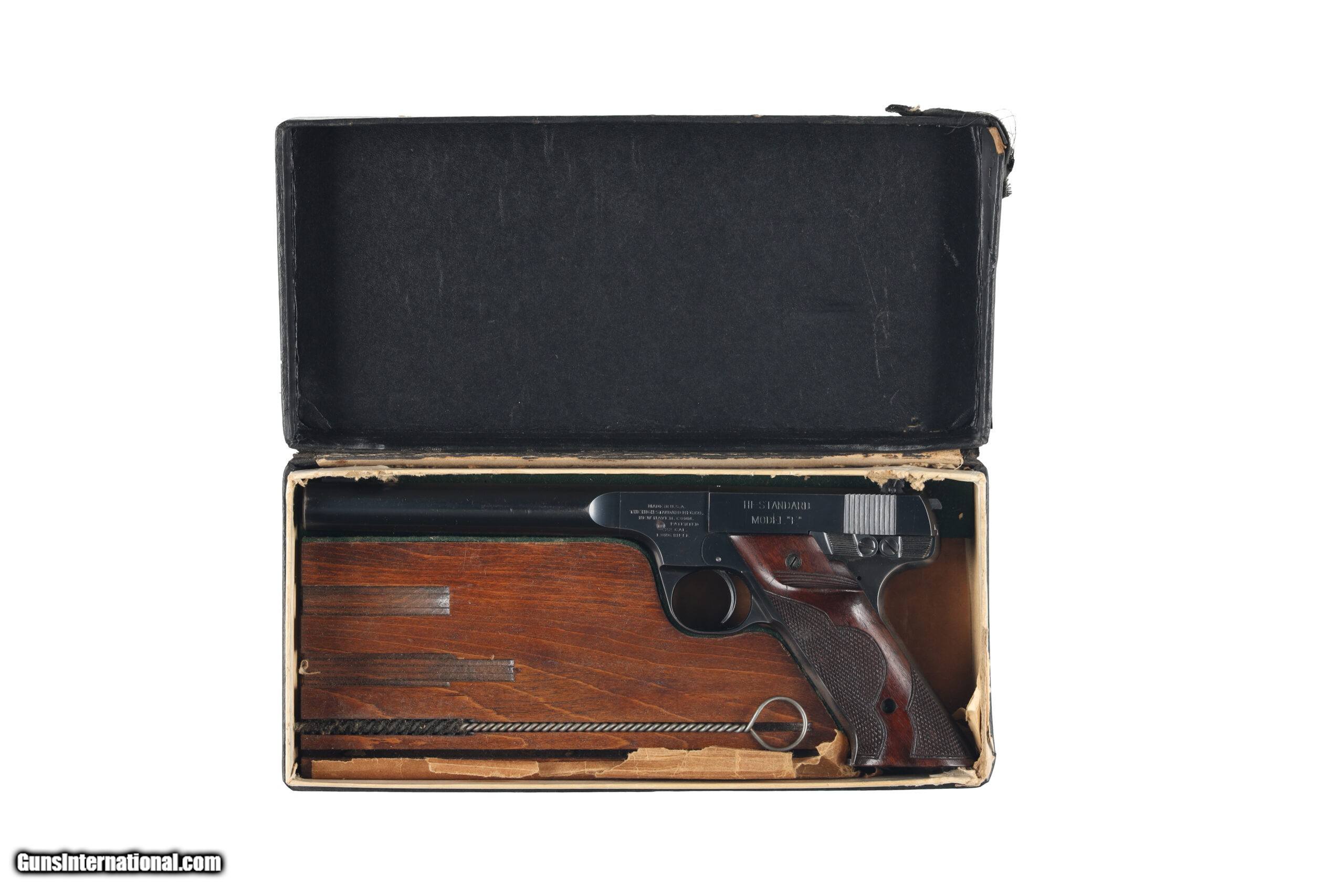 The Hi-Standard Mosel E was a high quality, heavy barreled target pistol, made from the late 1930's to the mid 1940's. This example is in very good overall condition, with light to moderate finish wear and comes with the original factory box, though there are a few items missing from the box as evidenced by empty slots. Manufactured in: USA Hand: Right Hand Action Finish: Blue Metal Finish: Original Barrel Length: 6 3/4 " Barrel Condition: Very Good Stock Finish: Original Stock Condition: Very Good Grip: Pistol