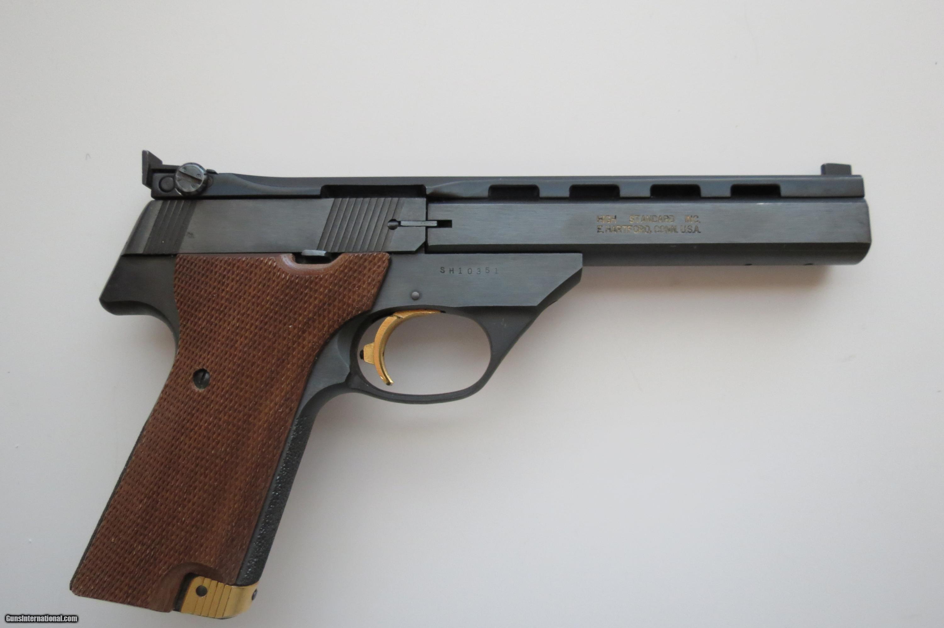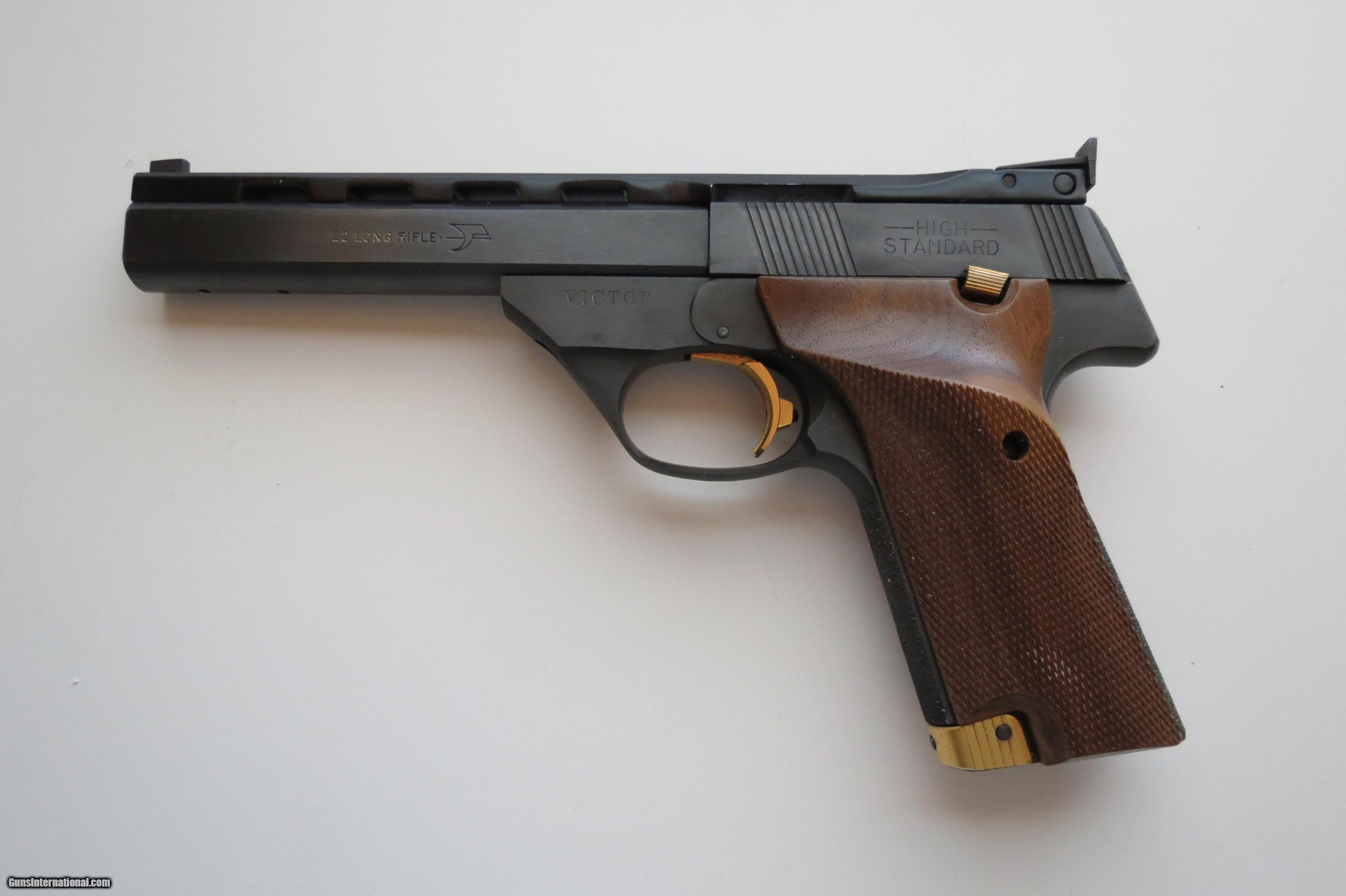 Description: High Standard Victor 22 Long Rifle, With Box & paper work, 5 1/2 inch barrel with adjustable sights, barrel tapped for weight, 10 shot magazine, checkered walnut thumb rest grips, Pistol appears unfired, show very light handling. Shipping/Insurance $35 SOLD Manufacturer: High Standard Model: Victor Caliber Info: 22 Long Rifle Condition: Excellent |