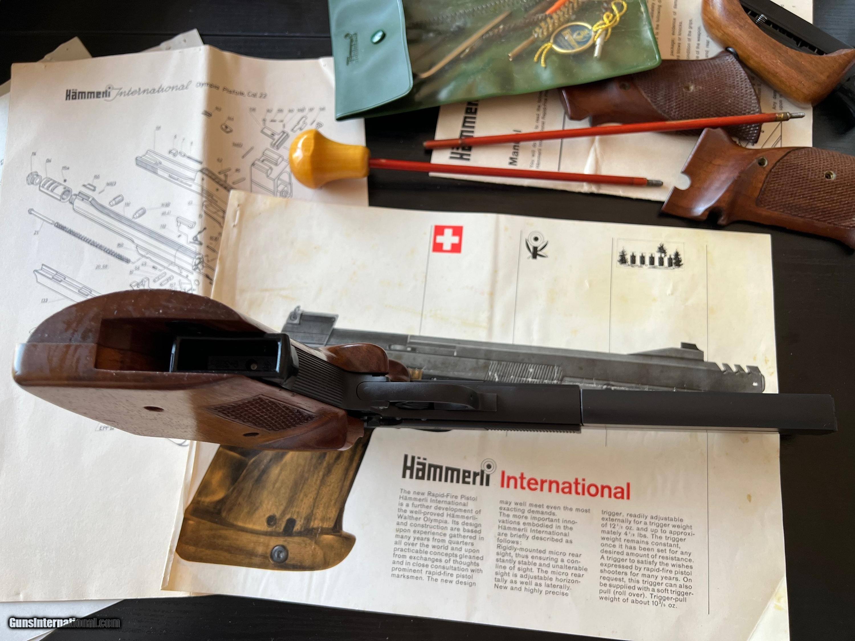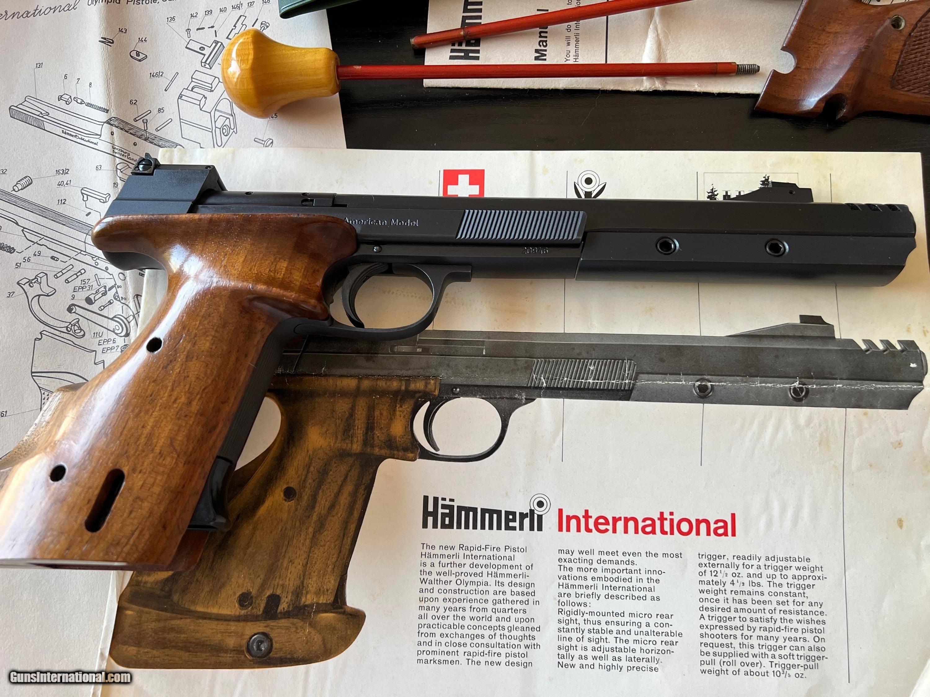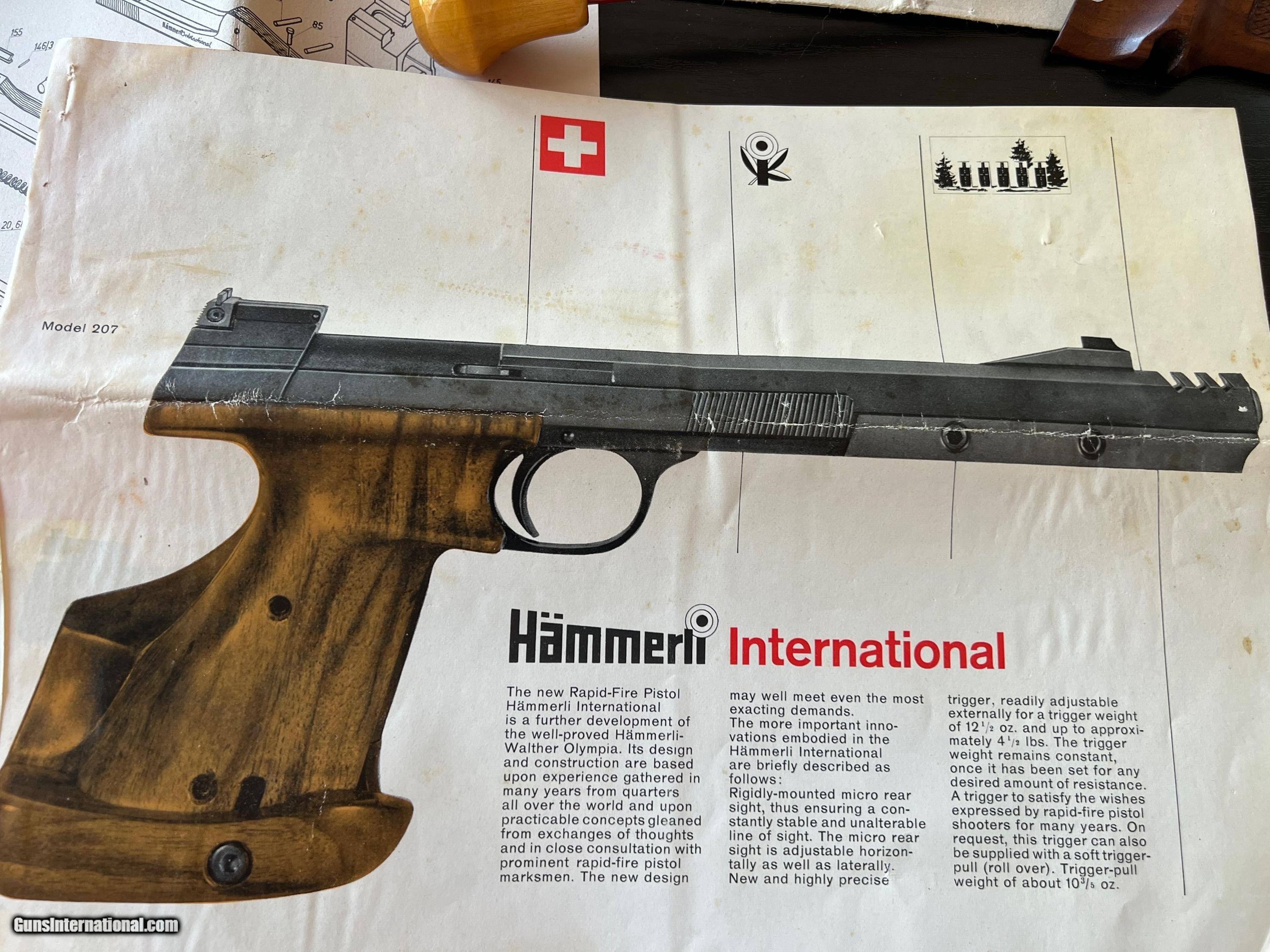 Description: SOLD This is an absolutely mint "as new in the box", desirable Hammerli 207 "American Model" target pistol, chambered in .22 LR, made in Switzerland in the early 60's. The gun appears new and unfired and comes with an original serialised box, two matching mags(serialised to the gun) and a multitude of paperwork, extras, tools, spare grips - all pictured. Hammerli target pistols were a continuation of German Walther Olympia guns that were continuously improved in the post war years. They were considered to be top notch target guns worthy of Olympic shooters. The 207 "American Model" was made in very limited numbers, of highest Swiss quality, and became a collectible in its own right. This particular gun is in stunning original condition and cannot be upgraded. The box shows some wear but is all intact. A great target gun and a great investment gun as well. 3-days inspection FFL or C&R (where allowed) $40 shipping in CONUS SOLD Curio/Relic: Yes |