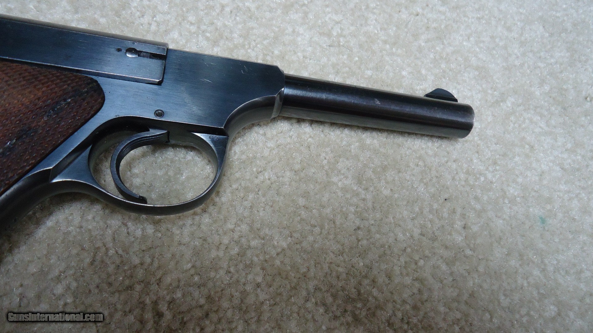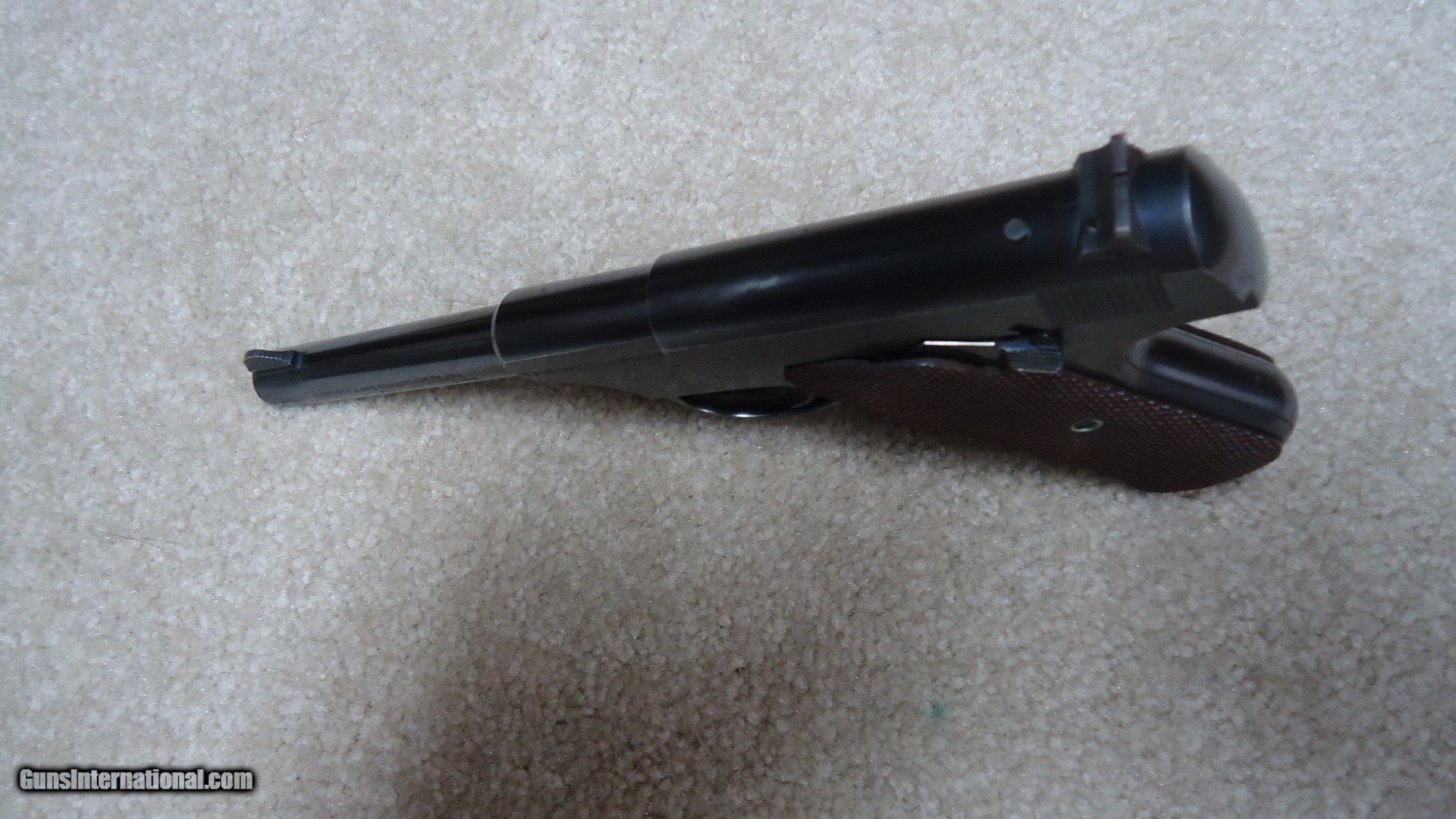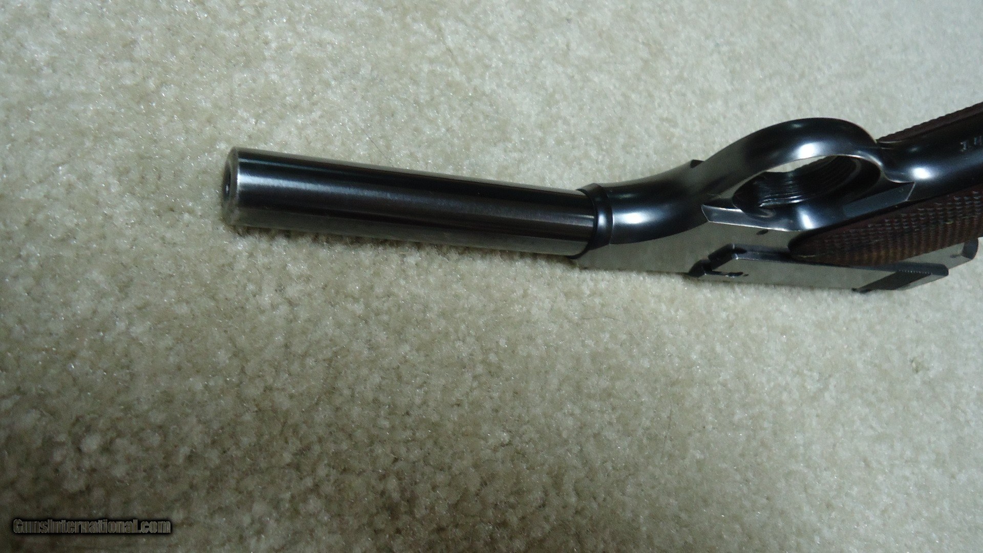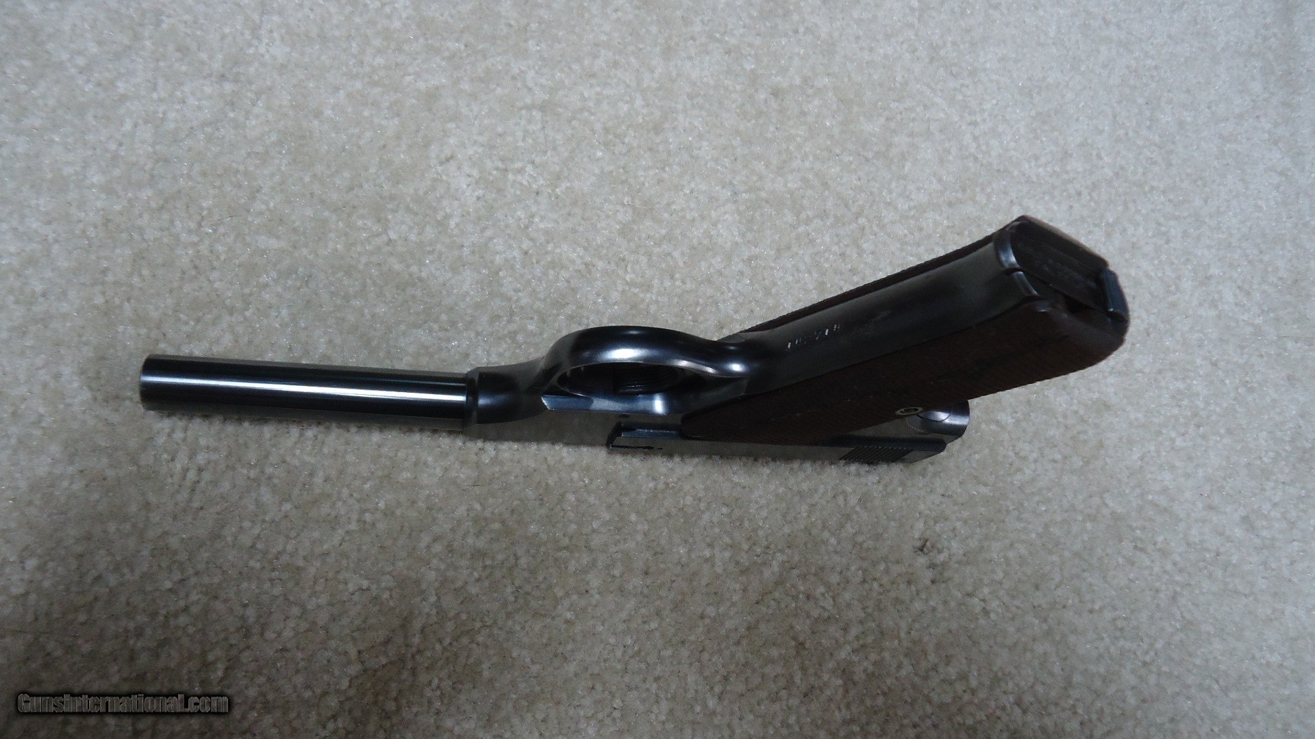 Description: PRE-WAR COLT WOODSMAN .22 AUTO PISTOL, 4 1/2" BARREL, #142XXX, MADE 1940. This pistol comes with a floral carved, western style "S. D. Myers, El Paso" stamped holster in excellent condition. Overall the pistol shows almost all the blue intact with only some light muzzle wear and scattered wear from handling and edge wear that is minor. The rear sight is screw-adjustable for windage, exc. markings and rampant colt stamping on the left side of the frame, the right grip panel has a crack from top to bottom that has been solidly repaired and looks like a dark line, sharp checkering, Colt Woodsman marked magazine, bright bore, very crisp trigger, great holster and wonderful solid feel to these. SOLD Curio/Relic: Yes Handgun Caliber: .22 Long Rifle Manufacturer: C Model: WOODSMAN Serial Number: 142XXX Barrel Length: 4 1/2 Condition: FINE Bore Condition: EXCELLENT |