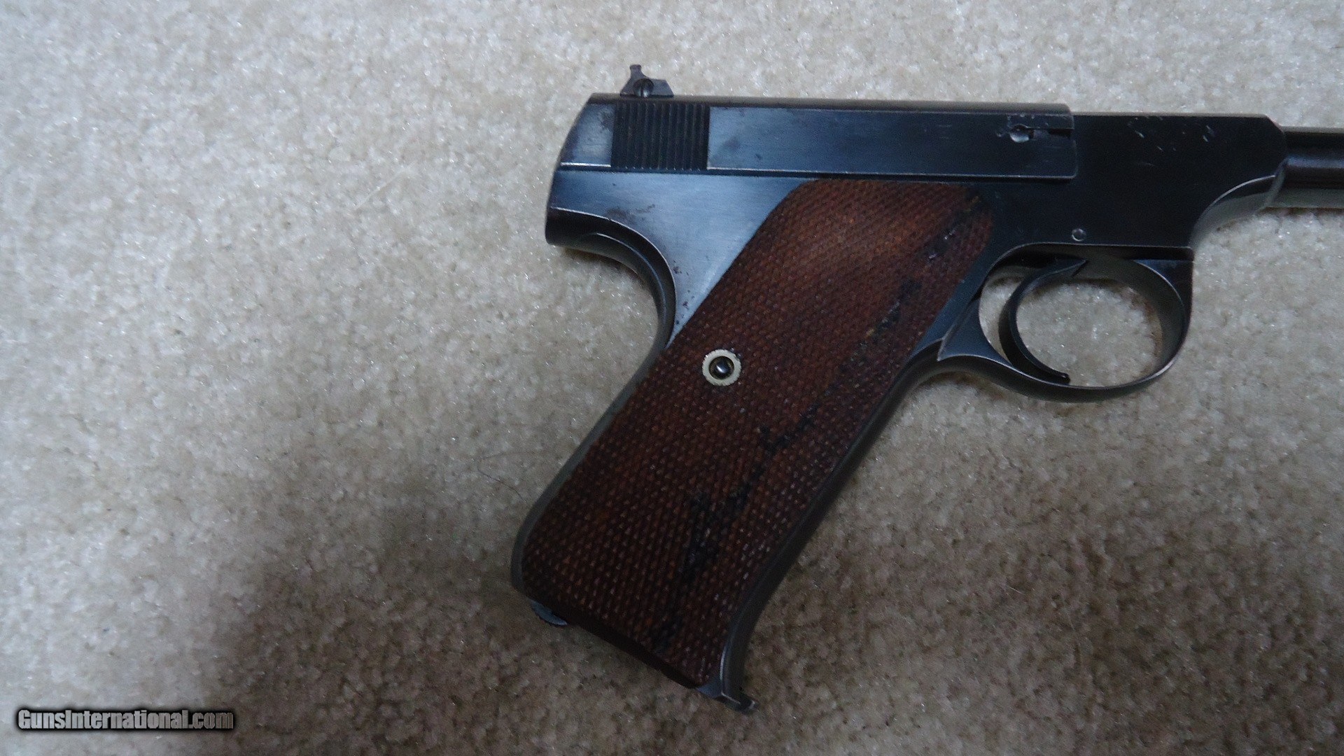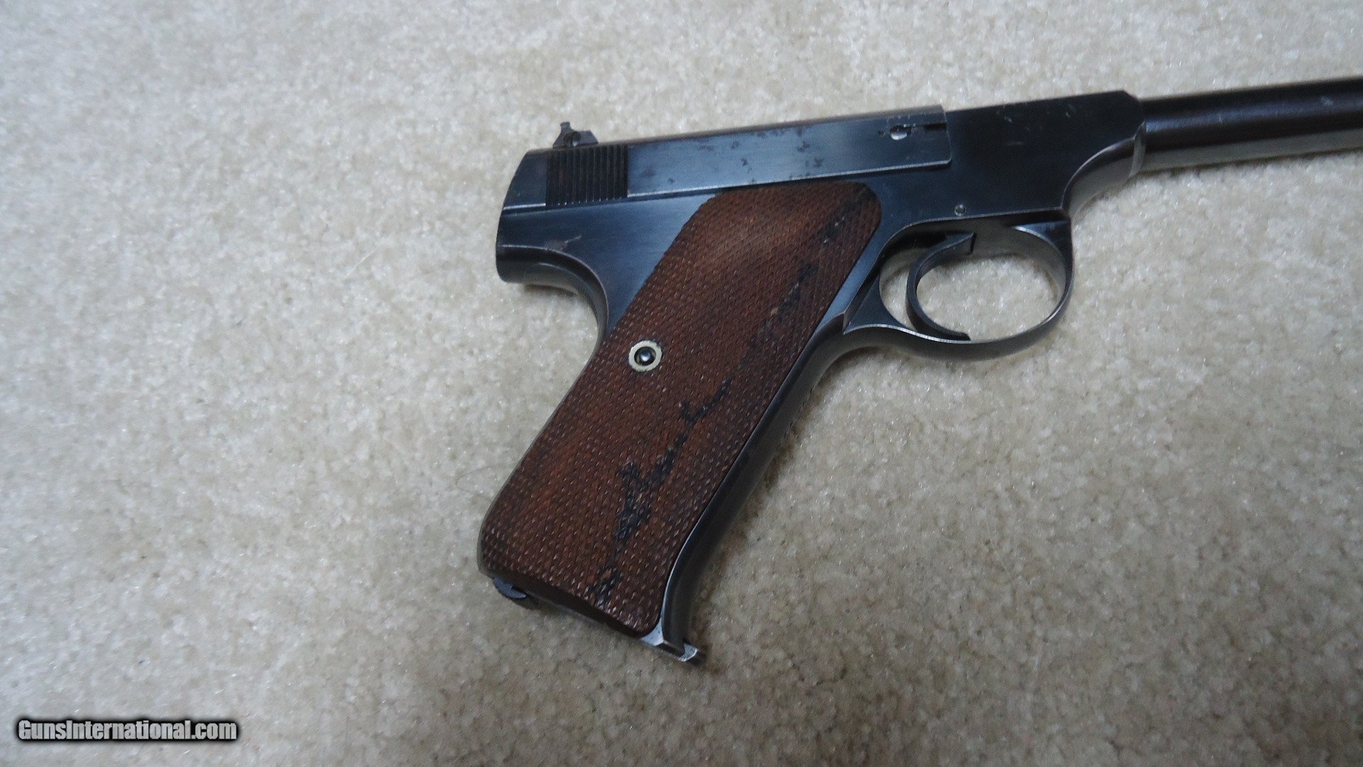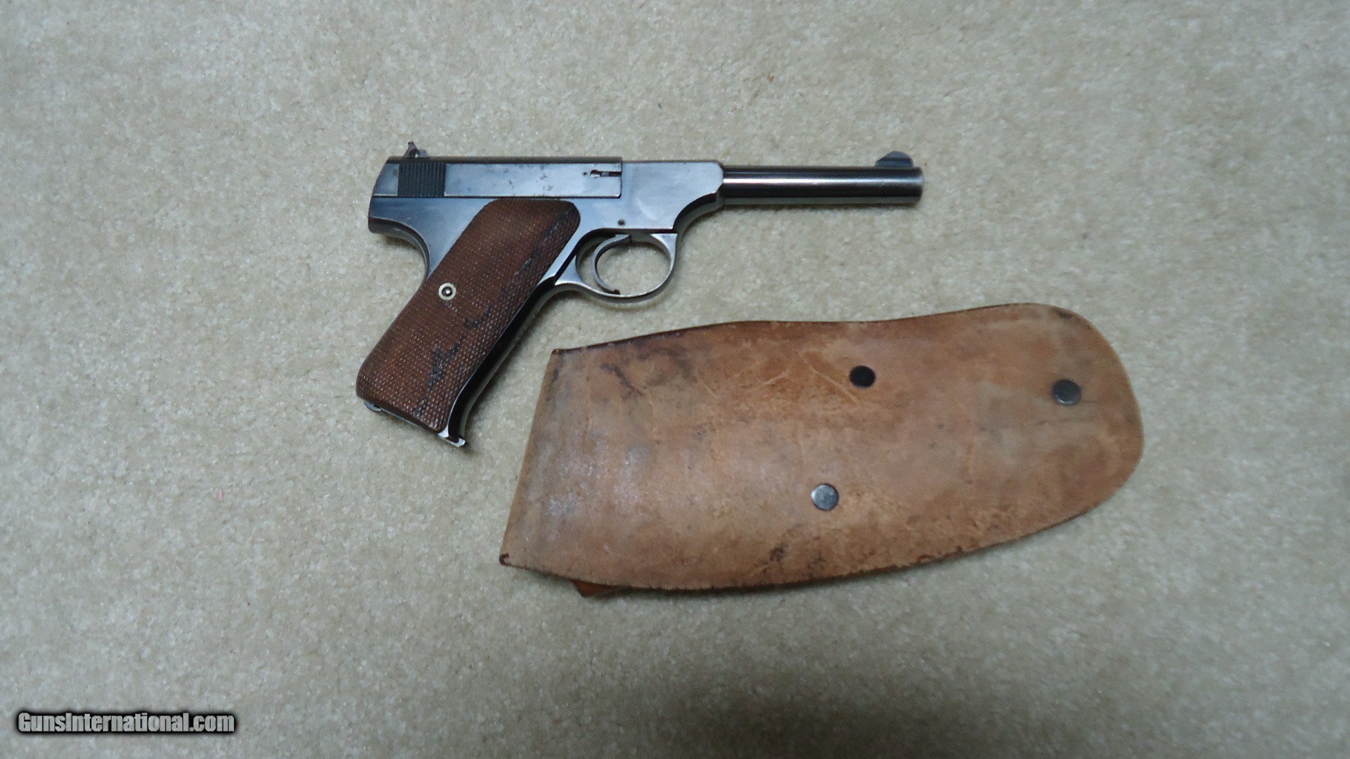 Description: PRE-WAR COLT WOODSMAN .22 AUTO PISTOL, 4 1/2" BARREL, #142XXX, MADE 1940. This pistol comes with a floral carved, western style "S. D. Myers, El Paso" stamped holster in excellent condition. Overall the pistol shows almost all the blue intact with only some light muzzle wear and scattered wear from handling and edge wear that is minor. The rear sight is screw-adjustable for windage, exc. markings and rampant colt stamping on the left side of the frame, the right grip panel has a crack from top to bottom that has been solidly repaired and looks like a dark line, sharp checkering, Colt Woodsman marked magazine, bright bore, very crisp trigger, great holster and wonderful solid feel to these. SOLD Curio/Relic: Yes Handgun Caliber: .22 Long Rifle Manufacturer: C Model: WOODSMAN Serial Number: 142XXX Barrel Length: 4 1/2 Condition: FINE Bore Condition: EXCELLENT |
