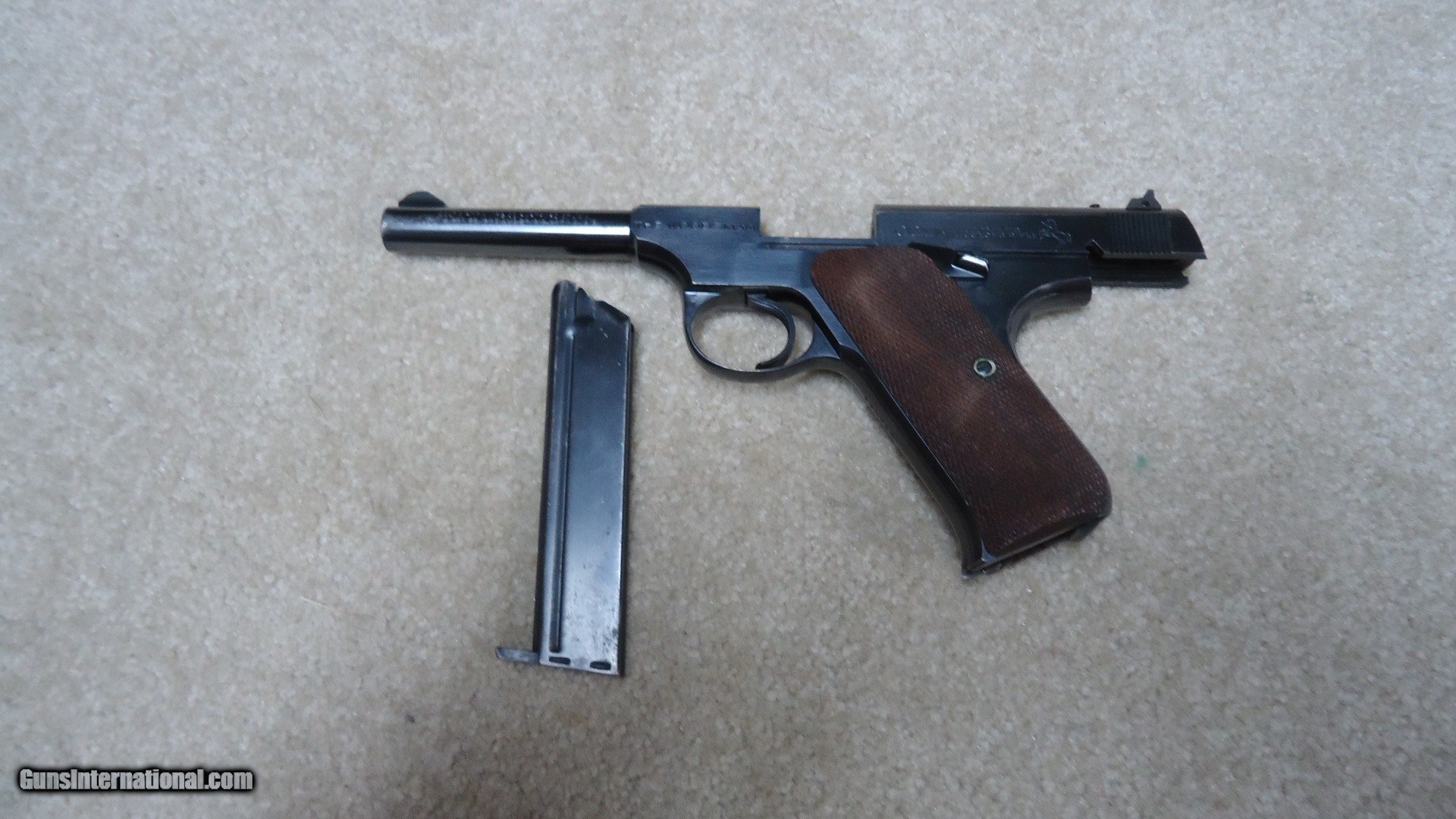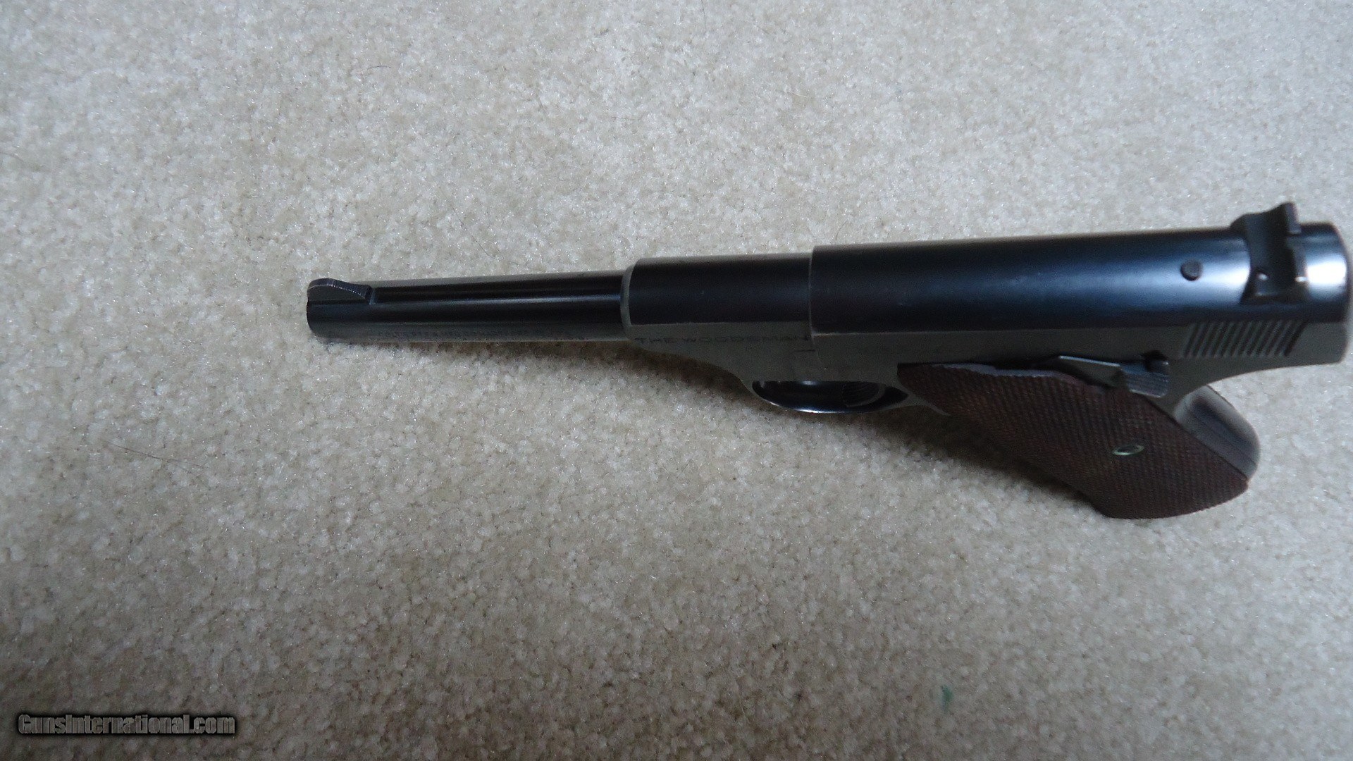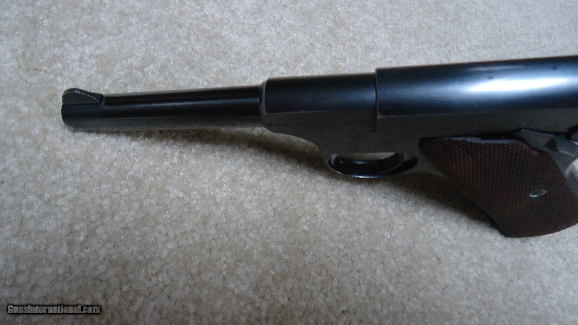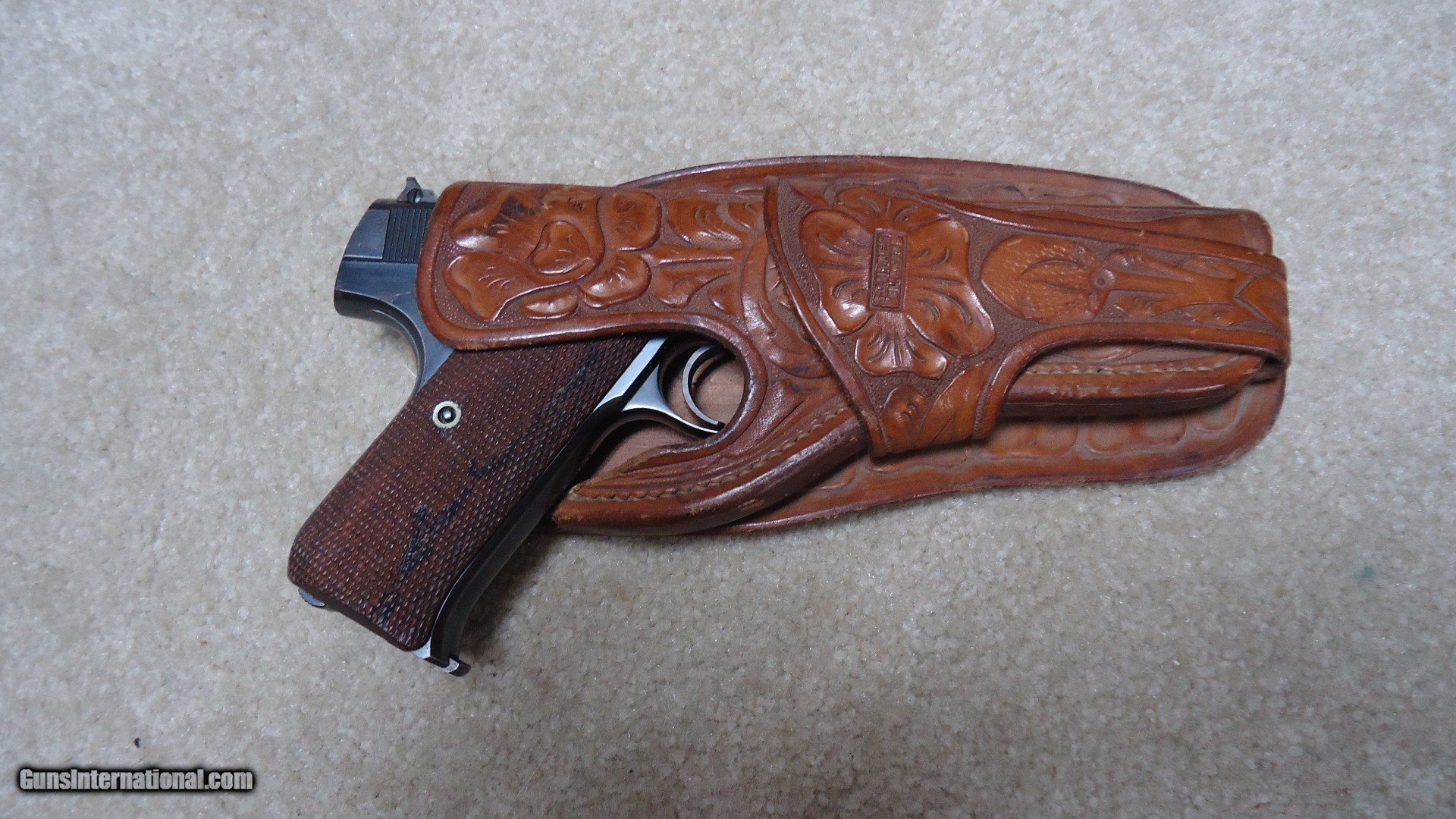 Description: PRE-WAR COLT WOODSMAN .22 AUTO PISTOL, 4 1/2" BARREL, #142XXX, MADE 1940. This pistol comes with a floral carved, western style "S. D. Myers, El Paso" stamped holster in excellent condition. Overall the pistol shows almost all the blue intact with only some light muzzle wear and scattered wear from handling and edge wear that is minor. The rear sight is screw-adjustable for windage, exc. markings and rampant colt stamping on the left side of the frame, the right grip panel has a crack from top to bottom that has been solidly repaired and looks like a dark line, sharp checkering, Colt Woodsman marked magazine, bright bore, very crisp trigger, great holster and wonderful solid feel to these. SOLD Curio/Relic: Yes Handgun Caliber: .22 Long Rifle Manufacturer: C Model: WOODSMAN Serial Number: 142XXX Barrel Length: 4 1/2 Condition: FINE Bore Condition: EXCELLENT |