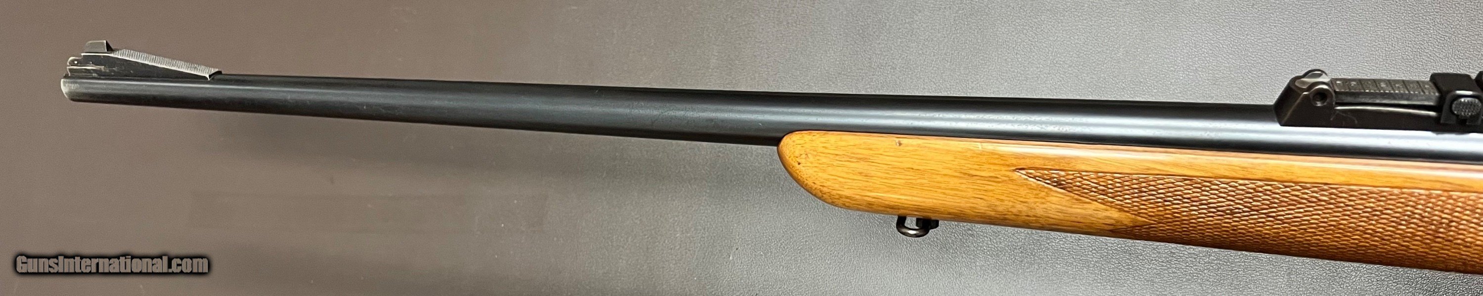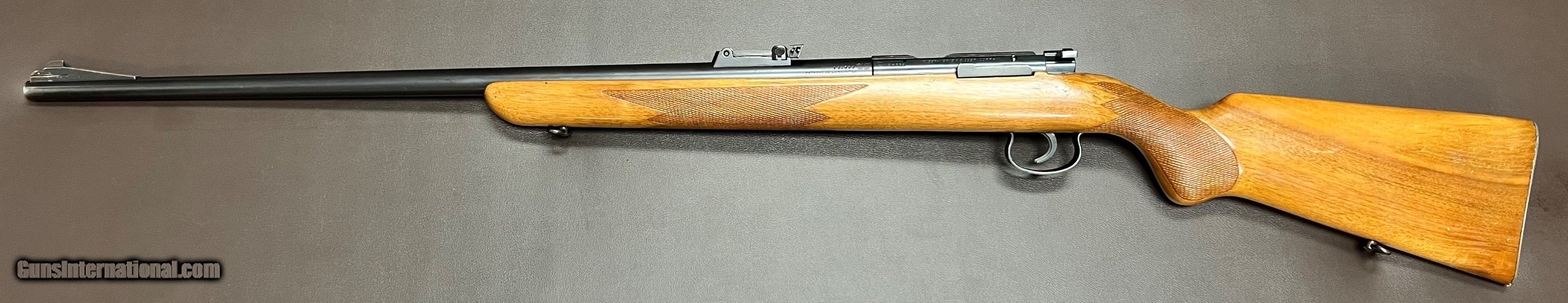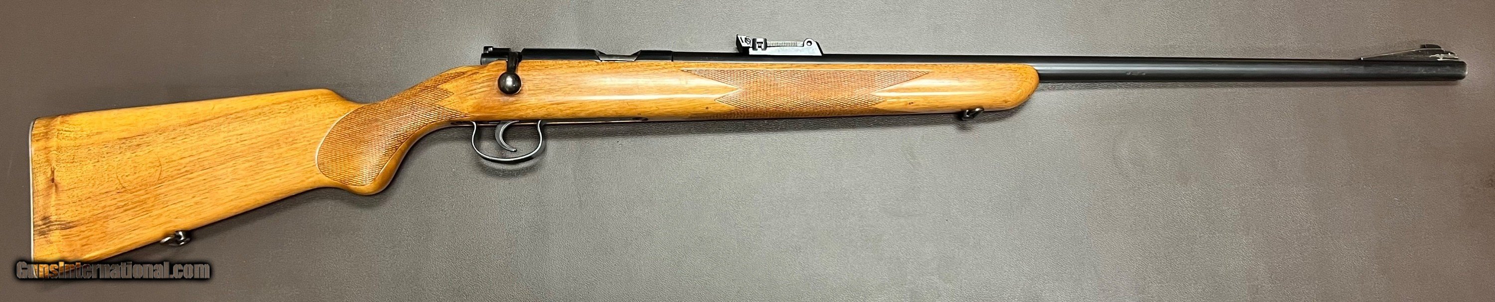 Description: Mauser ES 340 B .22LR single shot target rifle 26.5" heavy barrel with adjustable tangent rear sight (30-200 metres) and ramp front with interchangeable blade Bore is in pristine condition Miniature Mauser action with grooved top for scope mount Two stage trigger with crisp pull Three position safety Sling swivels figured one peice target rifle stock with checkered grip and forend LOP 14 1/8" over Mauser banner buttplate 8lbs 2oz Built in the 1930s Condition: Bluing is in very nice original condition, wood is in excellent refinished condition with added checkering on grip and forend with few minor handling marks. Top quality accurate pre WW2 Mauser .22LR target rifle that shoots as good as anything built today, the grooved receiver makes it so a scope can easily be added to this rifle if preferred. Curio/Relic: Yes Rifle Caliber: .22 Long Rifle Price: $950.00 Buy Now Contact Seller |