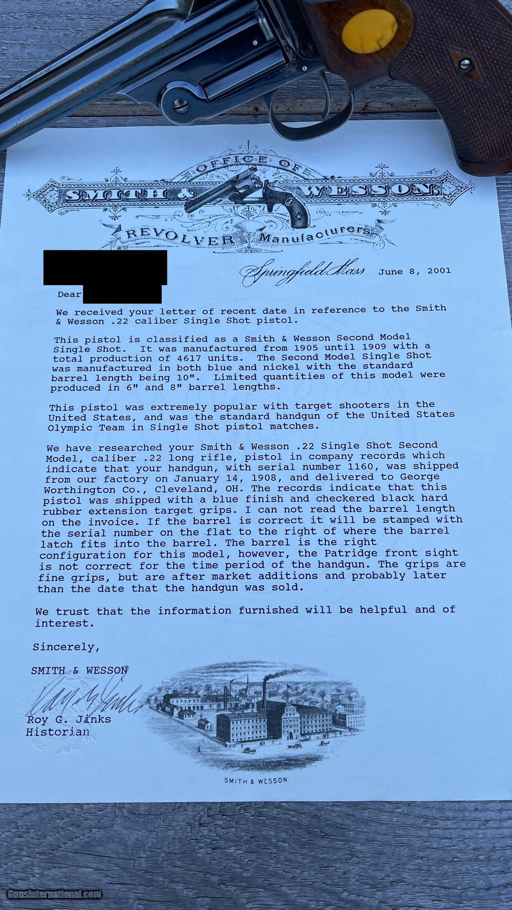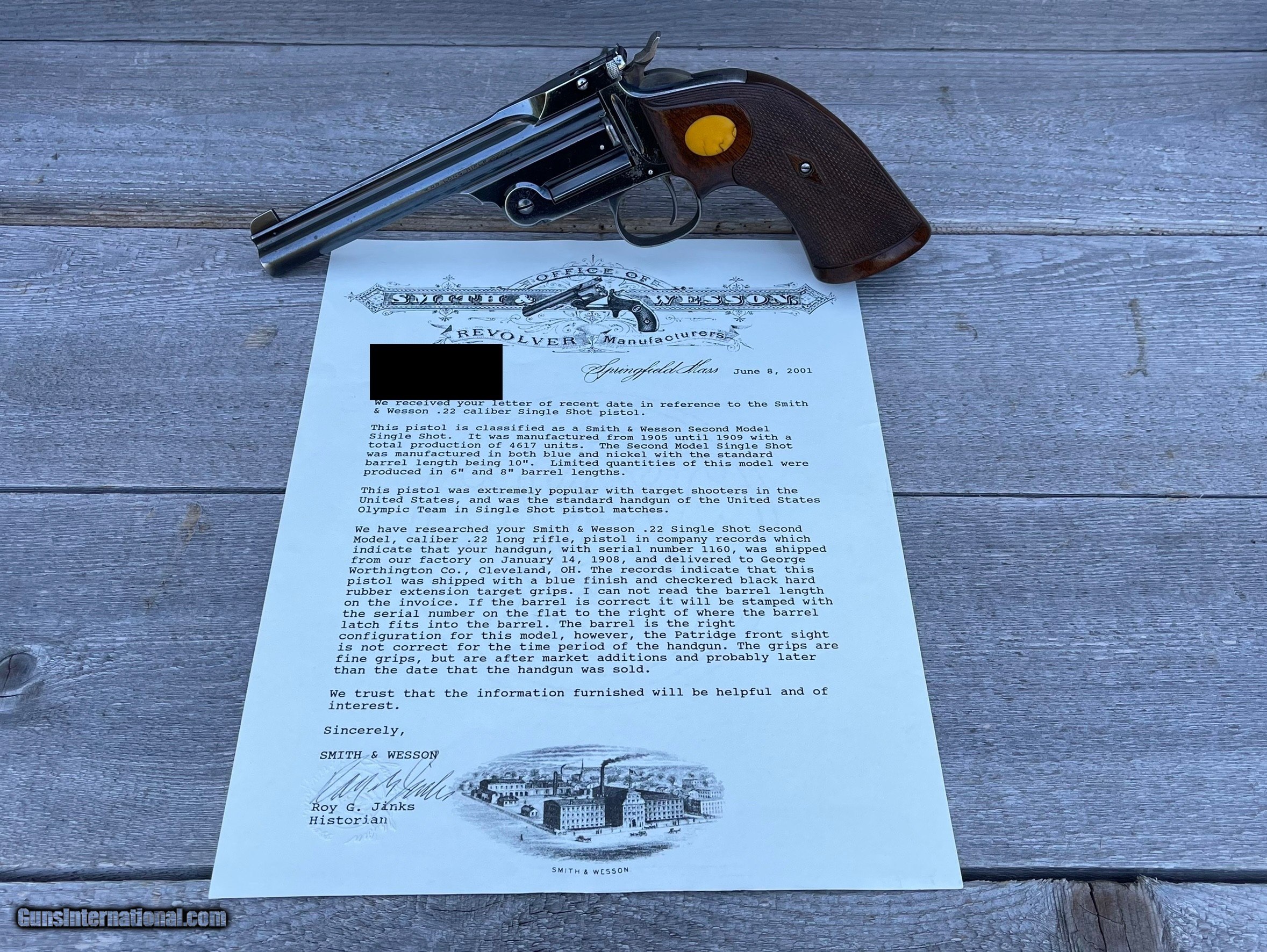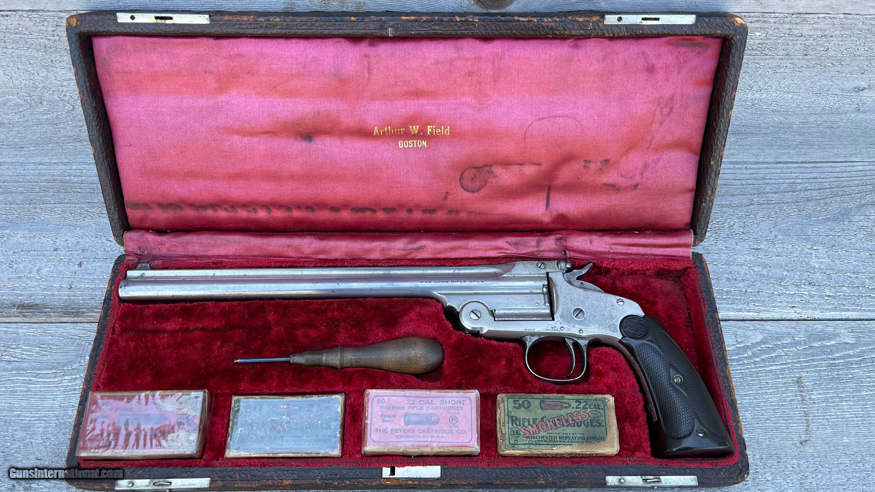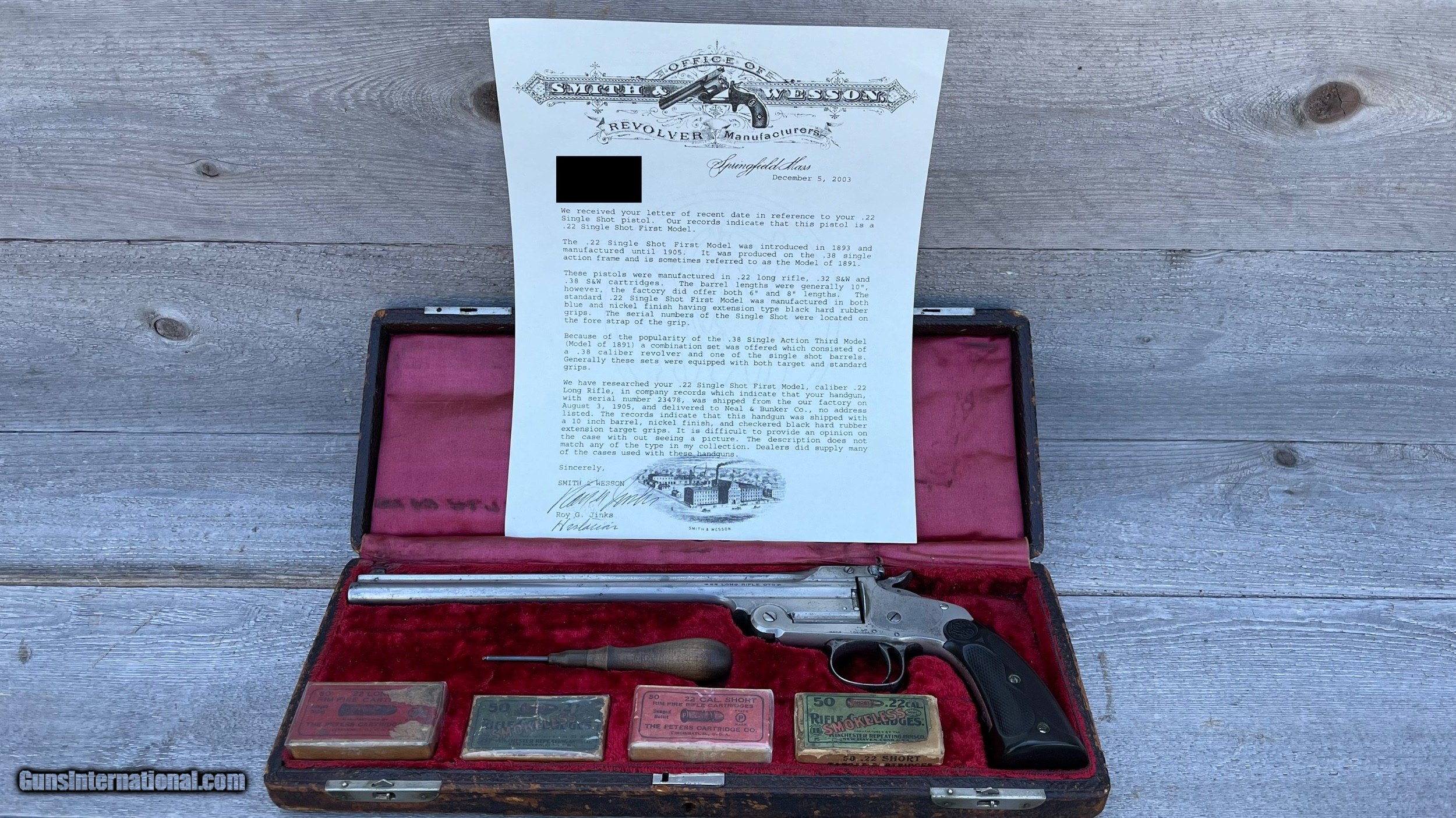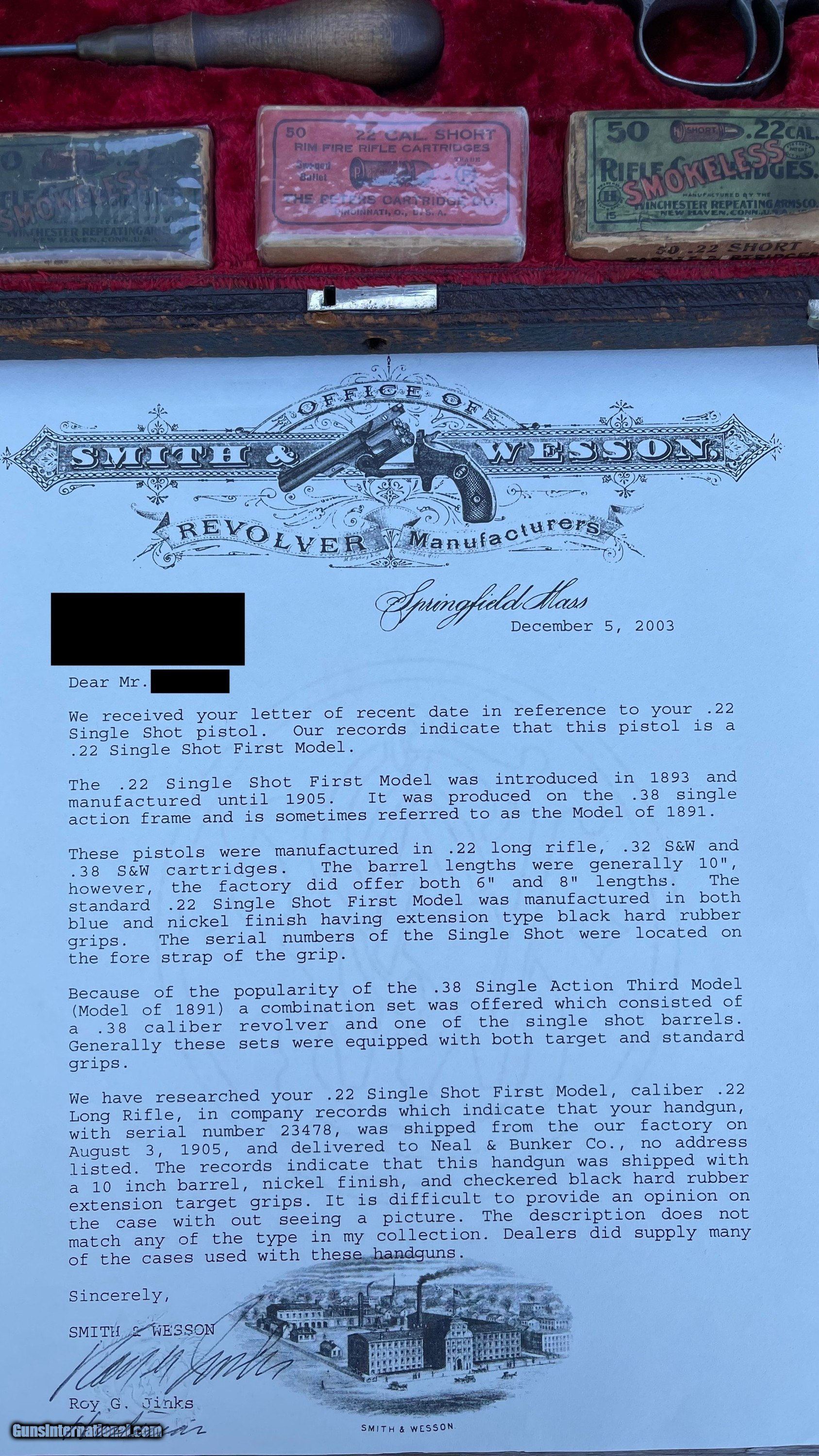 Description: Smith & Wesson Single Shot Model of 1891 .22LR pistols. This set includes the First Model, Second Model and Third “Perfected Model” Pistols. All three come with factory letters from Smith & Wesson historian Roy Jinks. All three have excellent condition bores with plenty of good rifling remaining. They are all matching numbers on the frame, barrel and the barrel latch. 1st Model of 1891 was manufactured in 1905 and is one of 862 manufactured. It has a 10” barrel and comes as pictured with the leather covered oak case, several vintage ammunition boxes (with some ammo in them) and a very hard to find Smith & Wesson screwdriver for adjusting the rear sight. 2nd Model of 1891 was manufactured in 1908 and is one of 4,617 manufactured. It comes with the rare 6” barrel and is in excellent condition. The front sight on this one was upgraded to the “Patridge Sight” either by special order or after purchase. This was an option but it was not recorded in the ledger when it was manufactured. The grips are a period correct aftermarket set that fit the pistol perfectly. 3rd Model of 1891 was manufactured in 1922 and is one of 7,024. This example has a 10” barrel and the rare “Olympic Chamber” as documented in the factory letter. This one is also in excellent condition with the original factory walnut grips. I WILL NOT split this set up. This is for all three with everything pictured. 1. I only accept USPS Money Orders, Cashier’s Checks, Credit Cards and Gun Pay. I do not accept , or use Gun Checkout. 2. I do not offer layaway on any . I am open to reasonable offers and even trades. There is a 3% charge for all credit card sales. The openingand “Buy It Now” prices reflect Cash, Money Order or Cashier’s Check prices. 3. ***TAXES*** If you are a Texas resident I am required to charge 6.75% Sales Tax. Effective January 1st, 2021, Gun is now collecting sales tax in most states. I have no control over this and am required to collect the appropriate Sales Tax. Gun calculates the sales tax amount based on the buyer’s address on file. 4. I am registered with the California Firearms Licensing Center and will ship firearms to California for an additional $10 fee. It is the winning ’s/purchaser’s responsibility to ensure the firearm is legally allowed to be imported into the state. 5. I will accept either a regular FFL or a C&R License (if applicable) for shipping. I will verify whether the firearm is eligible for shipment to a C&R before I ship it. If you are a C&R Licensee, it is your responsibility to contact me prior to to ensure the firearm is eligible. DO NOT ASK ME TO VIOLATE BATF-E REGULATIONS AND SHIP A FIREARM DIRECTLY TO AN UNLICENSED INDIVIDUAL. DOING SO WILL RESULT IN IMMEDIATE REPORTING TO GUN AND TO BATF-E. 6. I will send the winning /purchaser an email with instructions for completing your purchase shortly after the closes, or when you utilize the “Buy It Now” feature. 7. If you choose to pay by Money Order or Cashier’s Check, please make the check/money order payable to the address below. TCRC LLC 1135 CR 1045 Lampasas, TX 76550 8. If you choose to pay with a Credit Card, I will email the winning an invoice through the Square that you can pay securely online. You do not need a Square account and you are not required to download the Square app. 9. If you purchased an item that requires an FFL or C&R, please have your dealer forward a copy to tcrc.propertiesgmail. I will include a copy of my FFL with the shipment for the receiving dealer. 10. If the item does not need to be sent to an FFL, please provide your current mailing address. Often people forget to update their Gun account with their new address. I will mail it either UPS or USPS depending on the shipping cost. 11. I try to be very thorough in my descriptions and photographs. I retain all of the original hi-resolution photos until the winning /purchaser has received and inspected the item. If you need additional photos or need the hi-resolution photos, do not hesitate to ask. 12. I will send only one reminder to complete your transaction after the closes. If you have not contacted me or replied to email/phone communication after 72 hours I will initiate a “Non-Paying ” claim against you in order to recoup my selling and listing fees. I understand that life gets in the way, you may be out of town, etc., etc. If you know in advance you will be unable to arrange payment within that time frame, please email me. I will work with you within reason. 13. If you have any further questions, feel free to email me at tcrc.propertiesgmail. SOLD Curio/Relic: Yes Handgun Caliber: .22 Long Rifle Manufacturer: Smith & Wesson Model: 1891 |