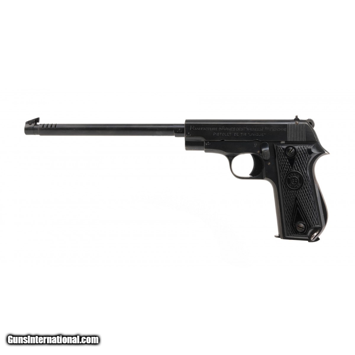 French made semi-auto target pistol with 9.75"" compensated barrel. Made by "" D'Armes Des Pyrenees."" The pistol is marked ""Pistolet De Tir Unique."" Grips are excellent. The pistol has 98% of its original factory blue. This is the only competition/target Unique we have ever seen and it is in excellent condition.