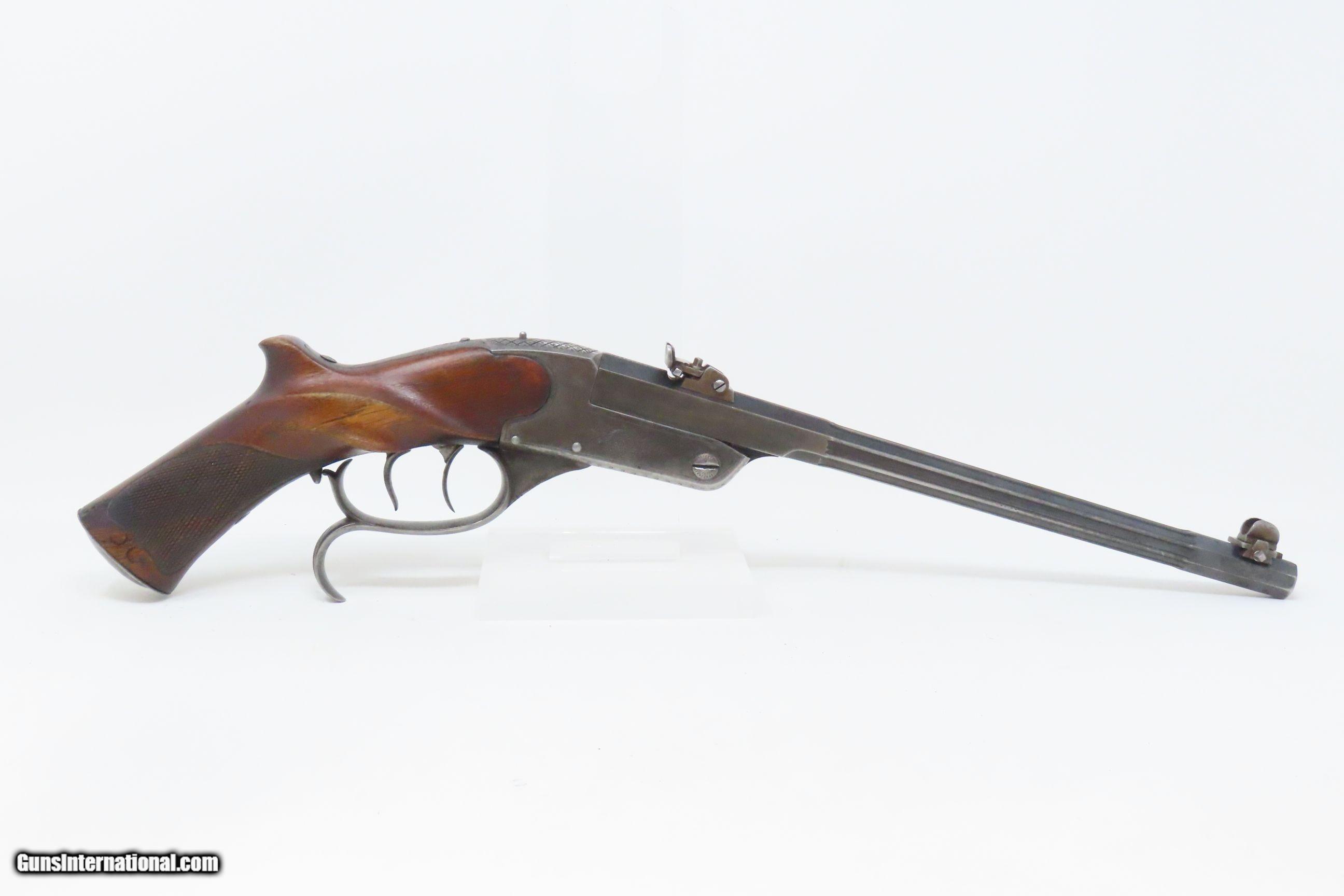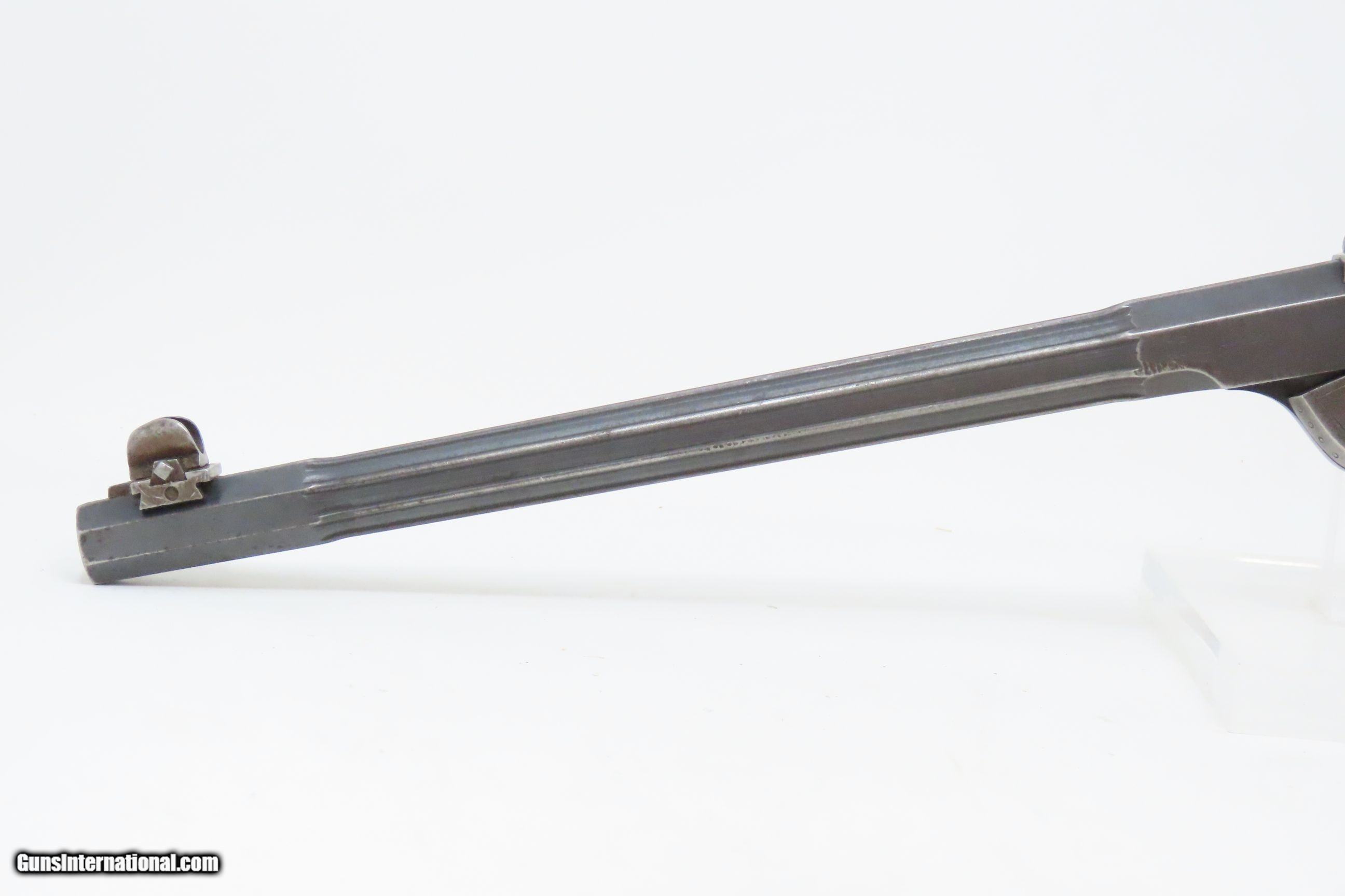 Description: European GERMAN Proofed “D.R.G.M.” Marked .22 Single Shot C&R TARGET Pistol With DOUBLE SET TRIGGERS and LIGHTLY ENGRAVED Here we present a C&R European German Proofed “D.R.G.M.” Marked Target Pistol made circa the turn of the century in mainland Europe. This pistol’s mechanism involves using the spurred trigger guard to open the action. It is fitted with adjustable target sights and a double set trigger. This was a 20th Century copy of the Stevens Tip-Up series of pistols, which originated circa 1864, during the American Civil War. This pistol features an 11-inch barrel with a hooded front sight. These were a delight to shoot with their affordable ammunition, nice balance, and crisp trigger. The “D.R.G.M.” marking on the frame stands for “Deutsche Reich Gebrauch Muster”, or “German Reich License for Use”. This is a single shot target pistol with a tip up barrel activated by pushing the trigger guard forward to open and load. The rear target sight is adjustable and similar to the ones found on the Stevens single shot pistol and has a hooded front sight. The overall condition is fine. Original finish. The bore is in good shape with a lightly frosted appearance. Solid grip with sharp checkering. Legible markings. Pleasing light engravings. This firearm is classified as a Curio & Relic. Barrel is 11 inches. Caliber: .22 Long Rimfire Overall condition as seen in photos. Very Fast. Very Safe. FREE SHIPPING. Will need to be sent to your local FFL or C&R licensee. This firearm is classified as a Curio & Relic. Guaranteed AUTHENTIC & Includes CERTIFICATE OF AUTHENTICITY. ancestryguns $1200 #230381 SOLD Curio/Relic: Yes |
