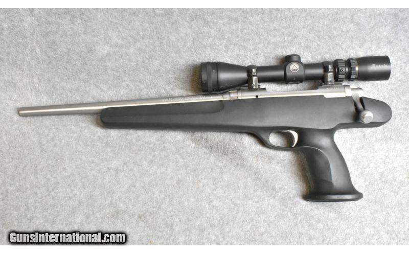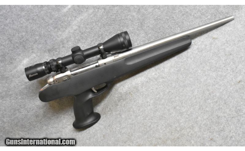 Description: Savage 516 bolt action pistol in .308 Win. with Burris Handgun 3-12x32 scope. SOLD Caliber Info: .308 Win. Metal Condition: Very good, a few scratches on barrel. Bore Condition: Clean with bright lands. Barrels: 14 inch stainless. Triggers: Single curved trigger. Stock: Synthetic grip. Weight: 106 oz. Sights: Burris Handgun 3-12x32 Scope. Item Location: Kansas City, KS |