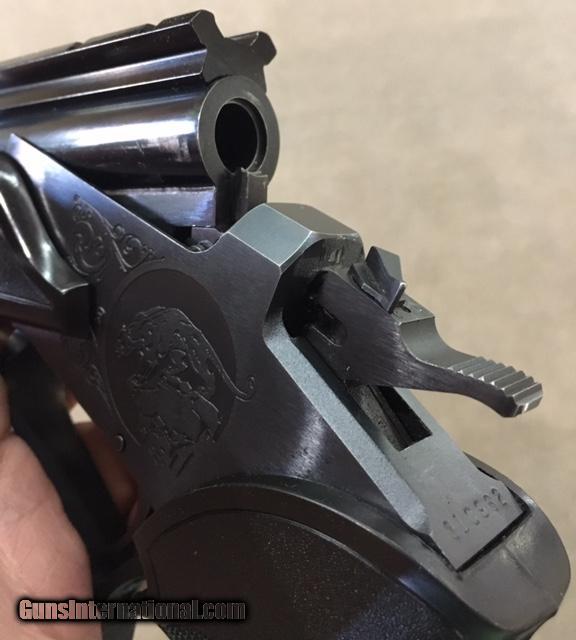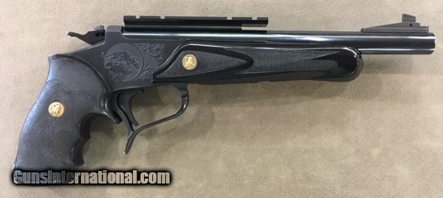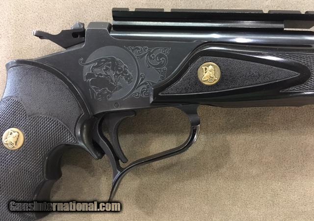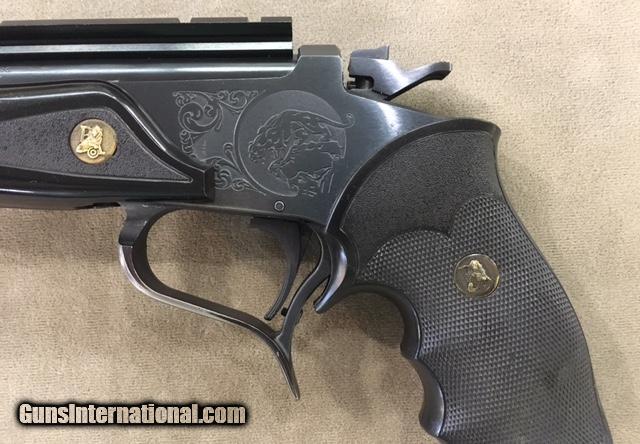 Description: REDUCED - An early Thompson Center Contender Pistol with 10 Inch round barrel in .44 Magnum caliber. Pistol is in excellent overall condition including the Pachmayr forearm and pistol grip. Bore and chamber are perfect. Barrel is equipped with a front sight and a weaver base for scope mounting. Barrel is marked Super 14 but is only 10 inches in length. I'm told that T/C cut down some Super 14 barrels in this manner because they were over inventoried and needed 10 inch barrels, and the marking remained. SOLD |