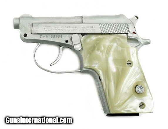 Description: Beretta 21A .25 ACP caliber pistol. Tip Up model with custom silver finish in excellent condition.