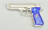 Beretta 92 FS 9mm caliber pistol. Customized with bright nickel finish and fancy grips.