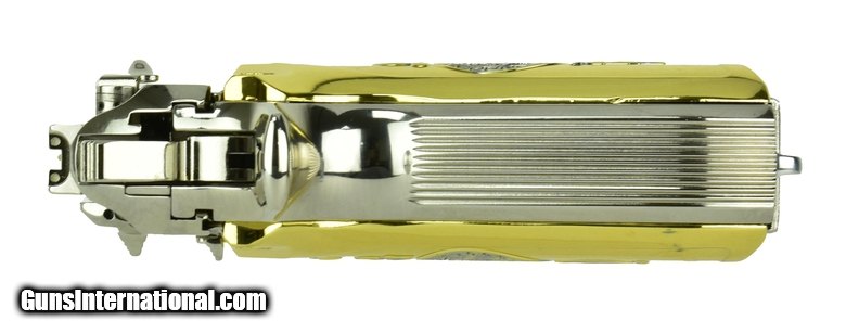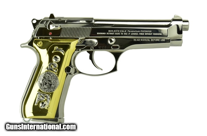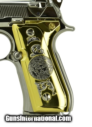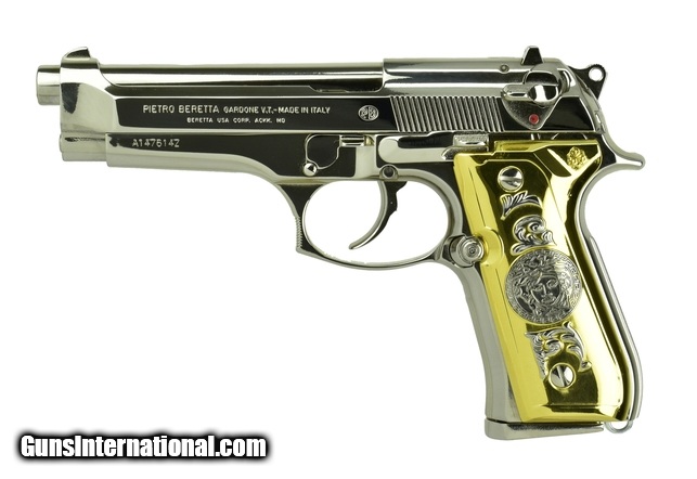 Description: Beretta 92FS 9mm caliber pistol. Customized with nickel finish and fancy grips.