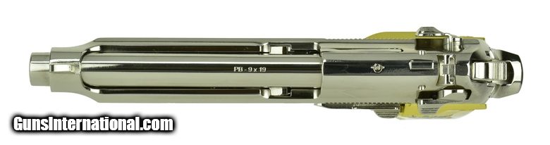 Beretta 92FS 9mm caliber pistol. Customized with nickel finish and fancy grips.