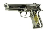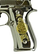 Description: Beretta 92FS 9mm caliber pistol. Customized with nickel finish and fancy grips.