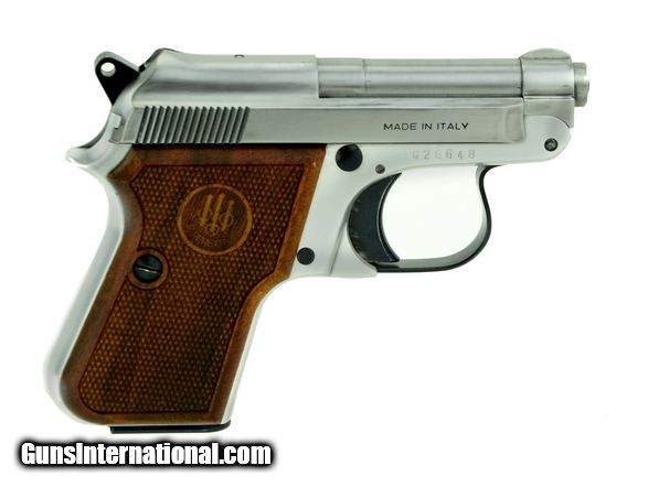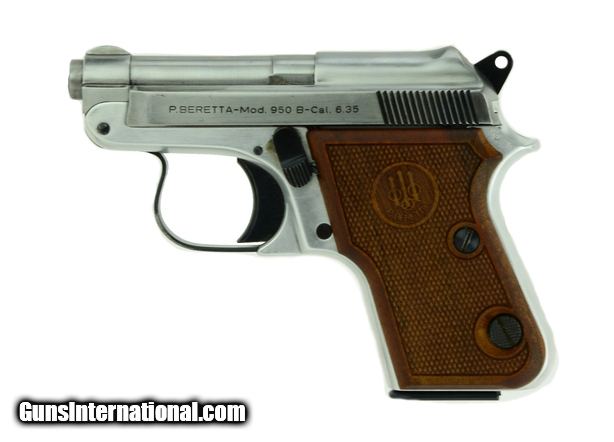 Description: Beretta 950 B .25 ACP caliber pistol. Italian made pocket pistol. Has silver finish and wood grips. Very good condition.
