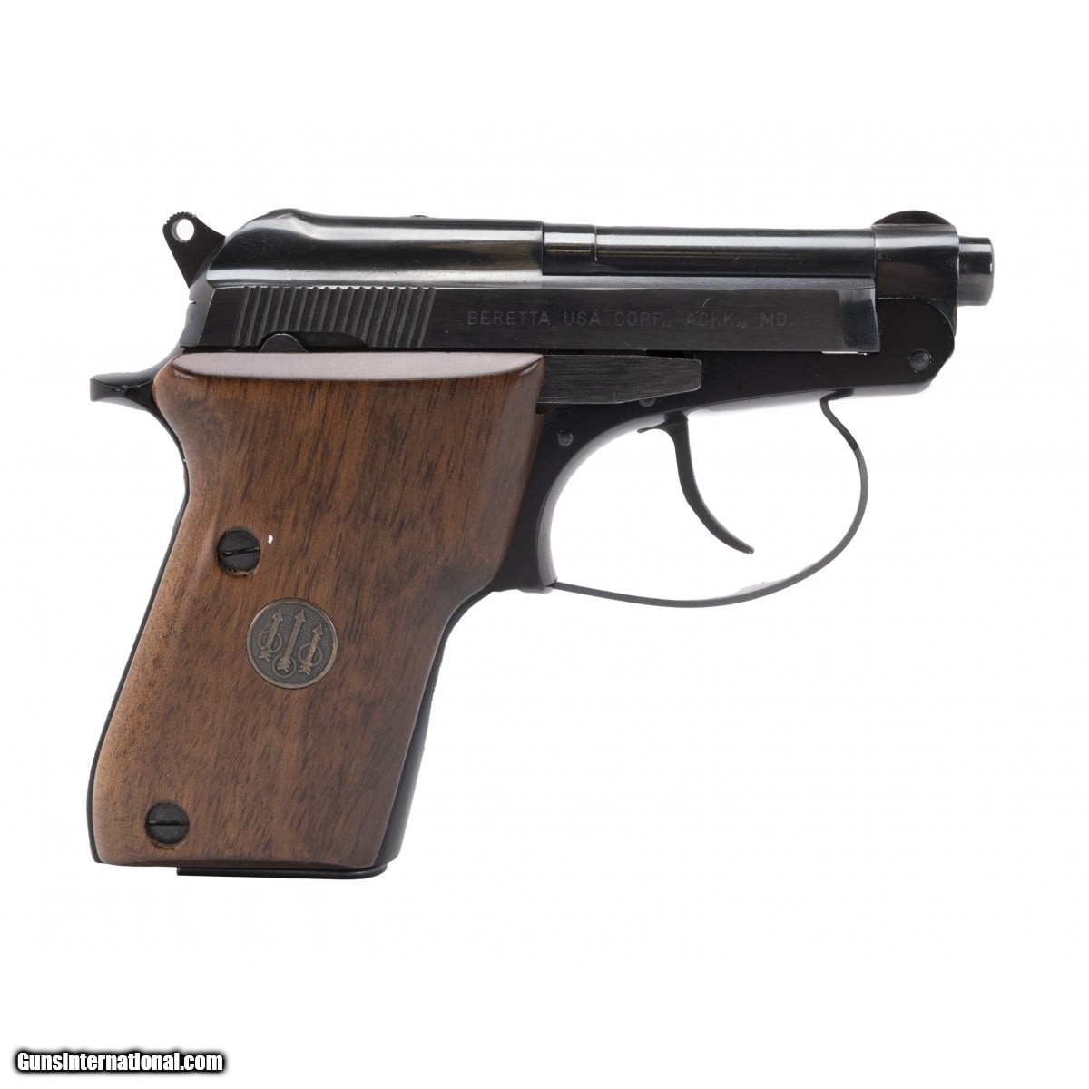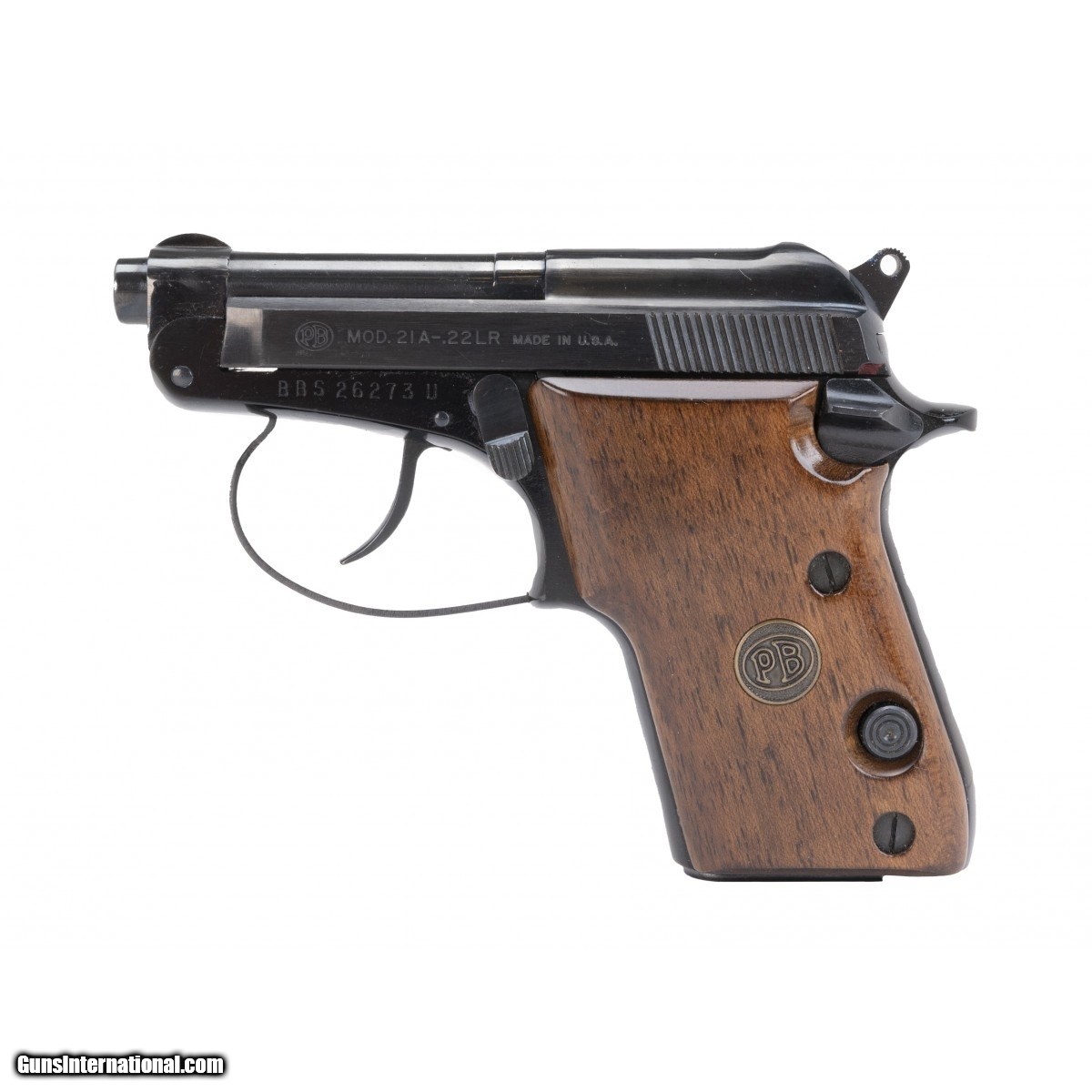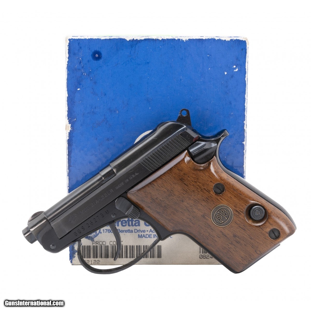 Description: " Beretta 21A .22 LR caliber pistol. Pocket pistol with tip-up barrel, polished blue finish and wood grips. Excellent condition with box. SOLD |