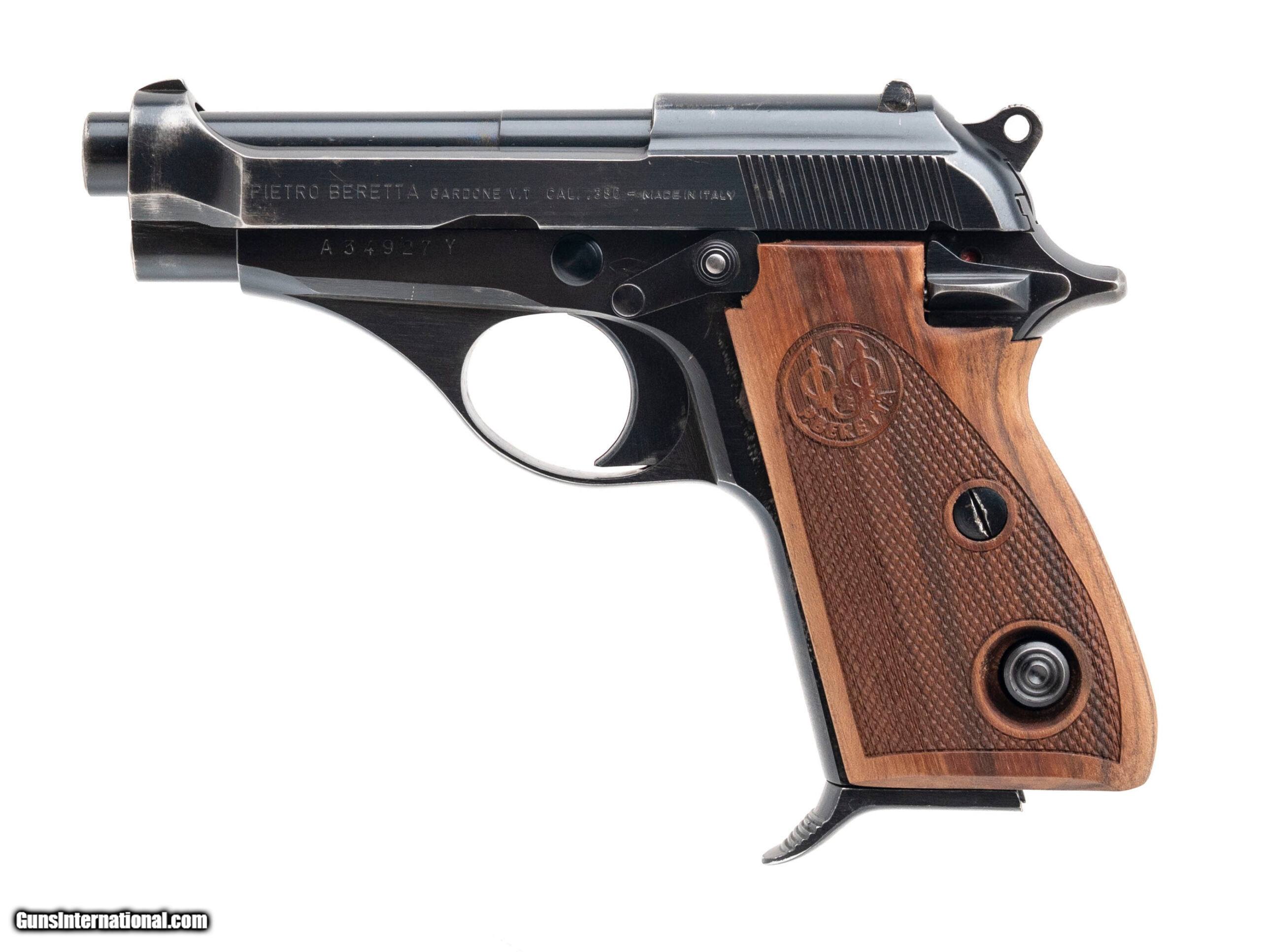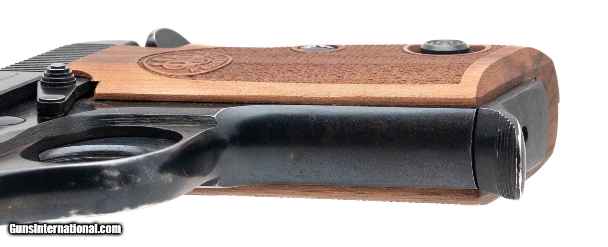 Description: "SN: A34927Y. Made in 1981, .380ACP with a 3.5"" barrel. Bore is excellent. Semi-auto compact pistol with manual thumb safety, blued finish, and checkered wood medallion grips. Finish is worn with minor marks throughout with about 90% of original bluing intact. Overall condition is very good. SOLD |