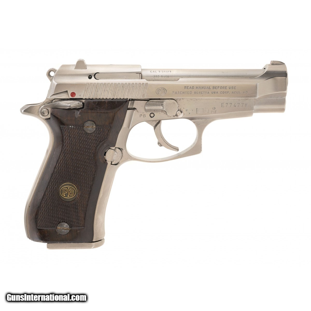 Description: " SN: E77477Y. Made circa 1981, 9mm Short (.380ACP, 3.8"" barrel. Factory nickel compact double action pistol with 92% of its finish. The bore is excellent and the wood grips are very good with minor handling wear. Overall very good condition. SOLD |