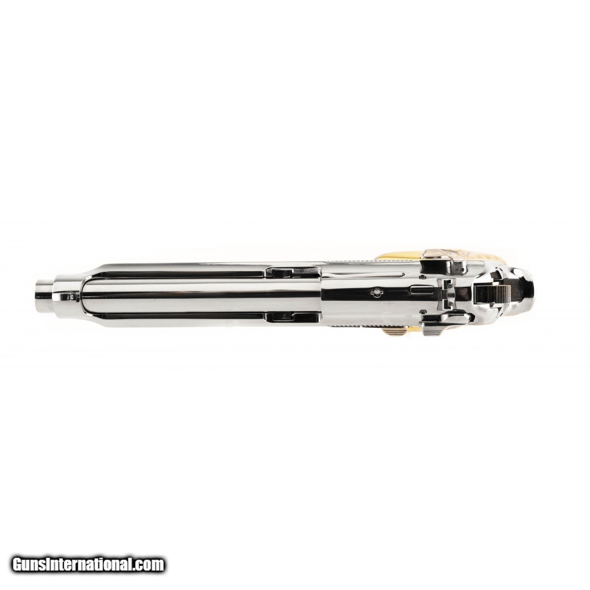 Description: " Customized Beretta pistol with bright nickel finish and beautiful silver and gold plated grips. Excellent condition. SOLD |