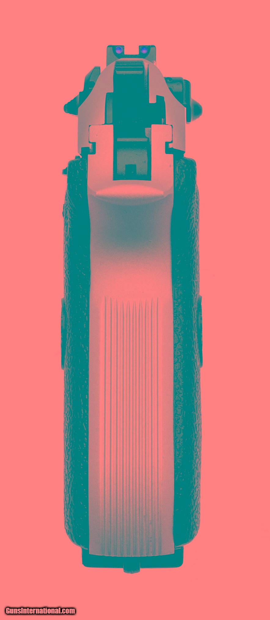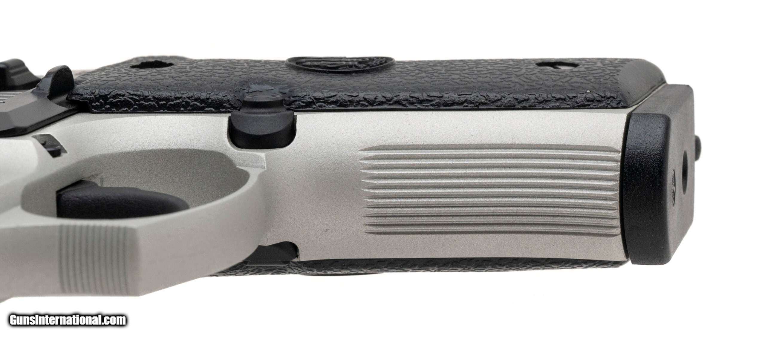 Description: "SN: A344794Z. Modern production, 9mm with a 4.89"" barrel. Bore is bright with strong rifling. Alloy frame double action pistol with three dot red sights. Stainless steel is in excellent condition. Rubber grips are in excellent condition. Comes with case. SOLD |
