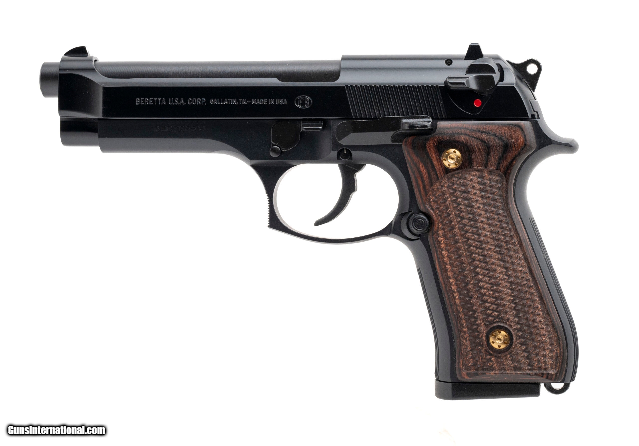 Description: "SN: BER795514. Modern production, 9mm with a 4.9"" barrel. Bore is in excellent condition. Full size aluminum frame double/single action semi-auto pistol. Blued finish is in very good condition. Upgraded checkered wood grips are excellent. Overall condition is near excellent. Comes with case, original grips, and an extra magazine. SOLD |