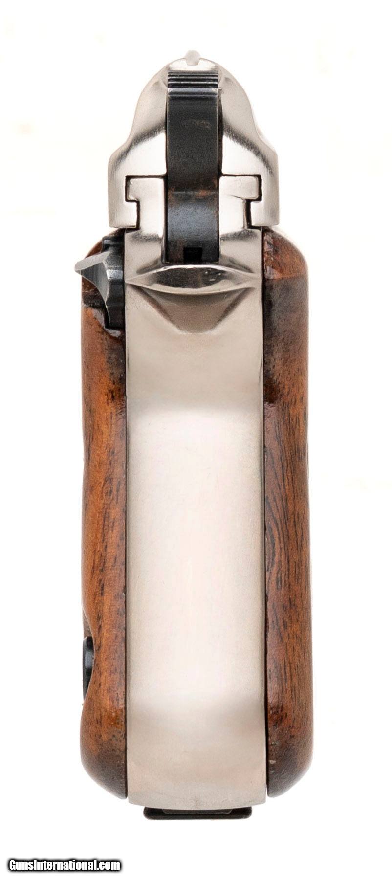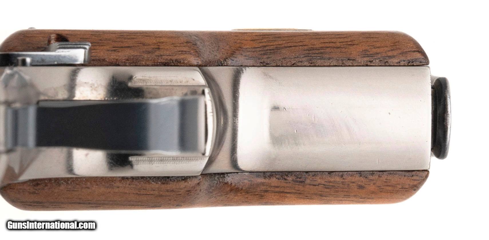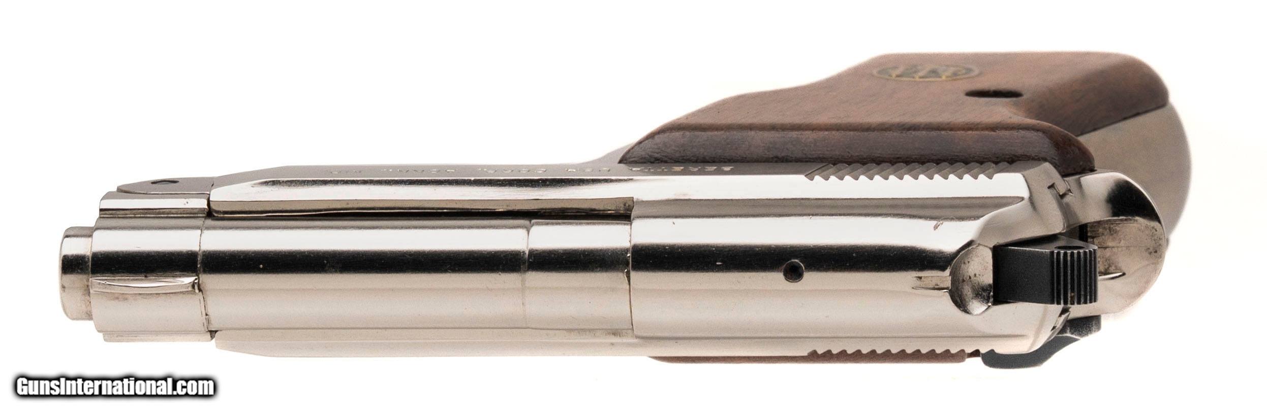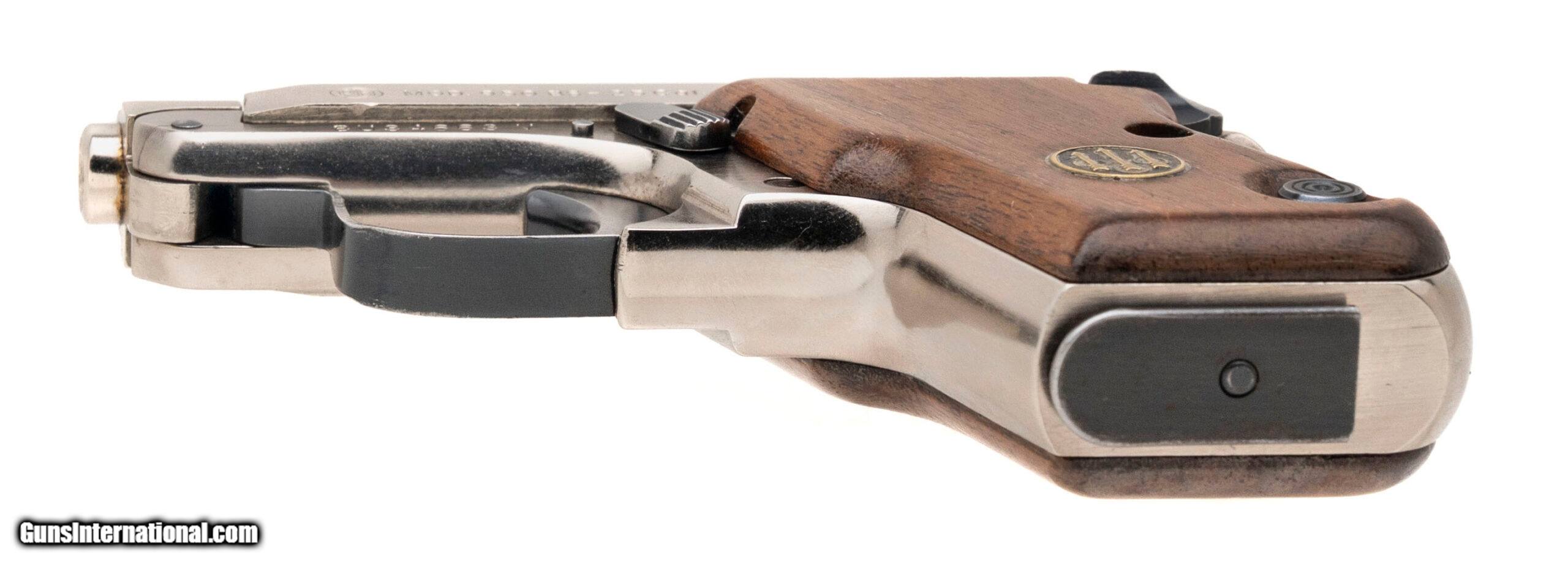 Description: "SN: BU34663V. 1990s vintage, .25 auto with a 2.5"" tip-up barrel. Bore is excellent. Single-action pocket pistol with manual thumb safety, nickel finish, and wood medallion grips. Finish shows light wear, overall condition is very good. SOLD |